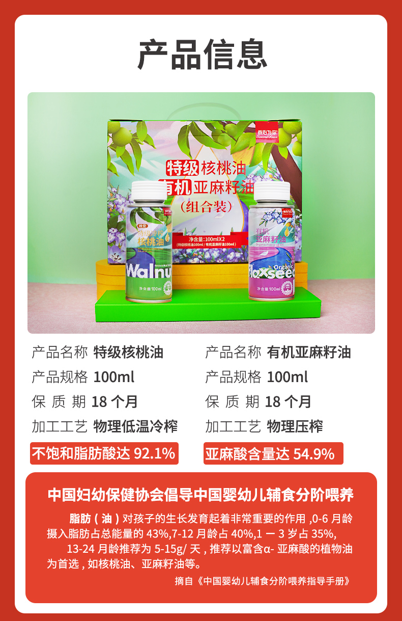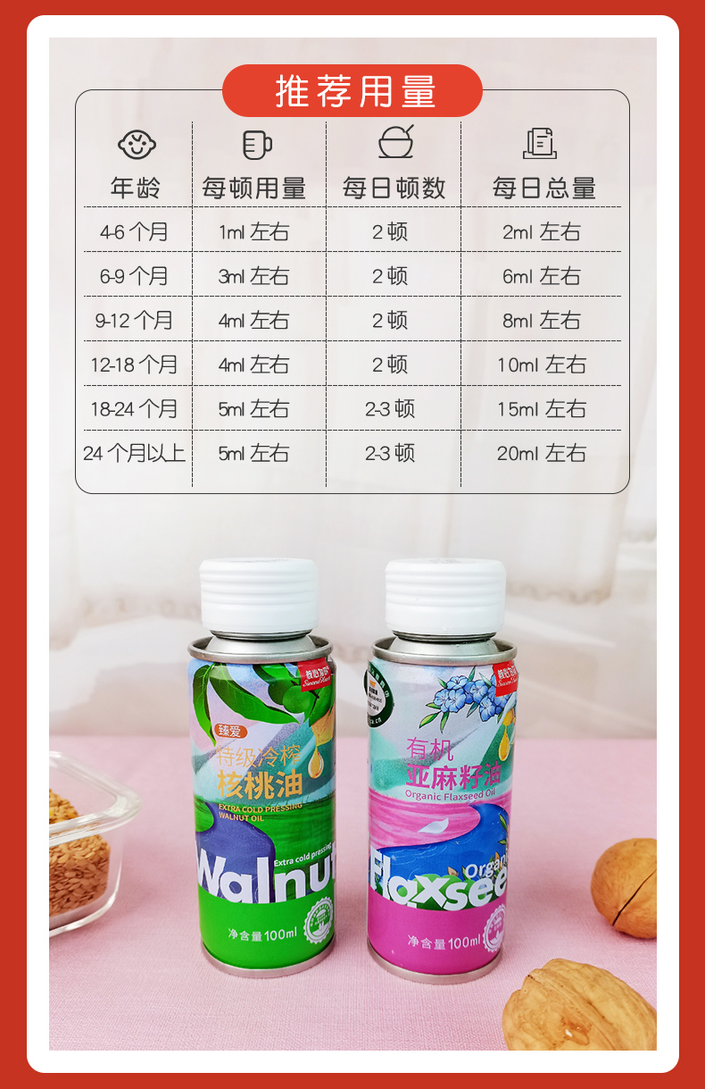 核心为你旗舰店,特级亚麻籽油100ml19.9元 双项有机认证,高亚麻酸含量,补充DHA,补充脑部营养发育,物理低温冷榨,无苦味,适合宝宝味蕾。促进大脑发育,提高宝宝免疫力,呵护宝宝成长~【赠运费险】
