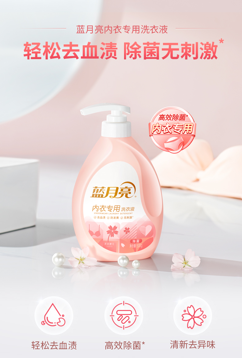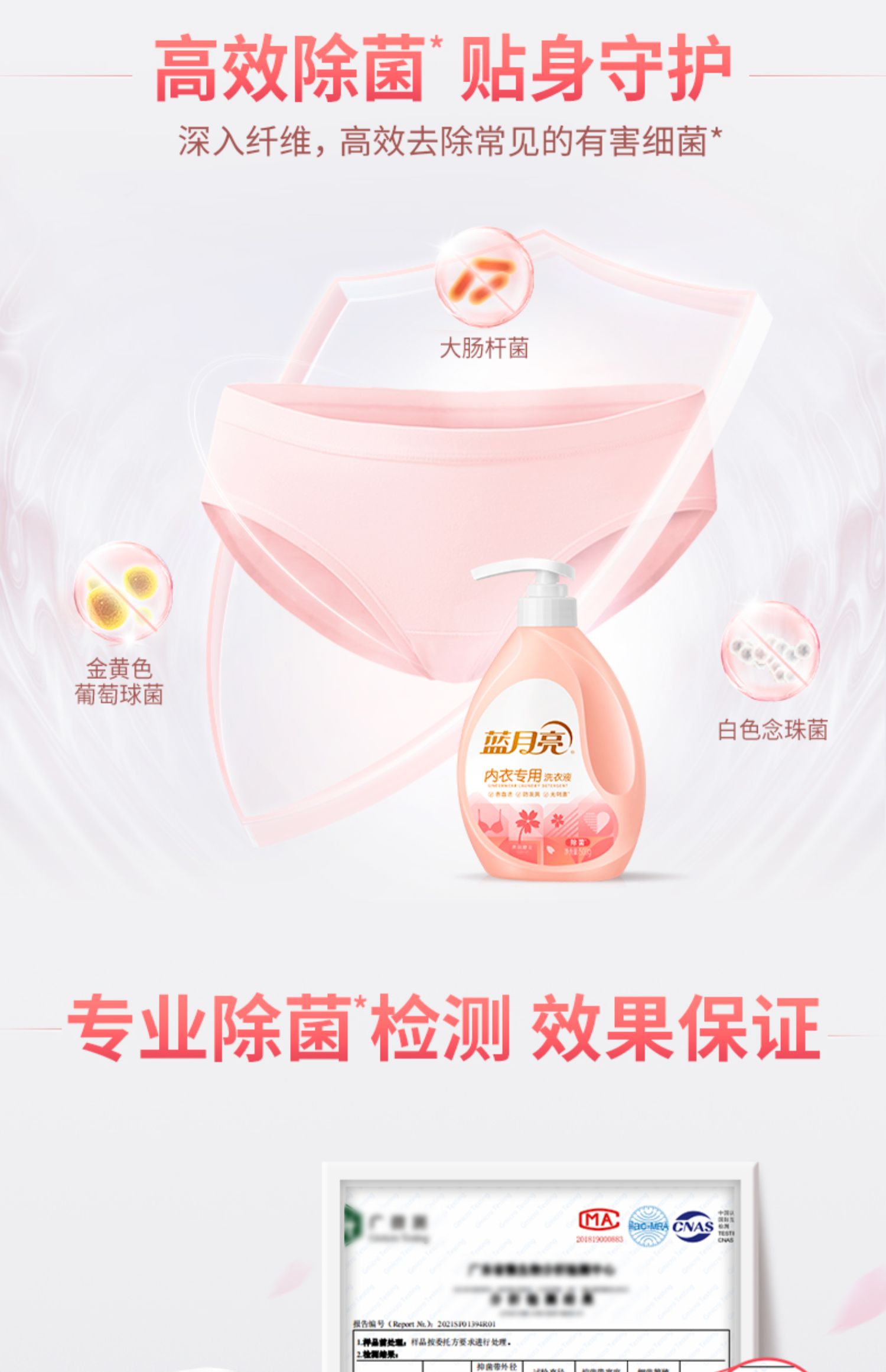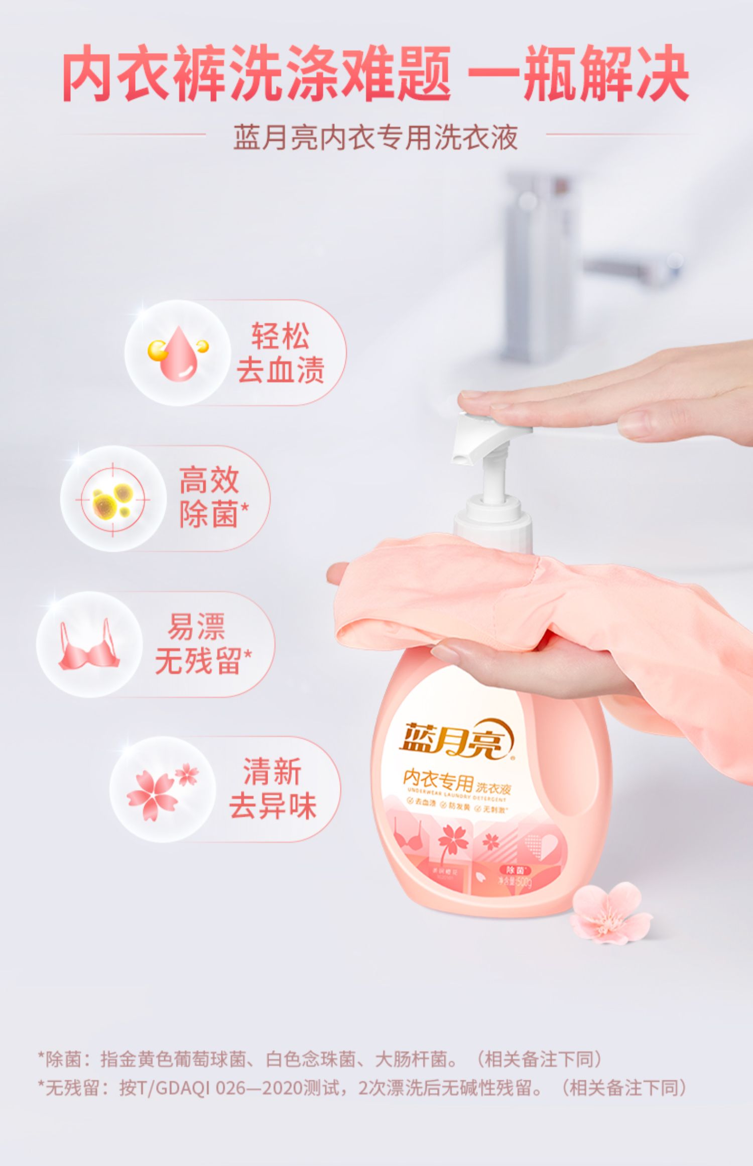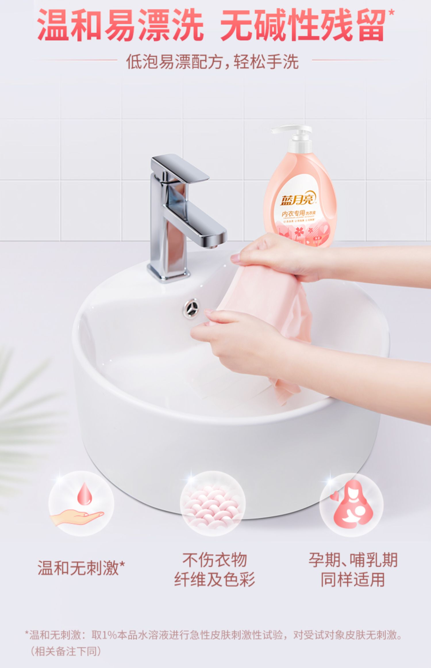 内衣裤难题,一瓶解决~蓝月亮内衣专用洗衣液!含洁净因子+活性酶, 深层去血渍、分泌物等污渍,温和无刺激,低泡易漂洗,高效除菌,贴身守护你的私处健康!