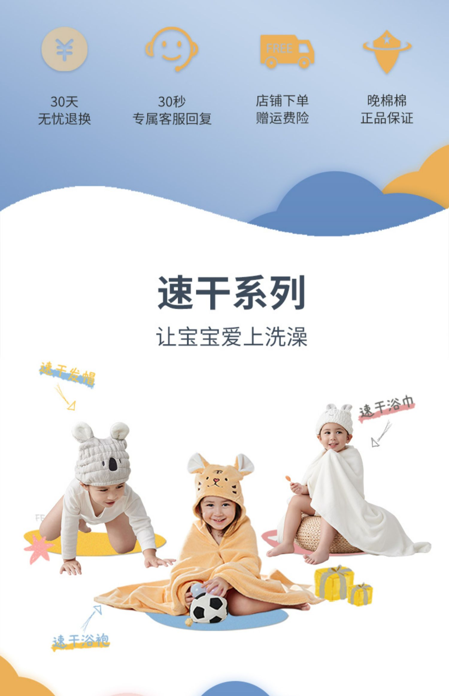 到手仅需29.9元!晚棉棉婴儿速干浴巾,可爱超强吸水,解放双手,蓬松柔软的珊瑚绒,正反两面可用,快速吸水,留下温暖,让宝宝爱上洗澡。