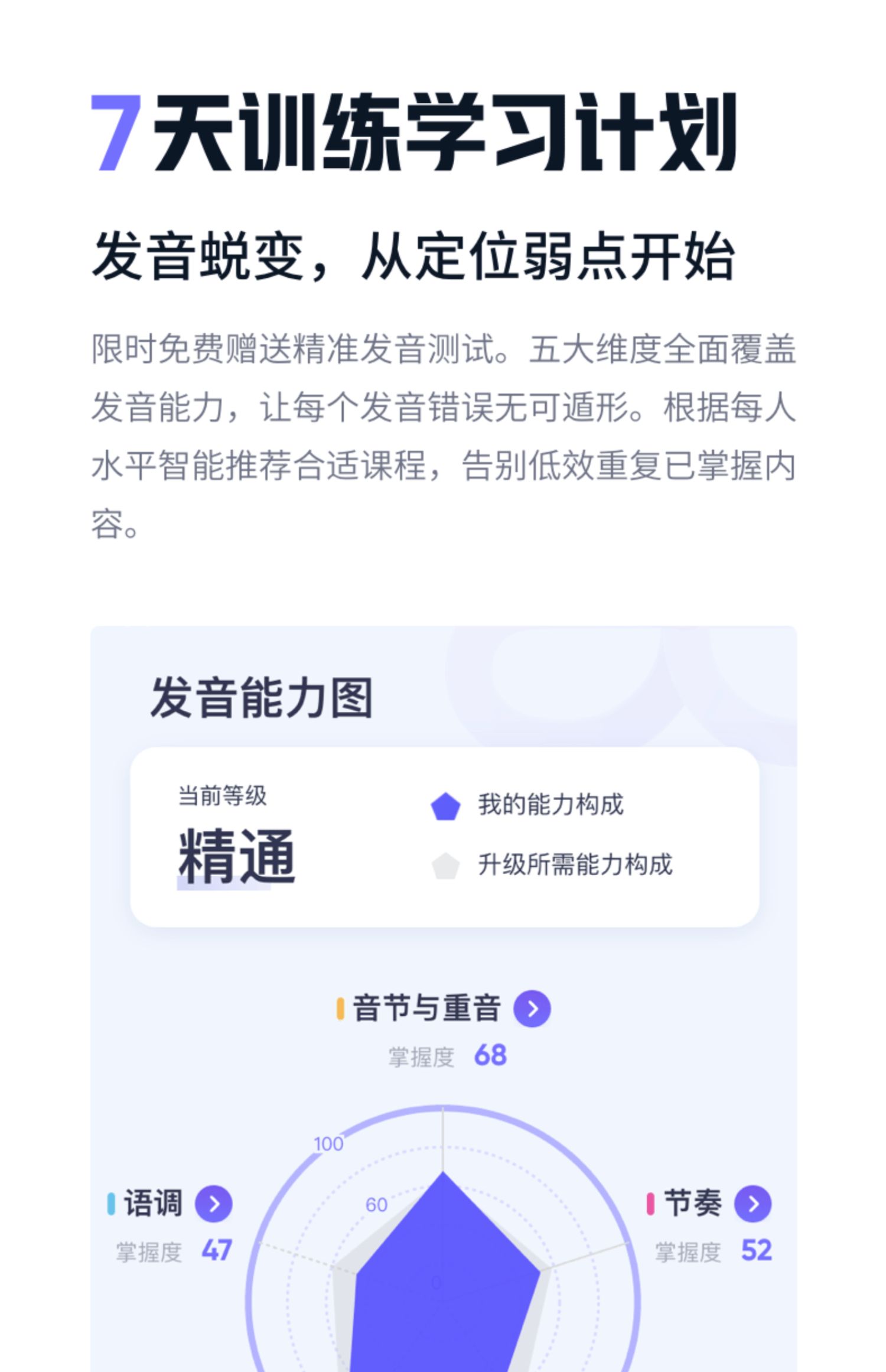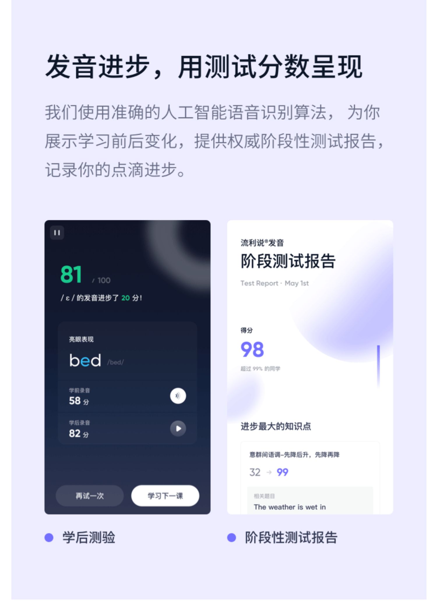 英语流利说口语发音AI训练学习网课,发音蜕变,从定位弱点开始,使用准确的人工智能语音识别算法,记录你的点滴进步。