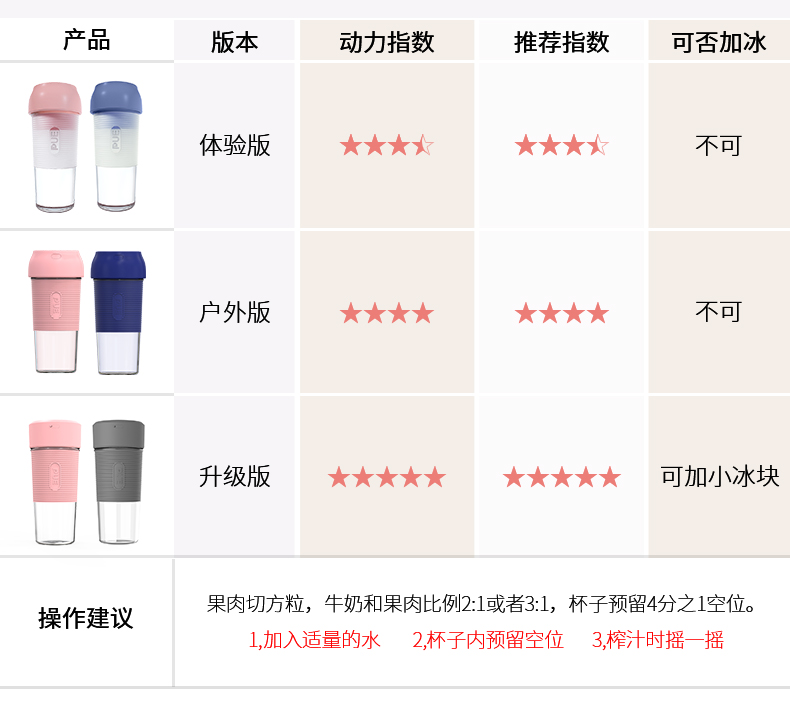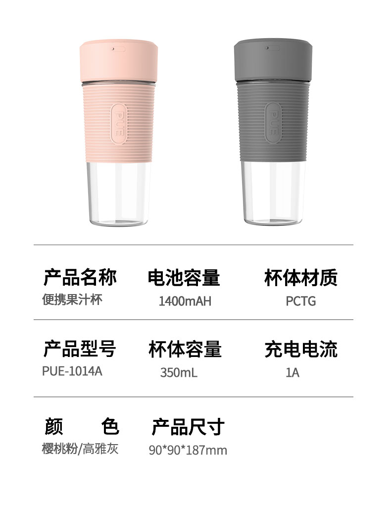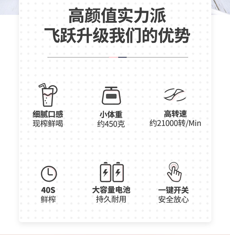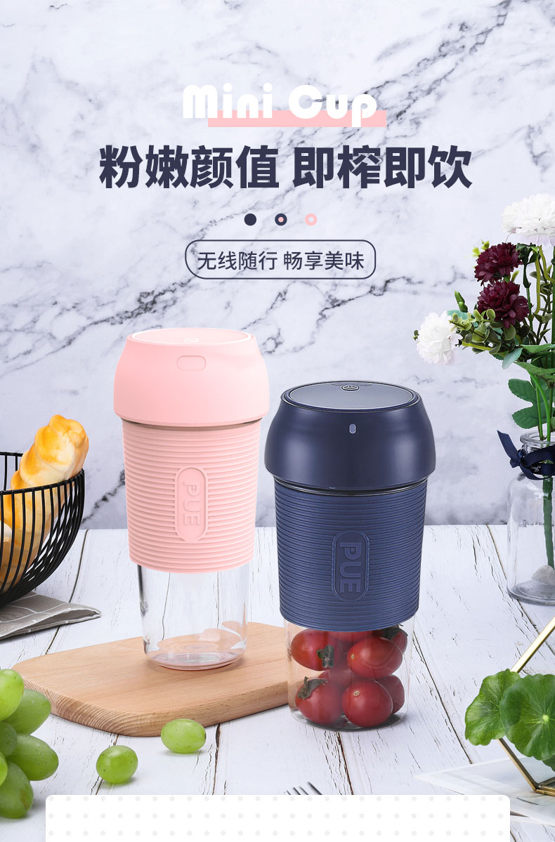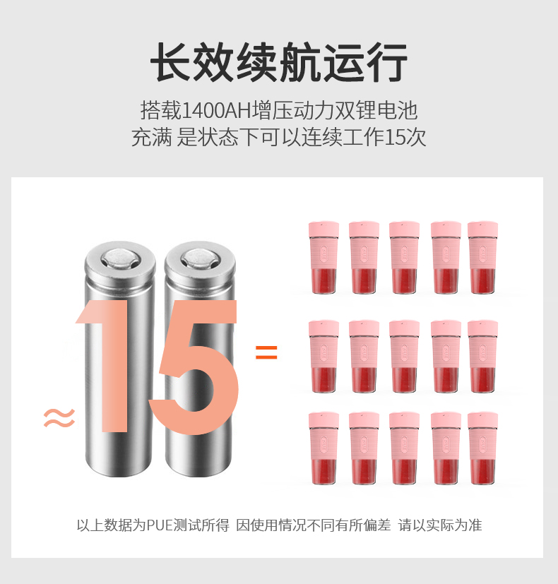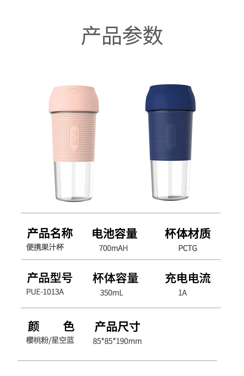 【火爆大卖,天猫促销,1年免费换新】搅打彻底,食品级材质的杯体,不爆裂,耐摔耐撞,一次充电约可榨10杯,长按两秒启动,快速榨汁,口感细腻顺滑