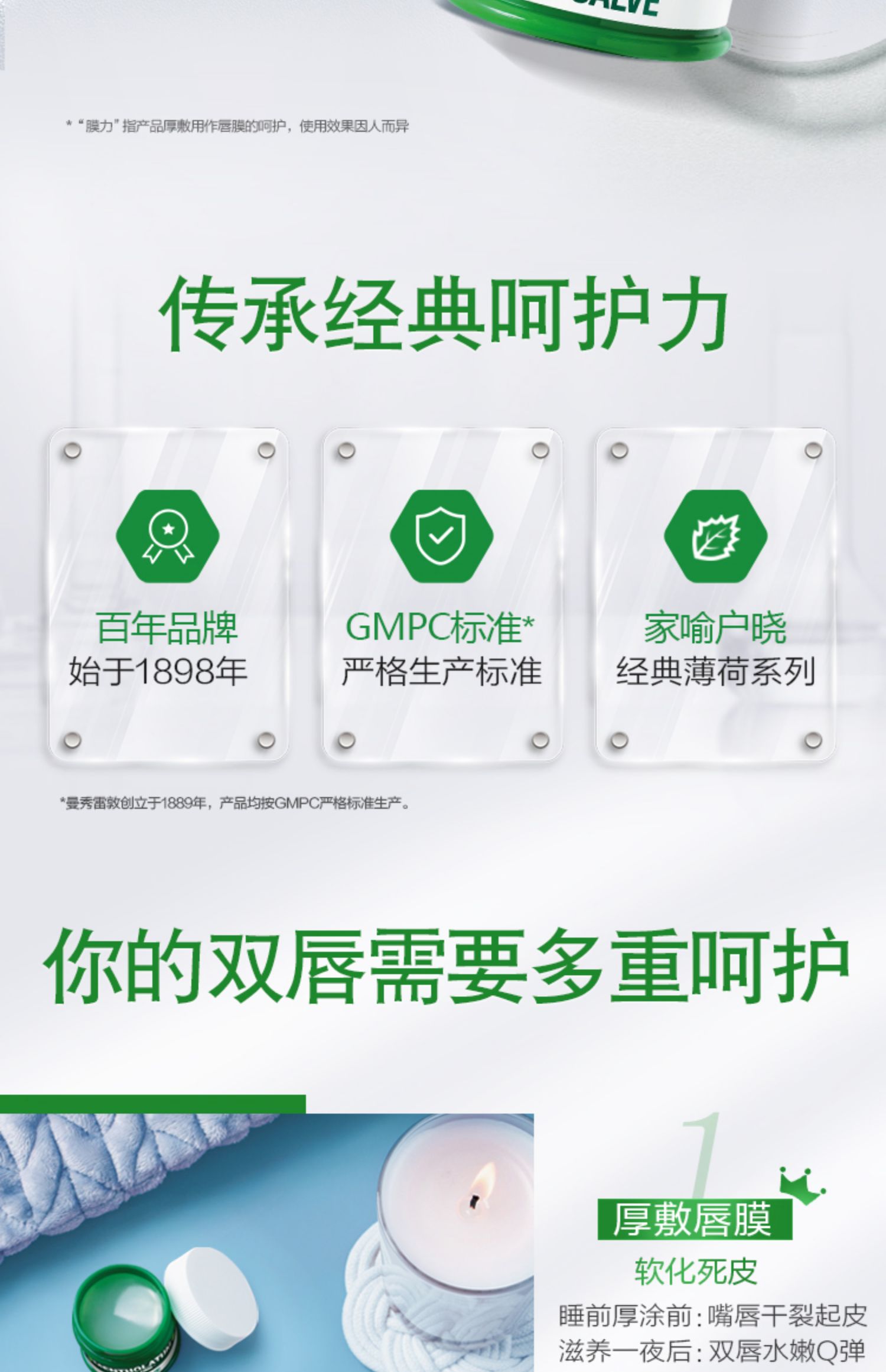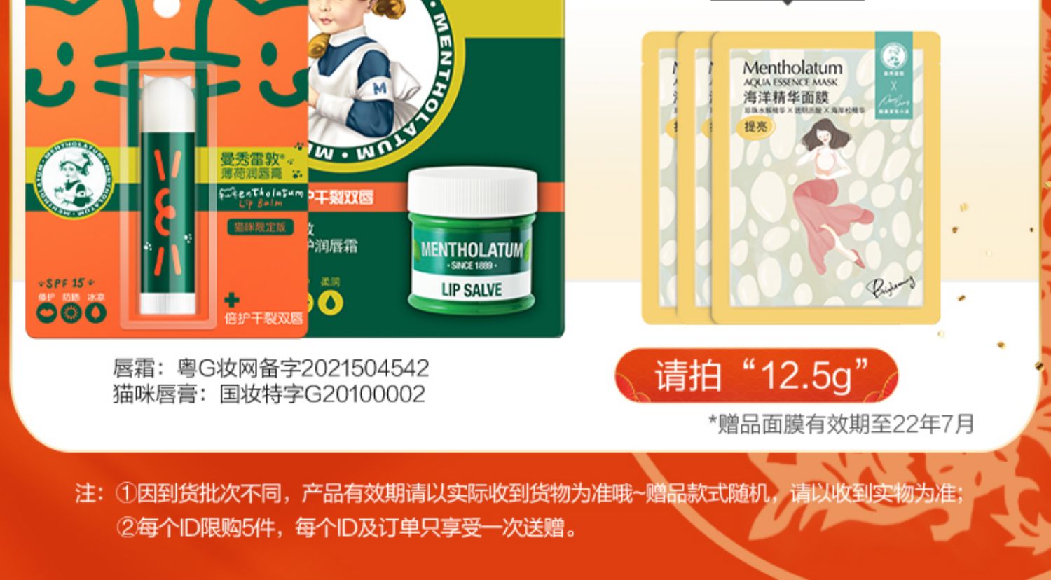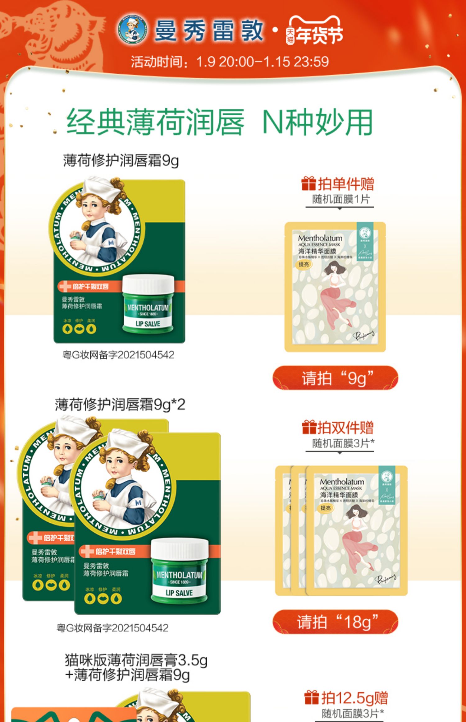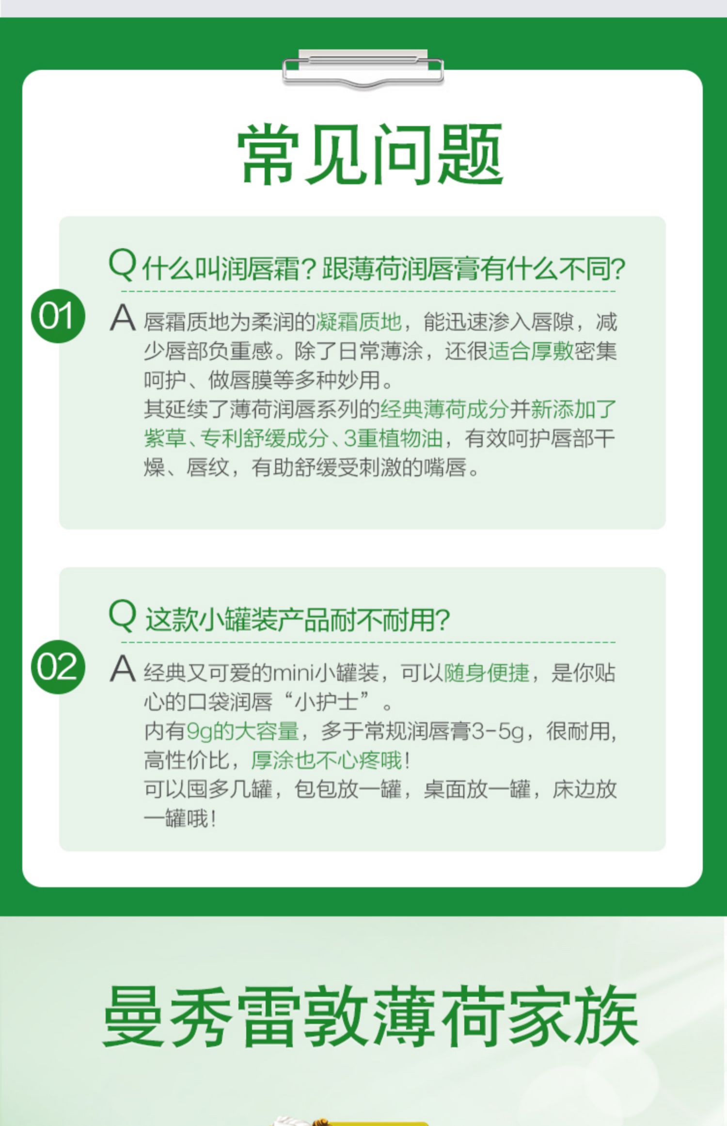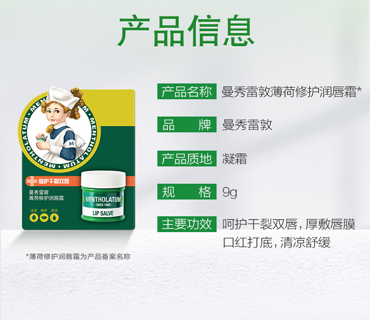 【曼秀雷敦】薄荷唇膏霜套装12.5g2件套,折后满减预估到手价¥42.9元,到手4件买既赠:保湿面膜2片】【建议拍9g】薄荷补水润唇膏保湿滋润,淡化纹唇部滋养男女粗唇膏,女神邓紫棋推荐!天然草本精华,添加专利舒缓成分,深层滋养水嫩Q弹!多重植物油锁水保湿。