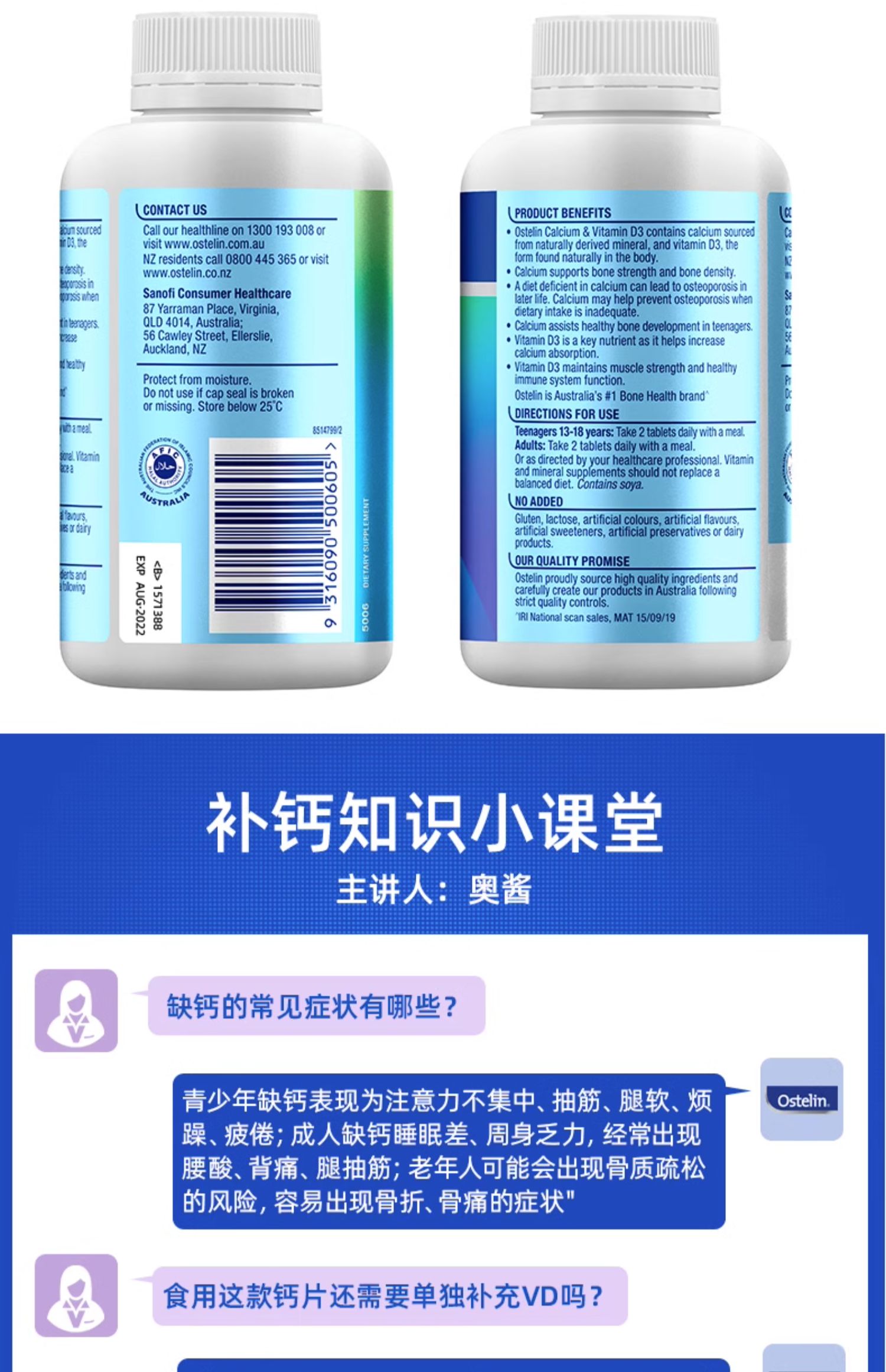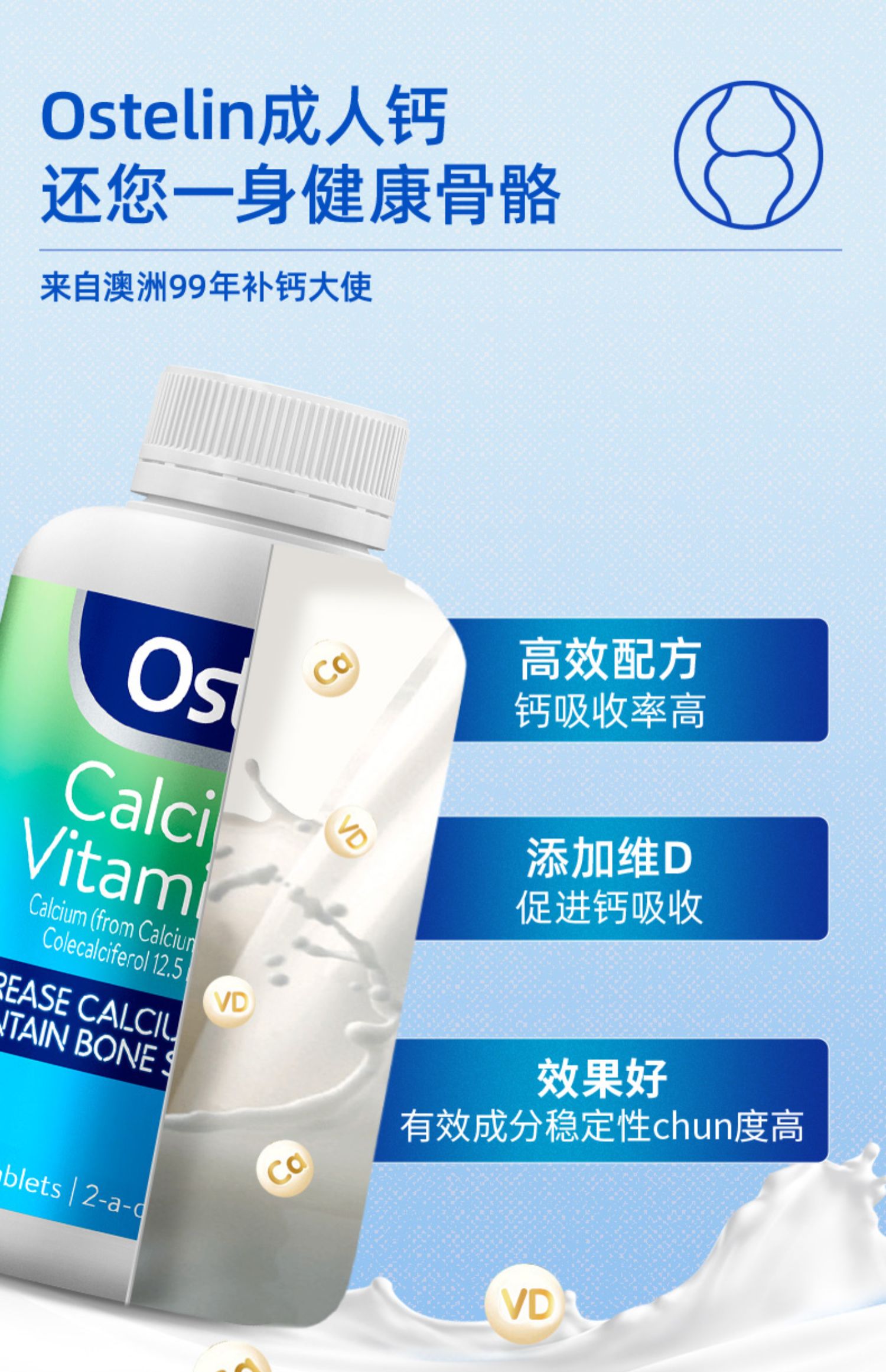 澳洲销量No..1,原装进口,全家补钙性价比之选!①600mg高浓度钙,一天一粒预防骨质疏松②500IU维生素D3促进钙吸收,提升免疫力③澳洲TGA+GMP+赛诺菲制药三重认证,医药级品控!