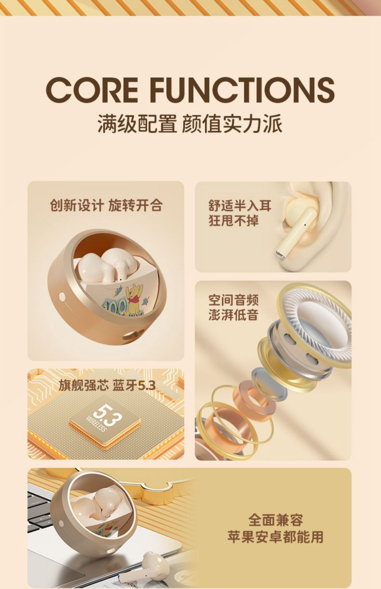 【迪士尼正品联名款】23新款迪士尼真无线蓝牙耳机,真无线蓝牙耳机,HiFi音质,创新旋转开合,开盖秒连,声画同步不卡顿,久戴舒适,超长续航,多色可选!【赠运费险】
