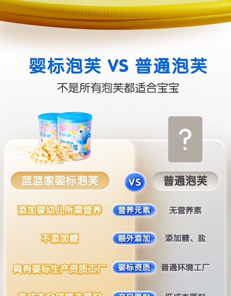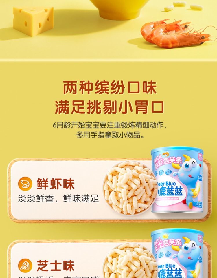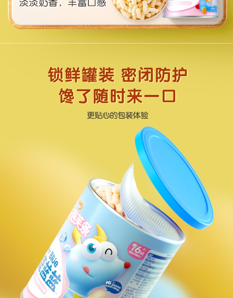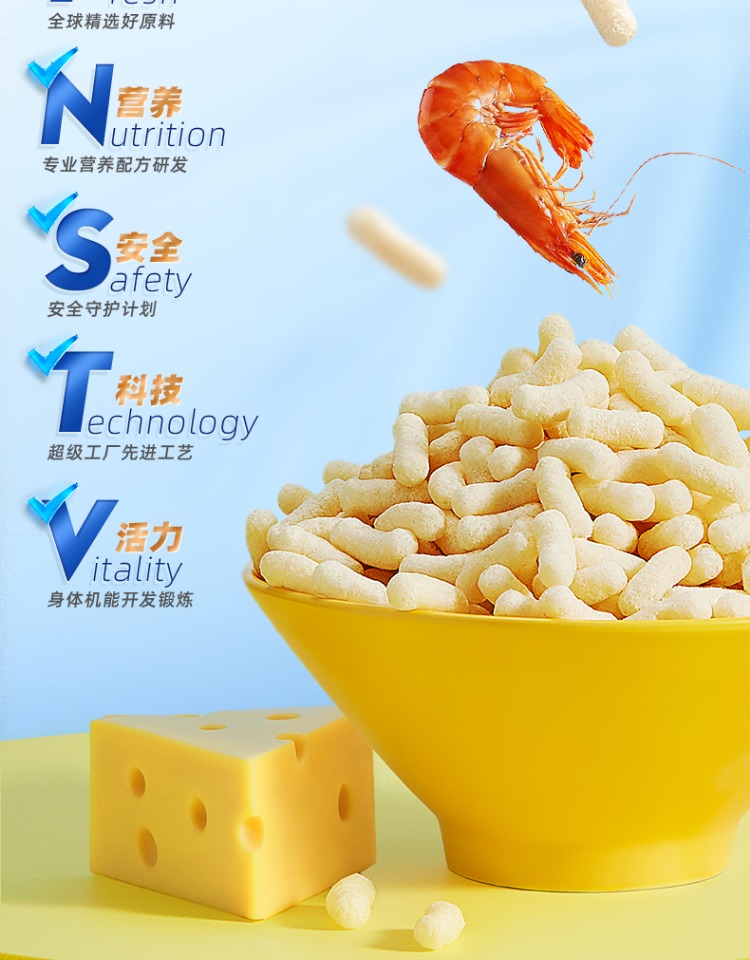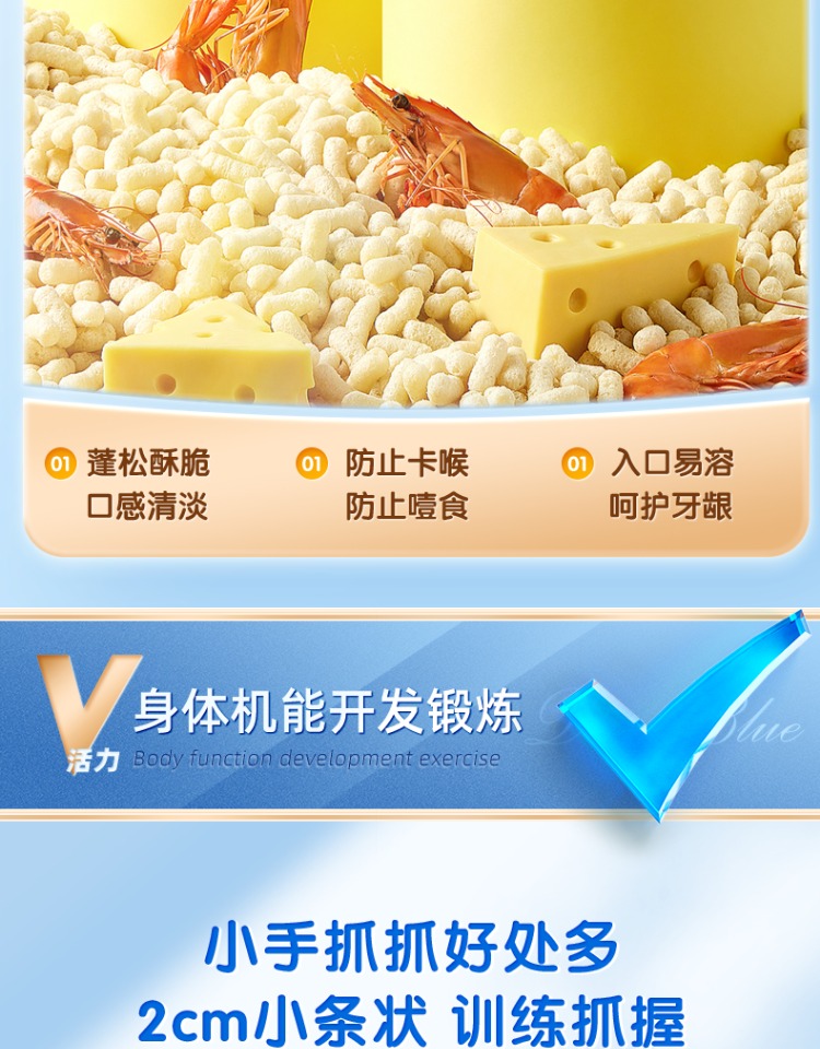 婴幼儿标准,宝宝专属泡芙条,不乱添加,宝宝放心吃,妈妈更安心,非油炸,谷物自然膨胀,入口即溶,不易上火,易抓取,让宝宝乐趣不停