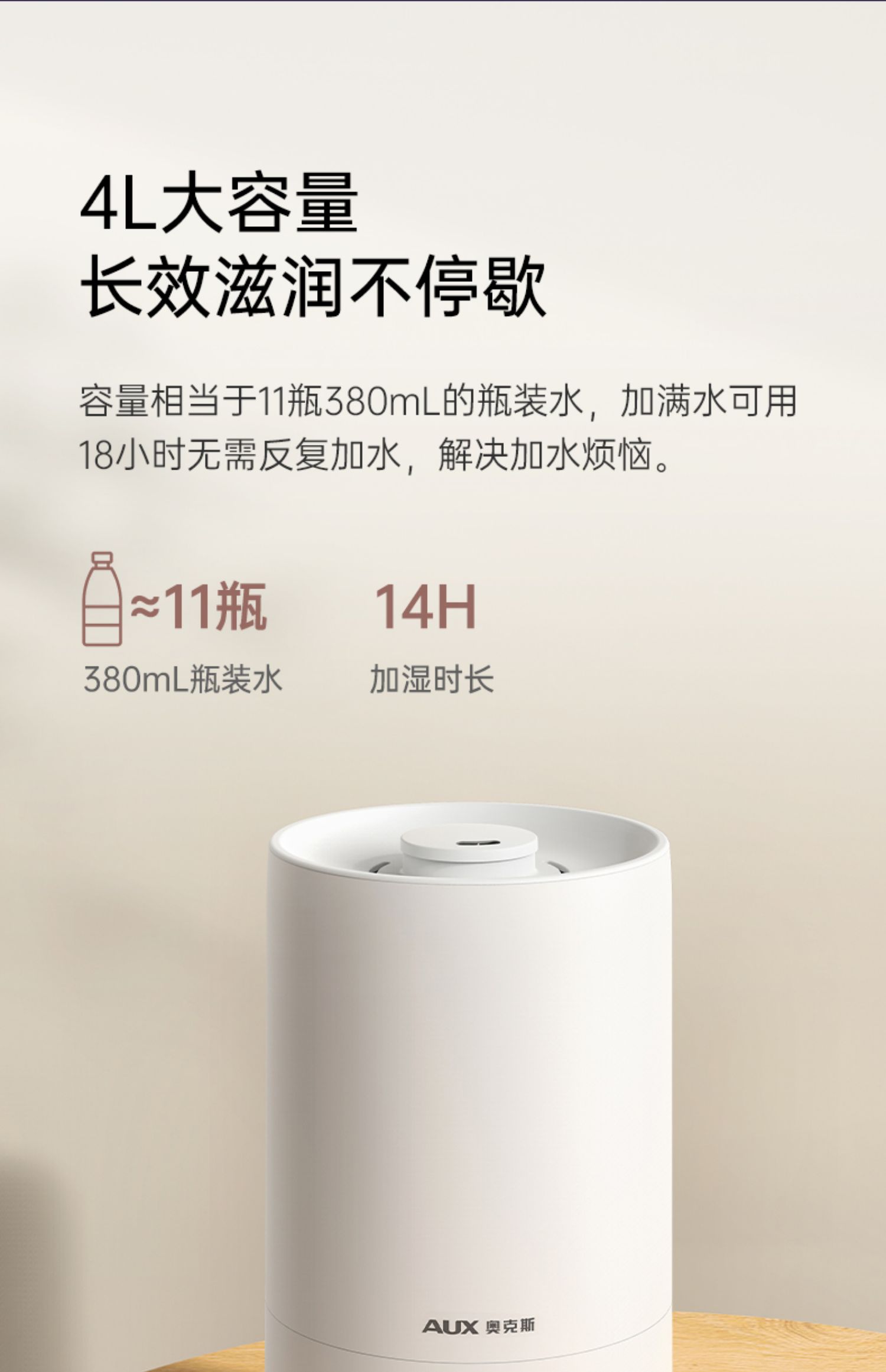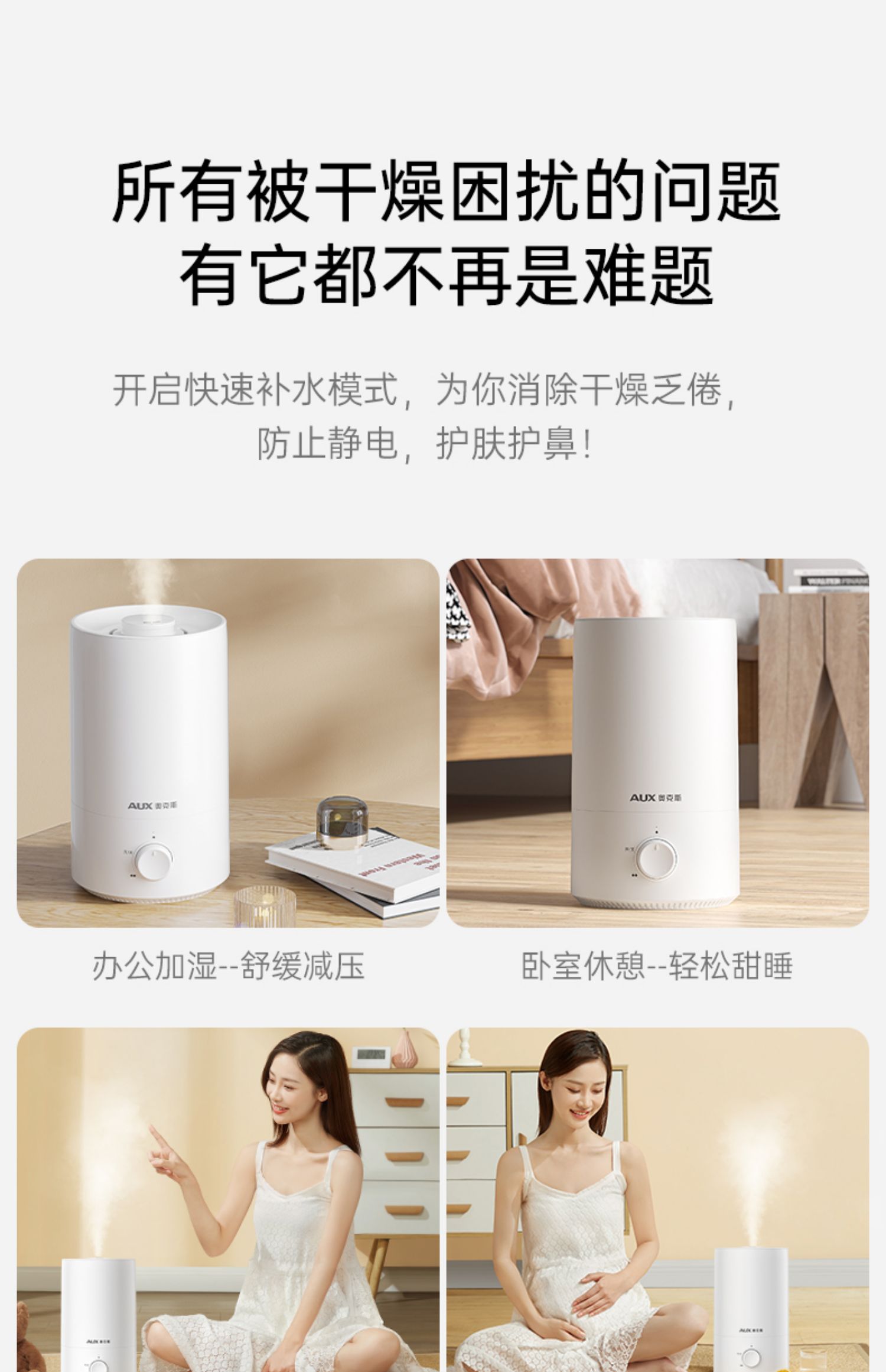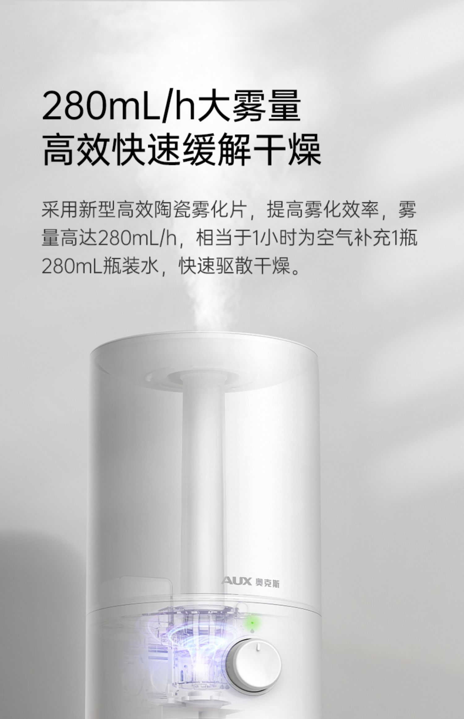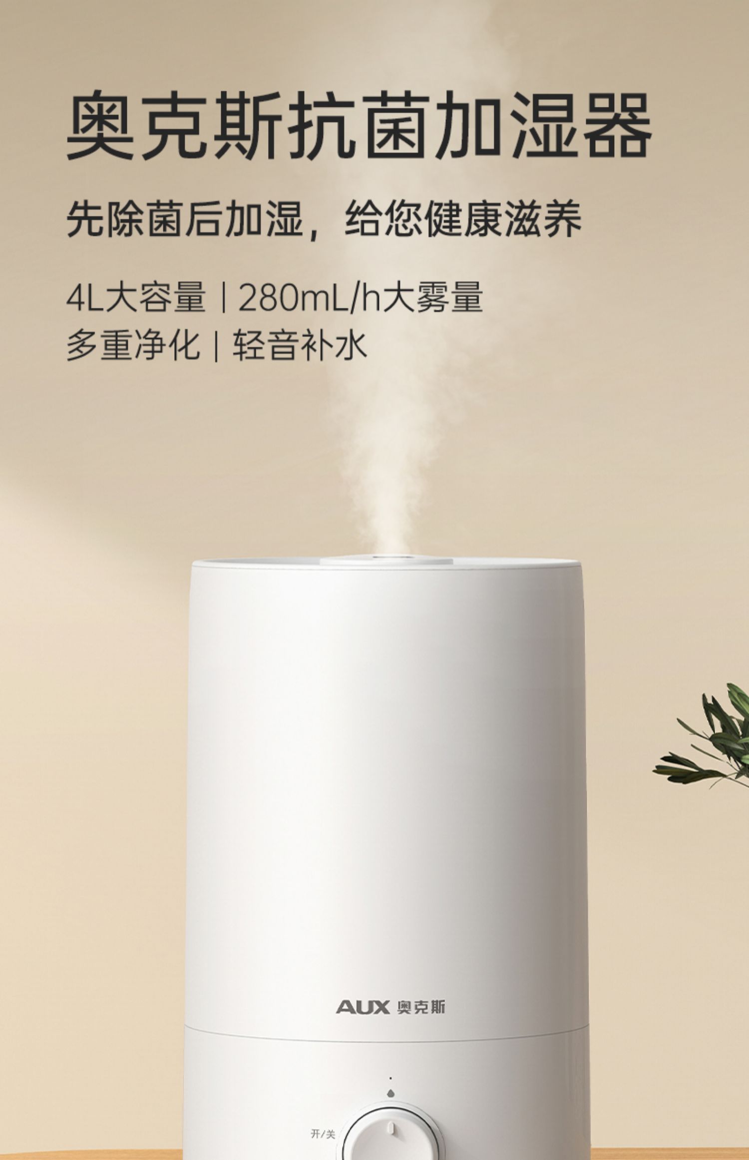 奥克斯静音加湿器,超声波分子雾化,滋润你的每一寸肌肤,孕妇婴儿很适用,静音运作,滋润补水,水雾轻柔,温润空气,让肌肤喝饱水!