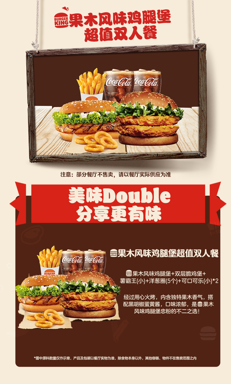 【汉堡王官旗】双人餐到手36,线下一个汉堡就要28!果木风味鸡腿堡*2+中杯可口可乐*2+大份薯霸王*1,真正果木火烤,香味浓郁,好吃停不下!三十天内有效期,用户未使用自动退款,全国线下门店均支持兑换