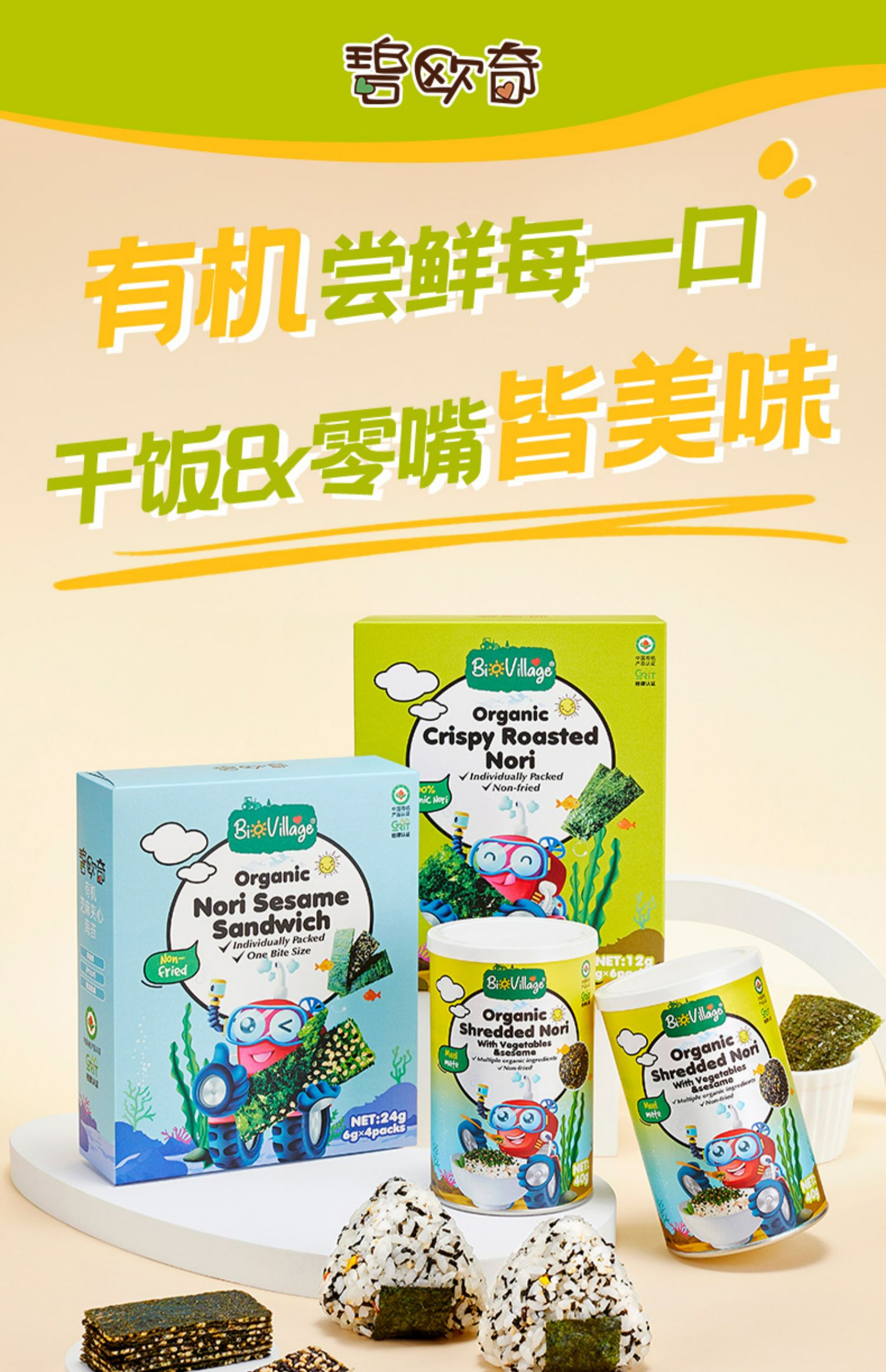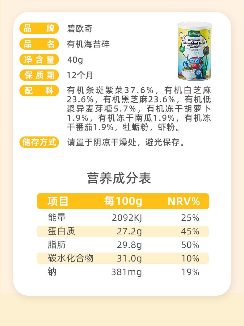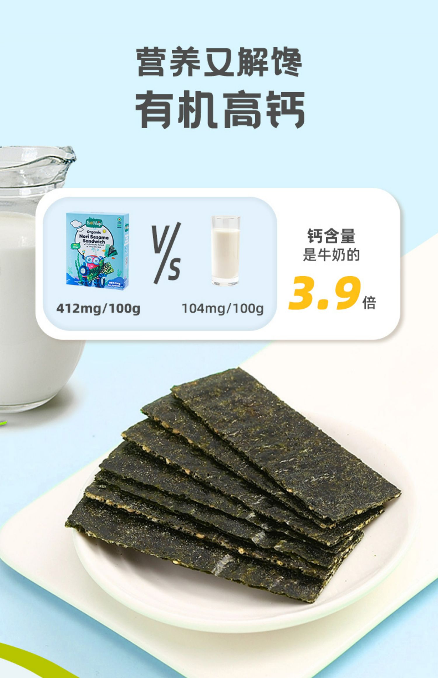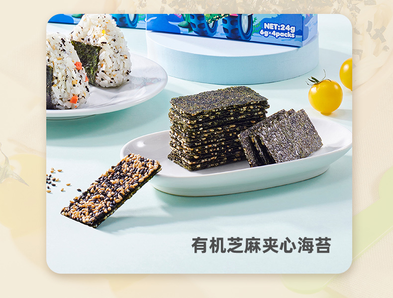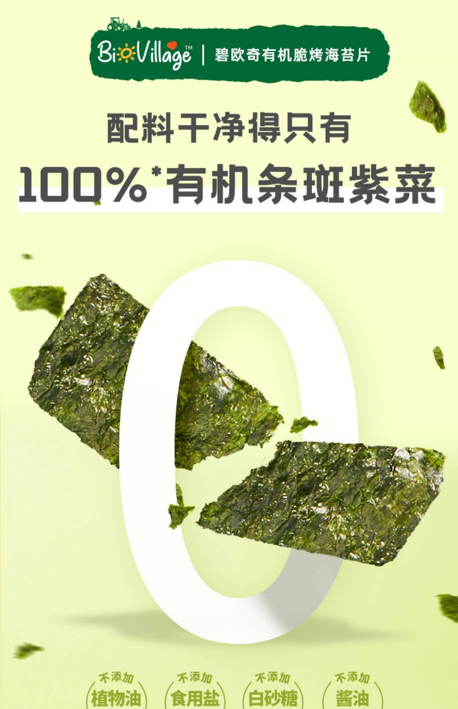 无油配方,7大不添加,不能吃的一样都没有。碧欧奇有机芝麻夹心海苔,甄选北纬44~46°,有机黑土地芝麻。