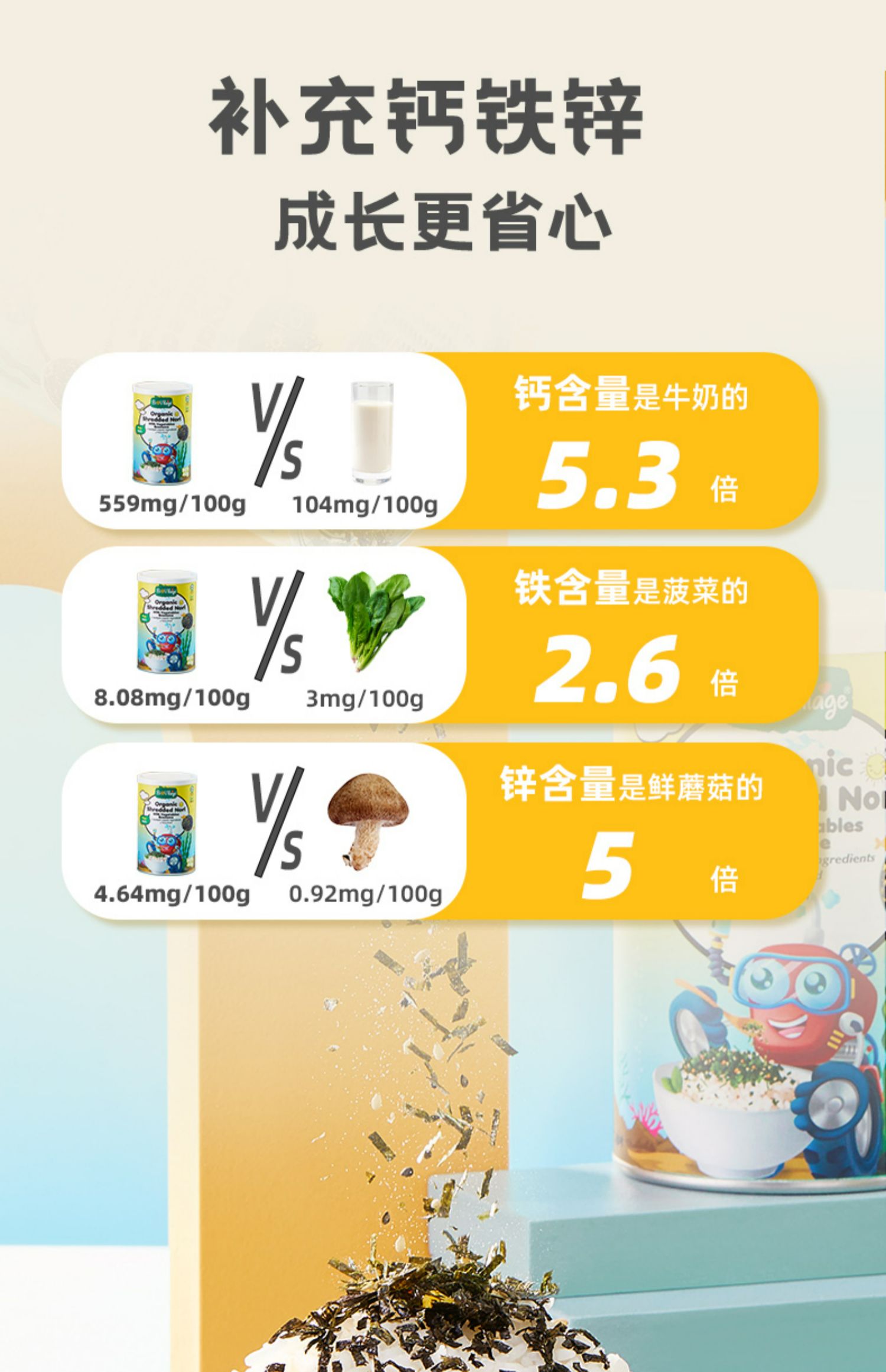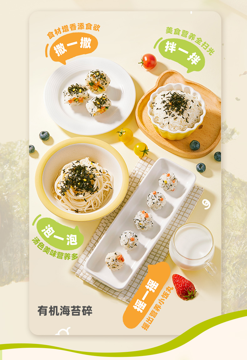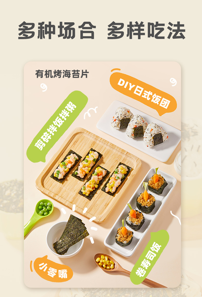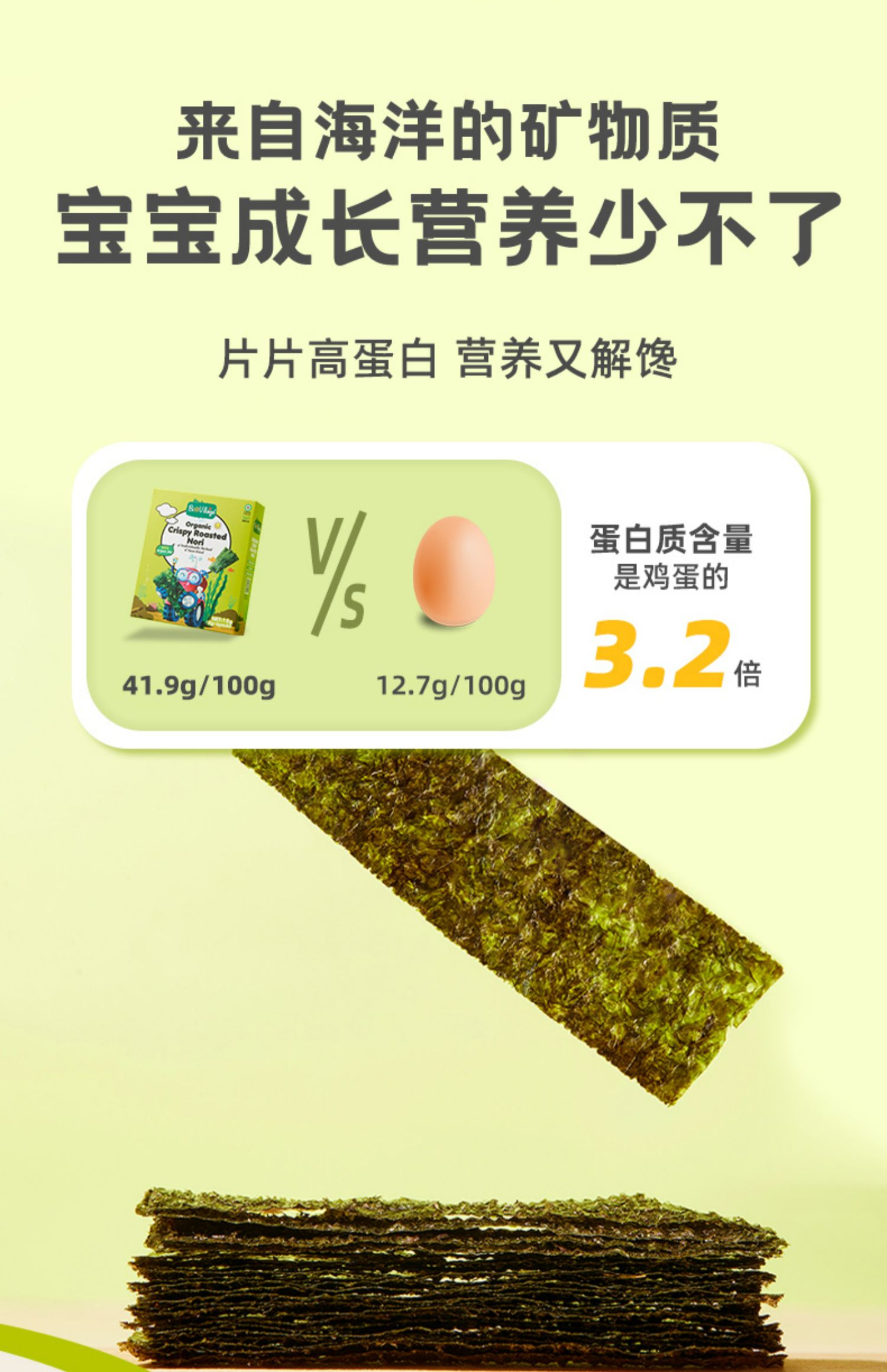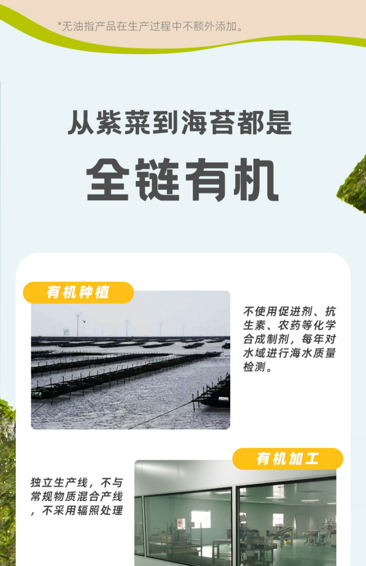 无油配方,7大不添加,不能吃的一样都没有。碧欧奇有机芝麻夹心海苔,甄选北纬44~46°,有机黑土地芝麻。