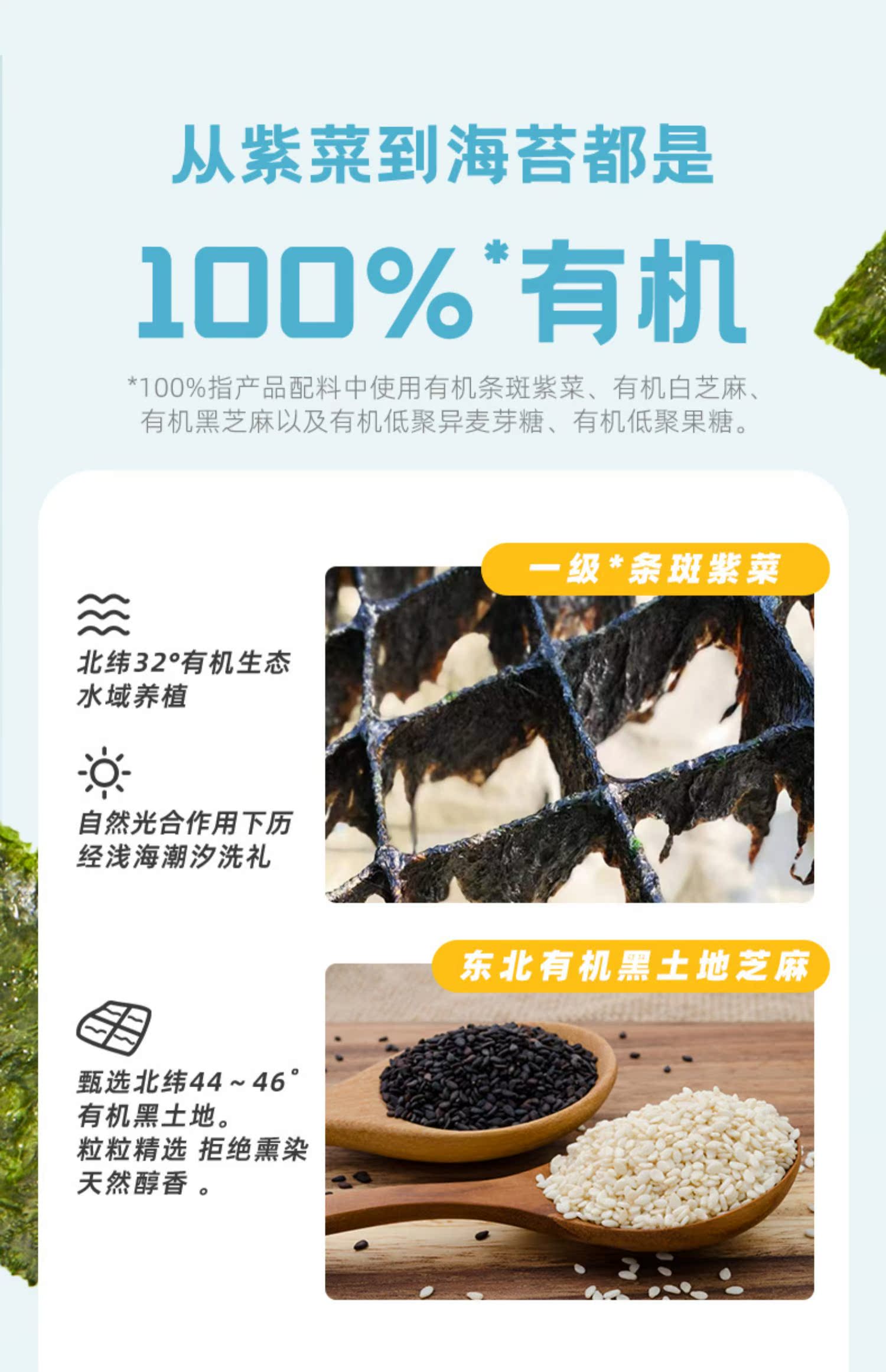 从紫菜到海苔都是%%有机,%%指产品配料中使用有机条斑紫菜、有机白芝麻、有机黑芝麻以及有机低聚异麦芽糖、有机低聚果糖。
