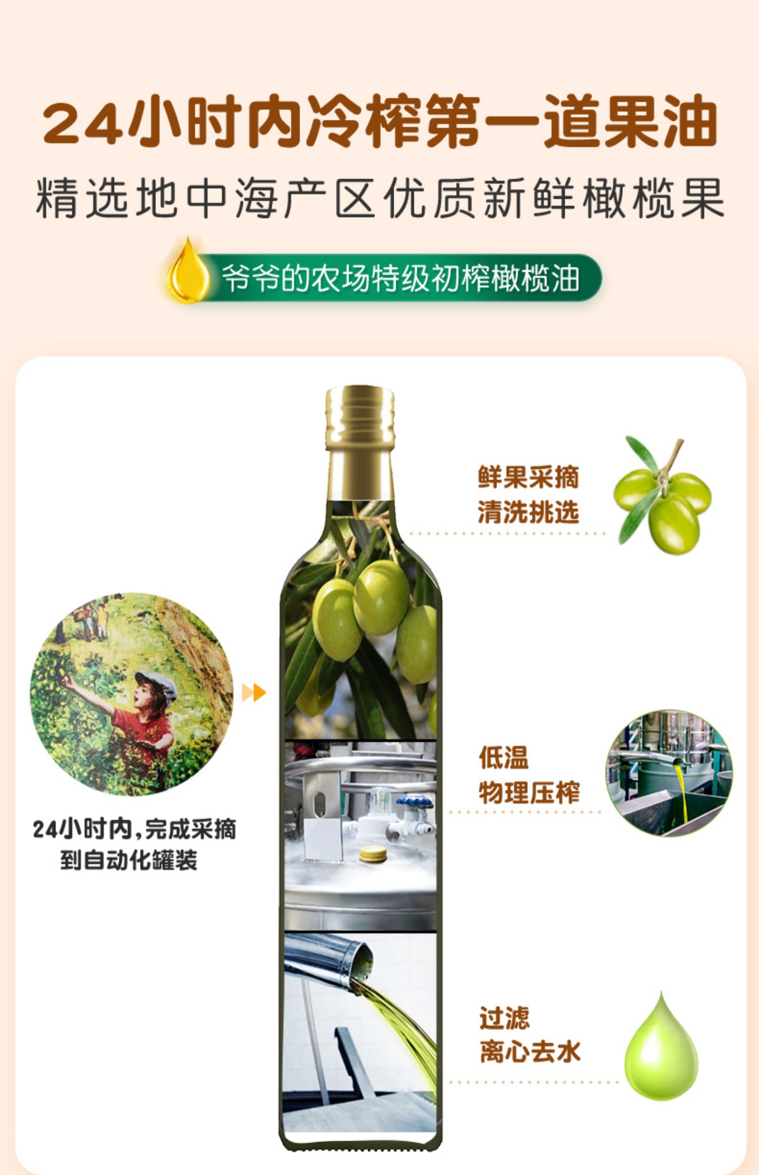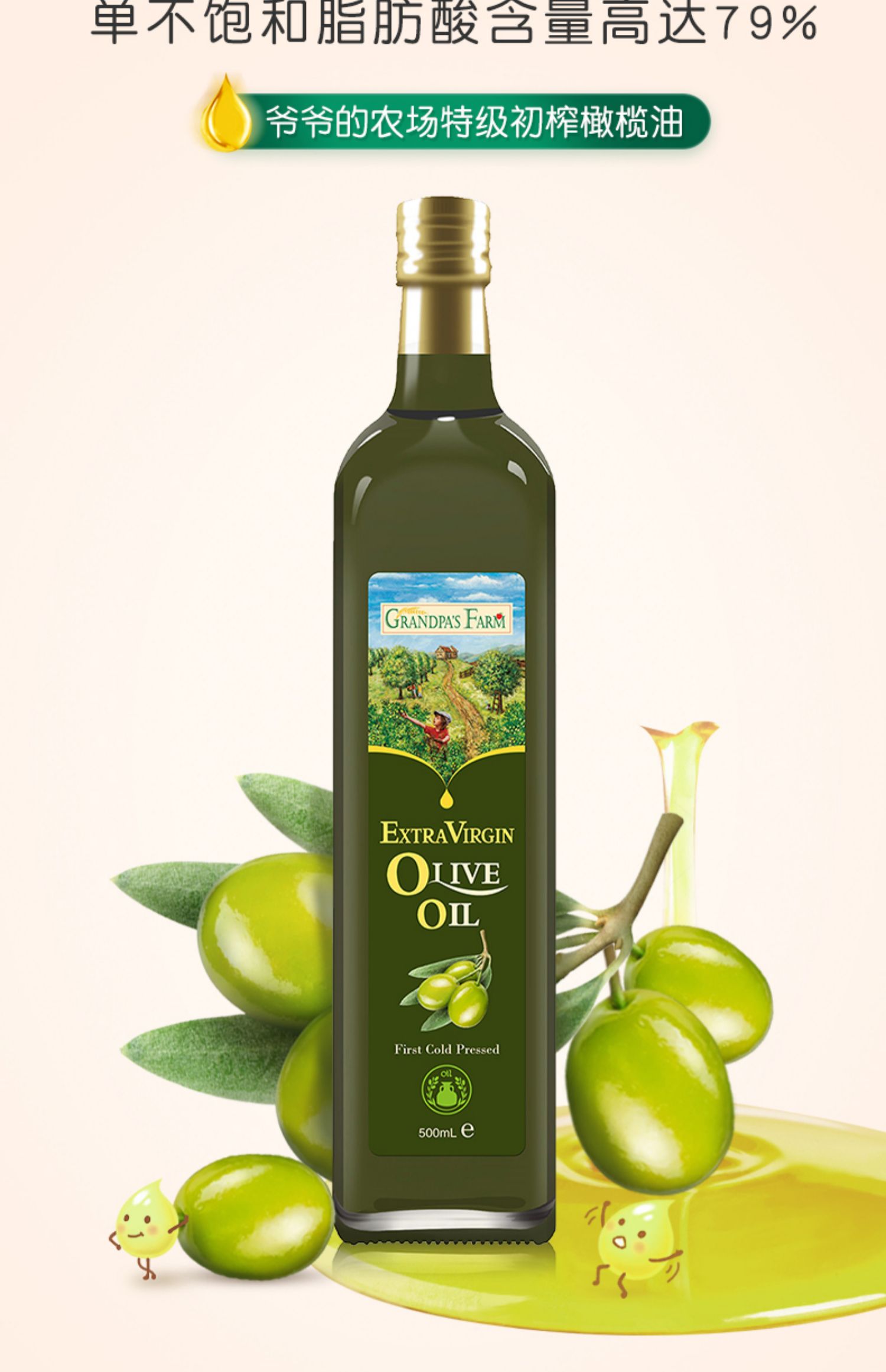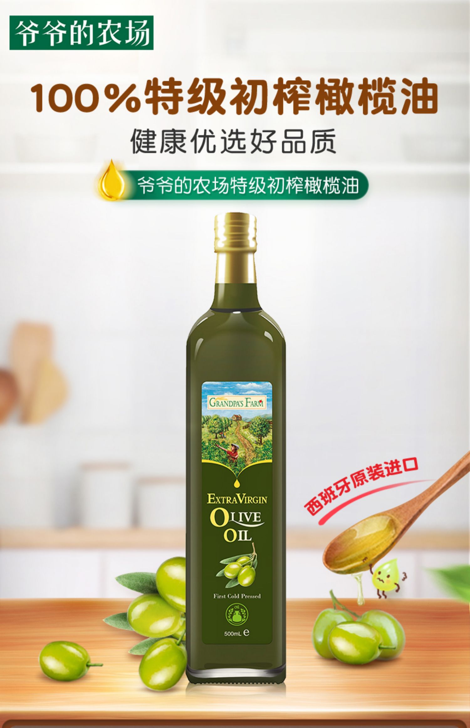 【拍两件!均价65.5/瓶,叠88vip=62/瓶】爷爷的农场橄榄油500ml*2,科学配比,营养丰富,煎炸烹煮,美食享受,含不饱和脂肪酸,降低胆固醇,健康食用油,超赞~