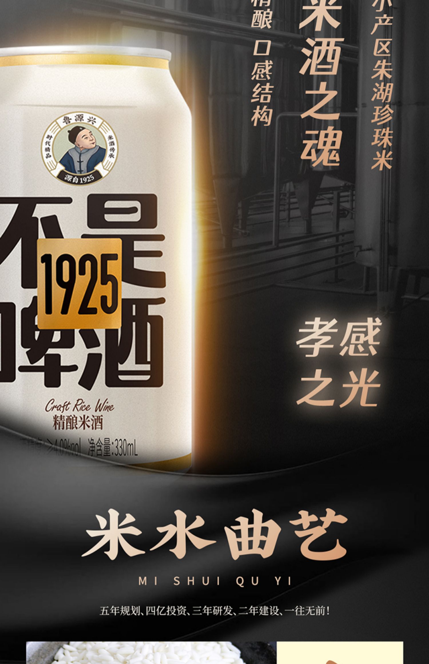 鲁源兴, 源自1925 ,成立于湖北孝感,是孝感县志记载的第一家米酒馆。鲁源兴1925不是啤酒,主要针对微醺小酌的人群,切入啤酒豪饮人群和场景,用传统米酒的发酵工艺结合精酿米酒的现代科技,创造出的畅饮型米酒。鲁源兴1925是传统孝感米酒转型升级的最新成果,它采用优质的朱湖糯米、清澈的城隍潭水、绿色的“蜂窝酒曲”,在鲁源兴百年传统工艺的基础上,结合现代化精酿技术淬炼而成;它集“天时、地气、材美、工巧”于一体,清甜略带豪放,香醇又回甘,微醺却不醉人,老少皆宜。酒精度≥4.5%VOL。