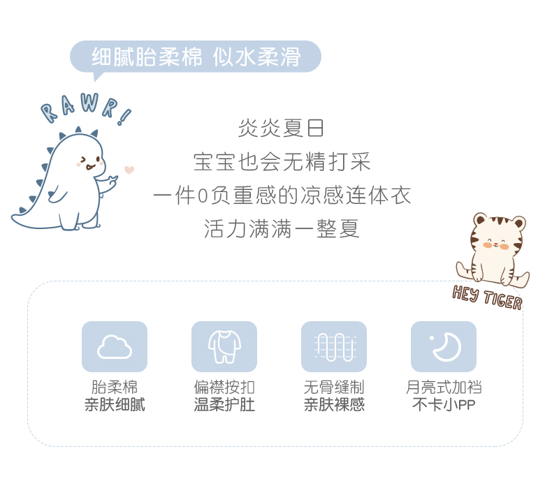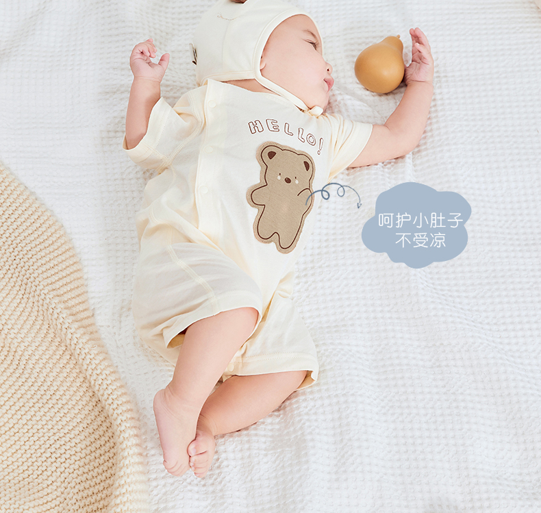 麦拉贝拉纯棉宝宝哈衣爬服,无荧光、无甲醛、A类品质,胎柔棉安全呵护敏感肌,月亮式立体加档,活动自如,无骨缝制亲肤裸感!