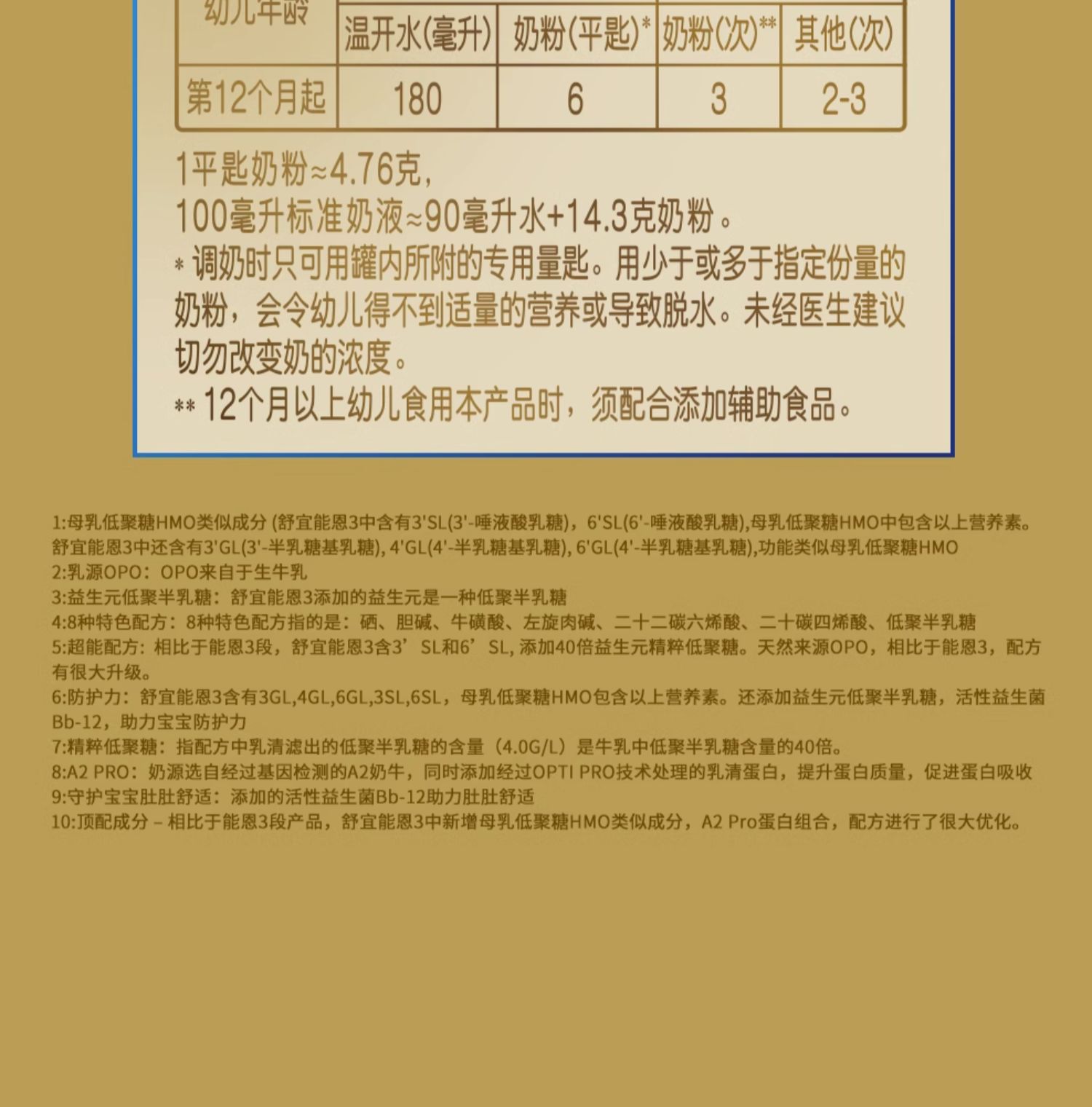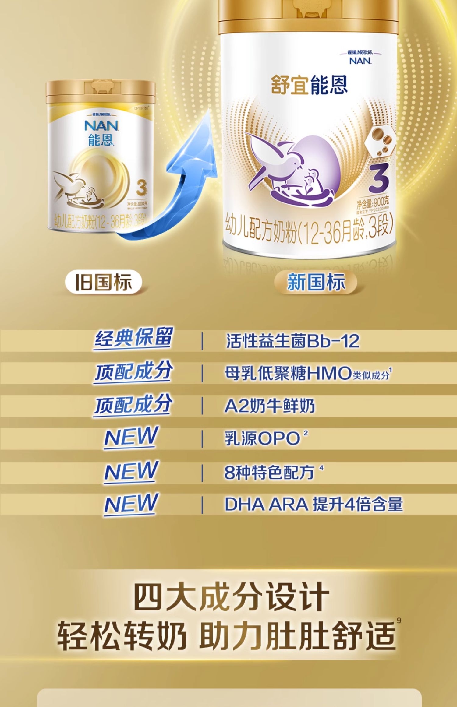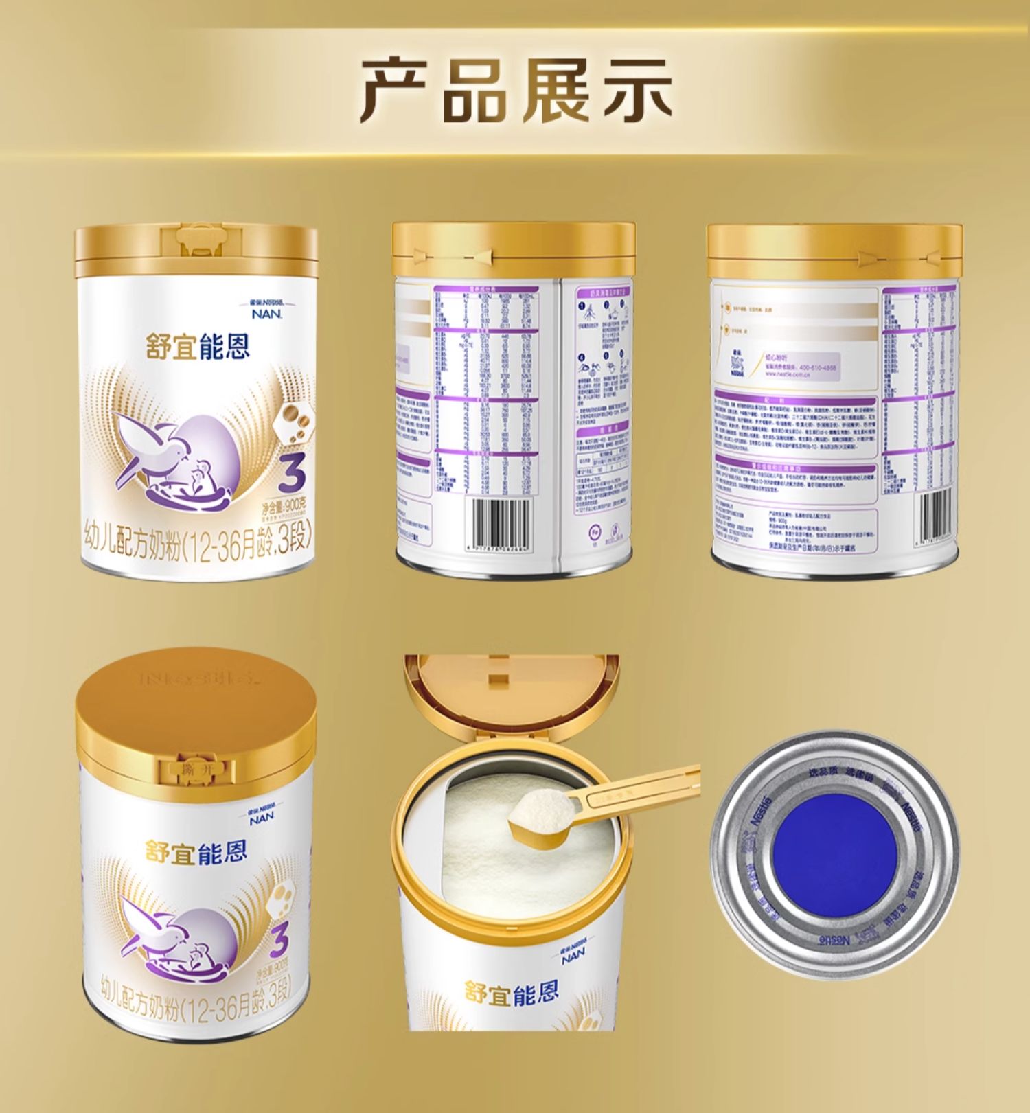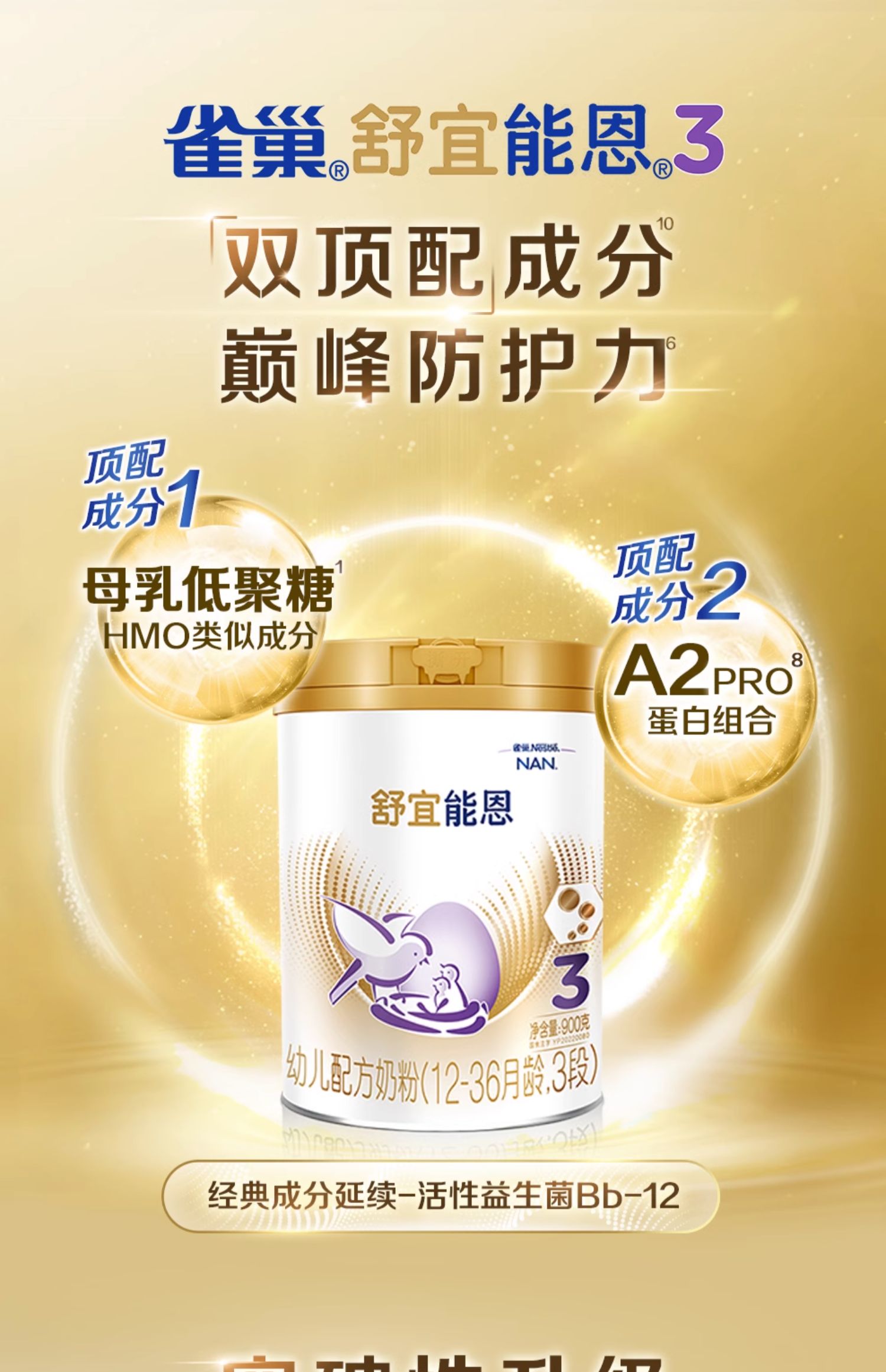 【立减504元,到手164元/罐;前5名单笔买1组送婴侍卫摇奶器++母婴赠品-嘉宝果泥(DB口味随机)*4】雀巢舒宜能恩3段,双顶配成分,巅·峰防护力;到手199元/罐,900g*4罐装~