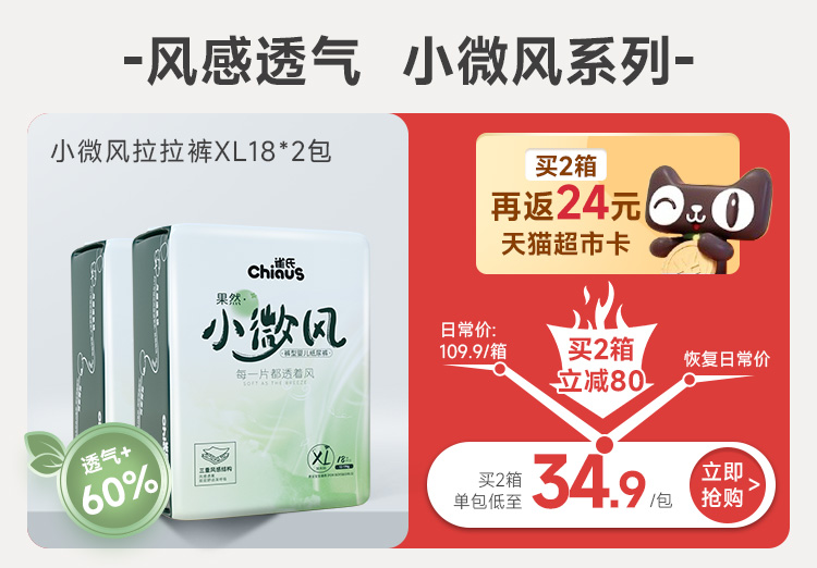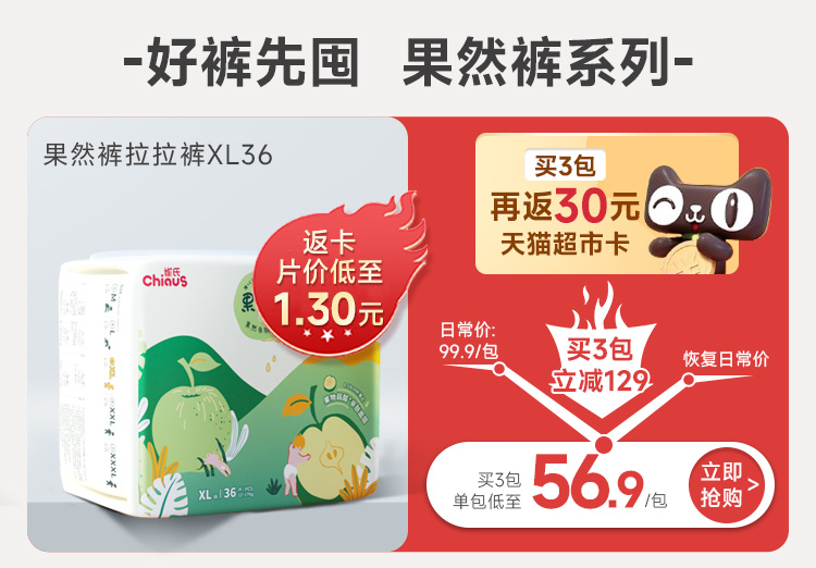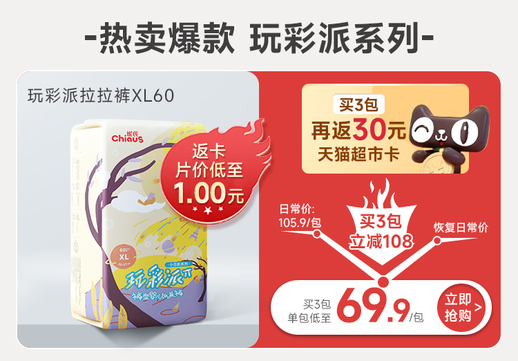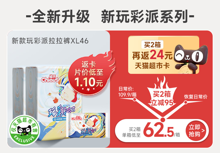 【每包返10元猫超卡,单包立减44.9元,3元福袋,88VIP到手42.2元】超市定制雀氏新玩彩派拉拉裤L50片XL46片XXL42片XXXL38片,透气干爽尿不湿,装透气尿不湿;高效锁水,超低反渗,宝妈放心囤!