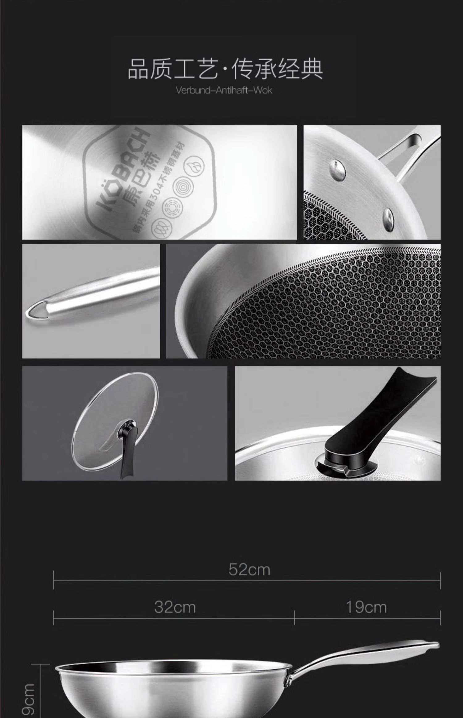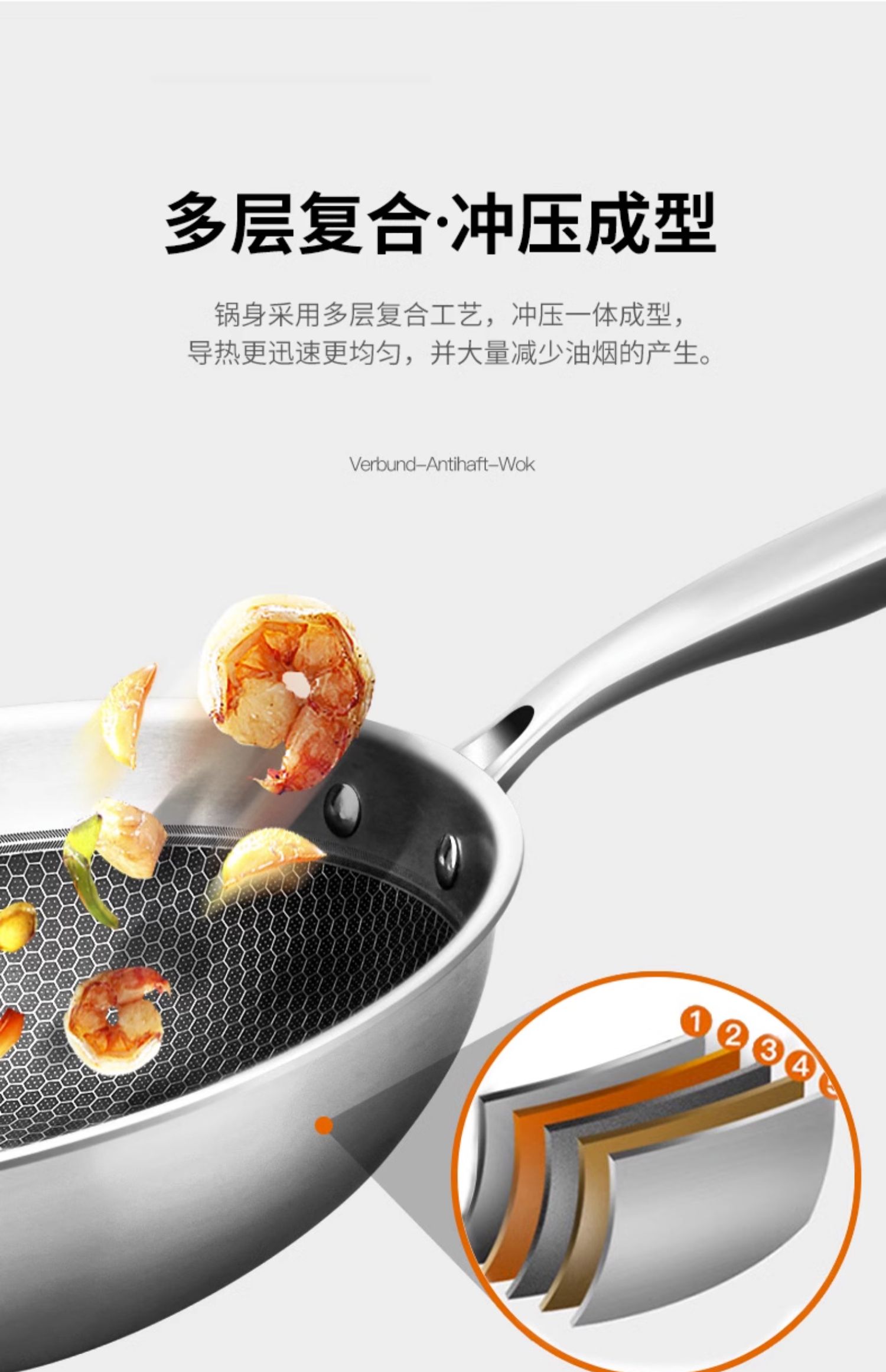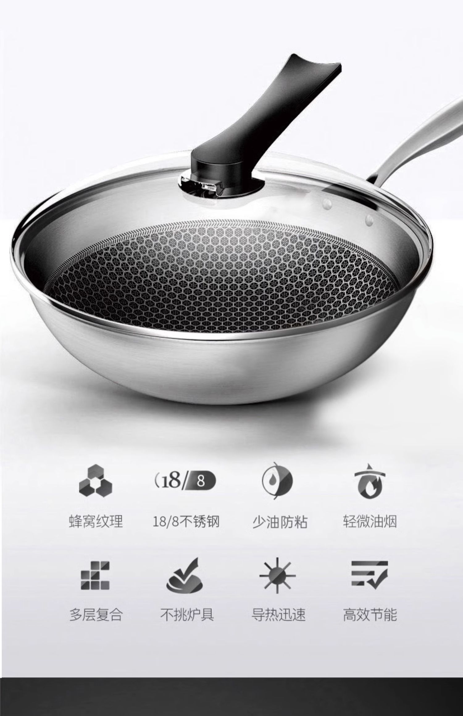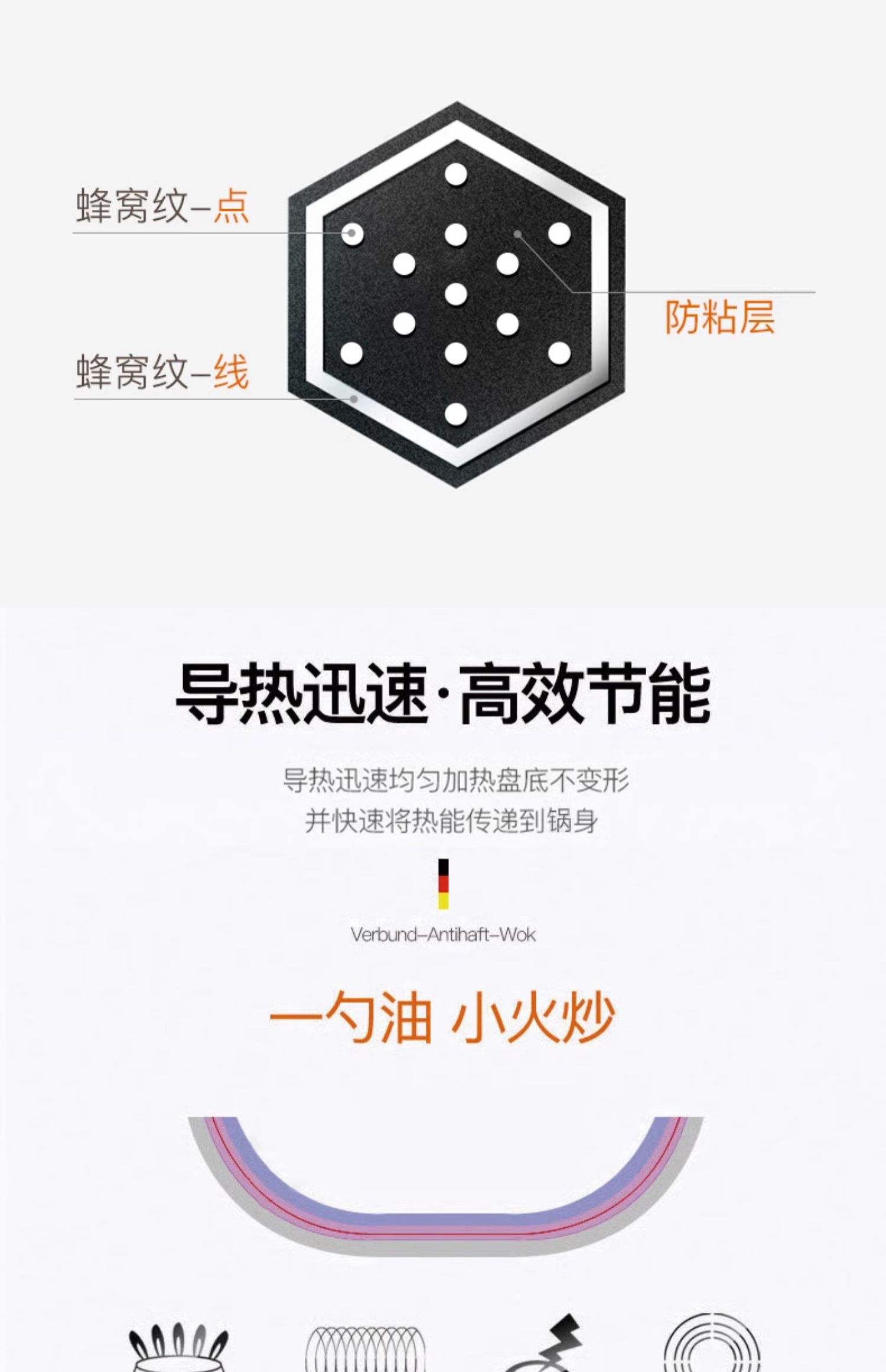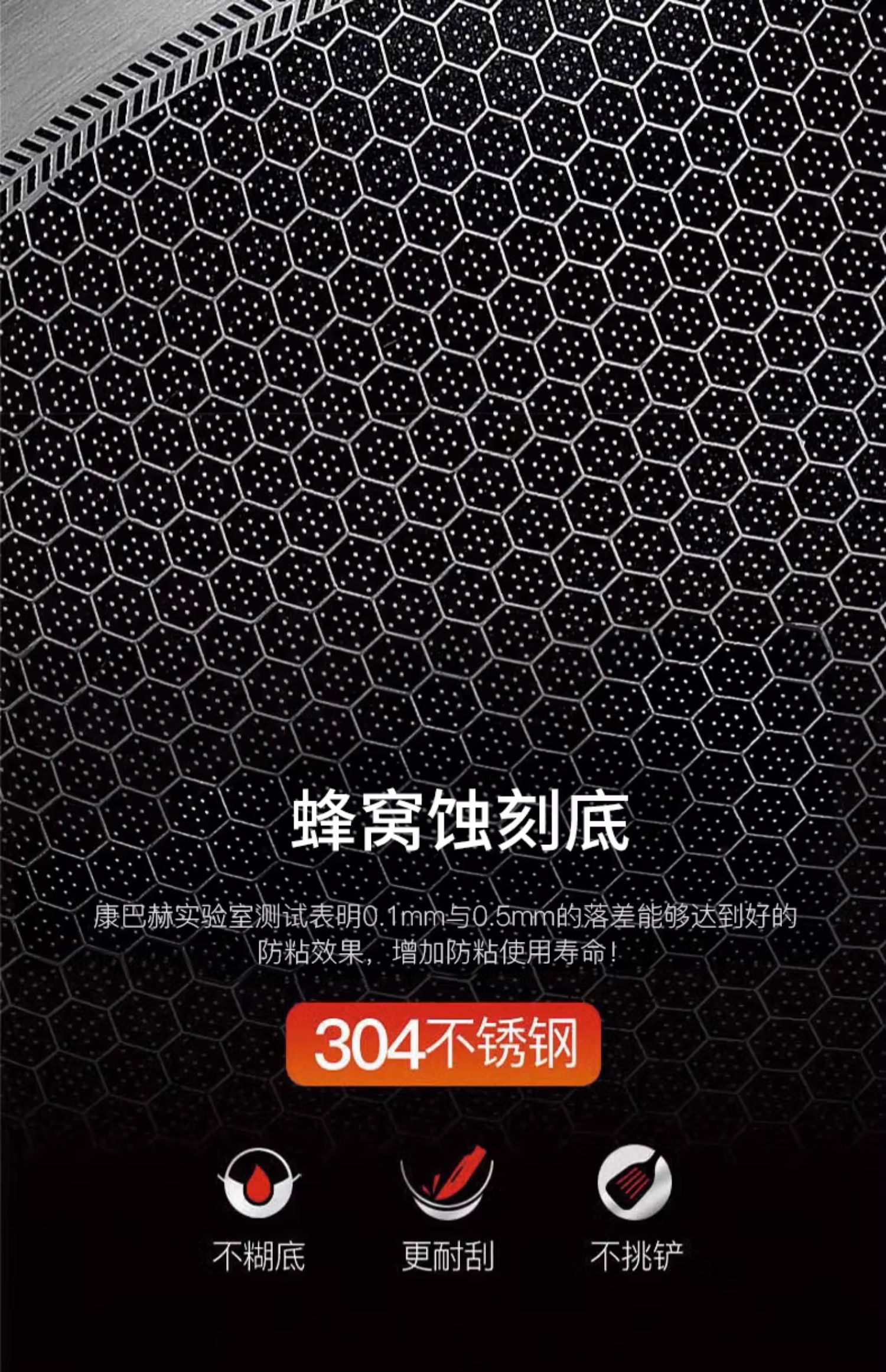 【KBH/康巴赫】锅身采用多层复合工艺,冲压一体成型,导热更迅速更均匀,并大量减少油烟的产生!蜂窝凹凸花纹均匀加热,减少食材与锅底的接触面积,从而达到不易粘效果,翻炒更轻松!【送运费险】