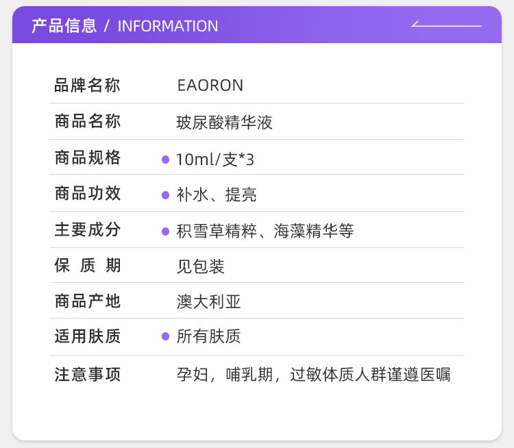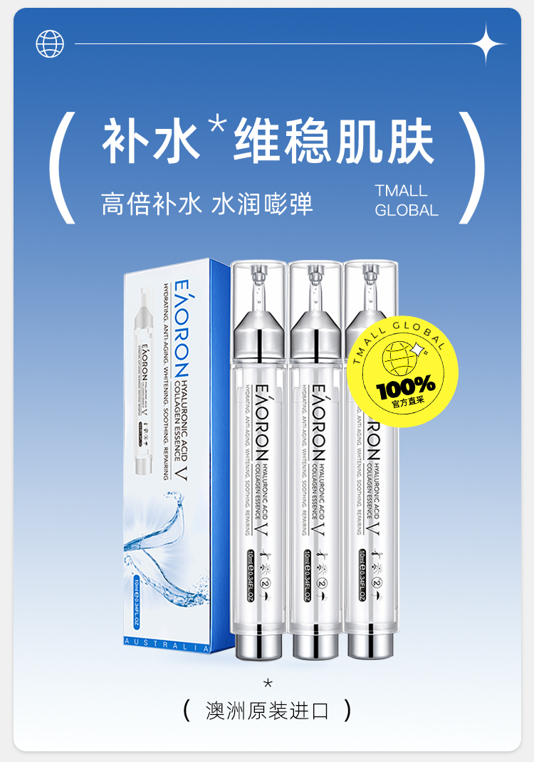 【赠洗脸巾1包凑单到手151.1】天猫国际自营,澳大利亚进口,eaoron澳容玻尿酸精华液10ml*3,涂抹式水光提亮补水保湿!积雪草精粹,舒缓滋养,改善肌肤问题,品质保证,速抢!!【包税包邮】