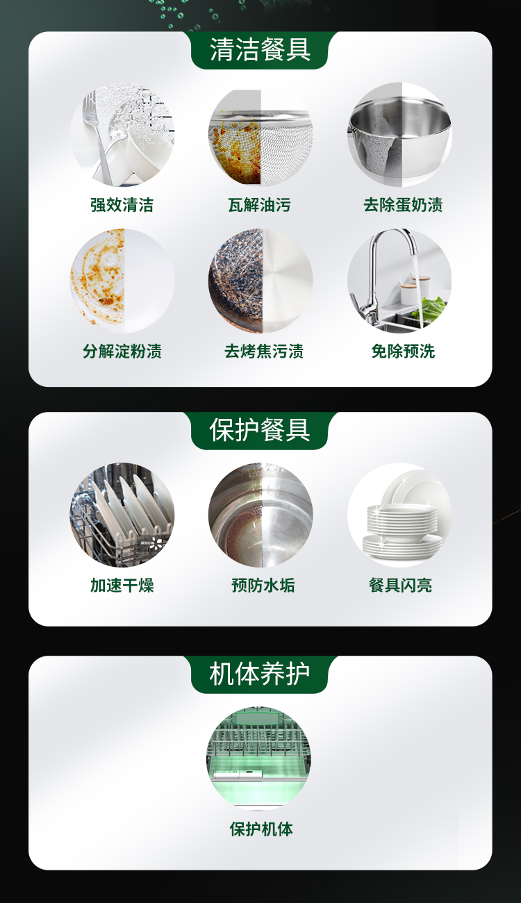 低温起效,快速溶解,软化水质,预防水垢,加速干燥,光亮碗碟,滤网保护,多效合一,加倍清洁。低温起效,快速溶解,软化水质,预防水垢,加速干燥,光亮碗碟,滤网保护,多效合一,加倍清洁。