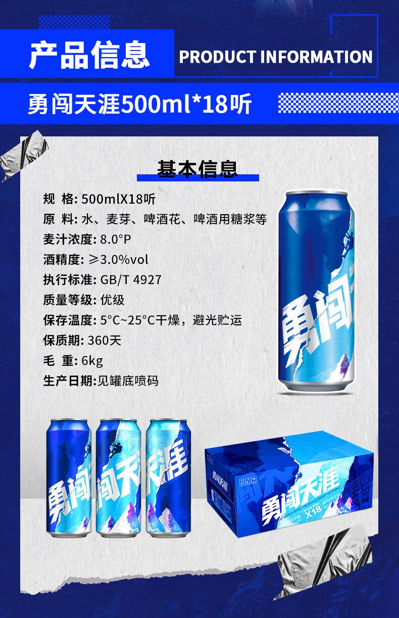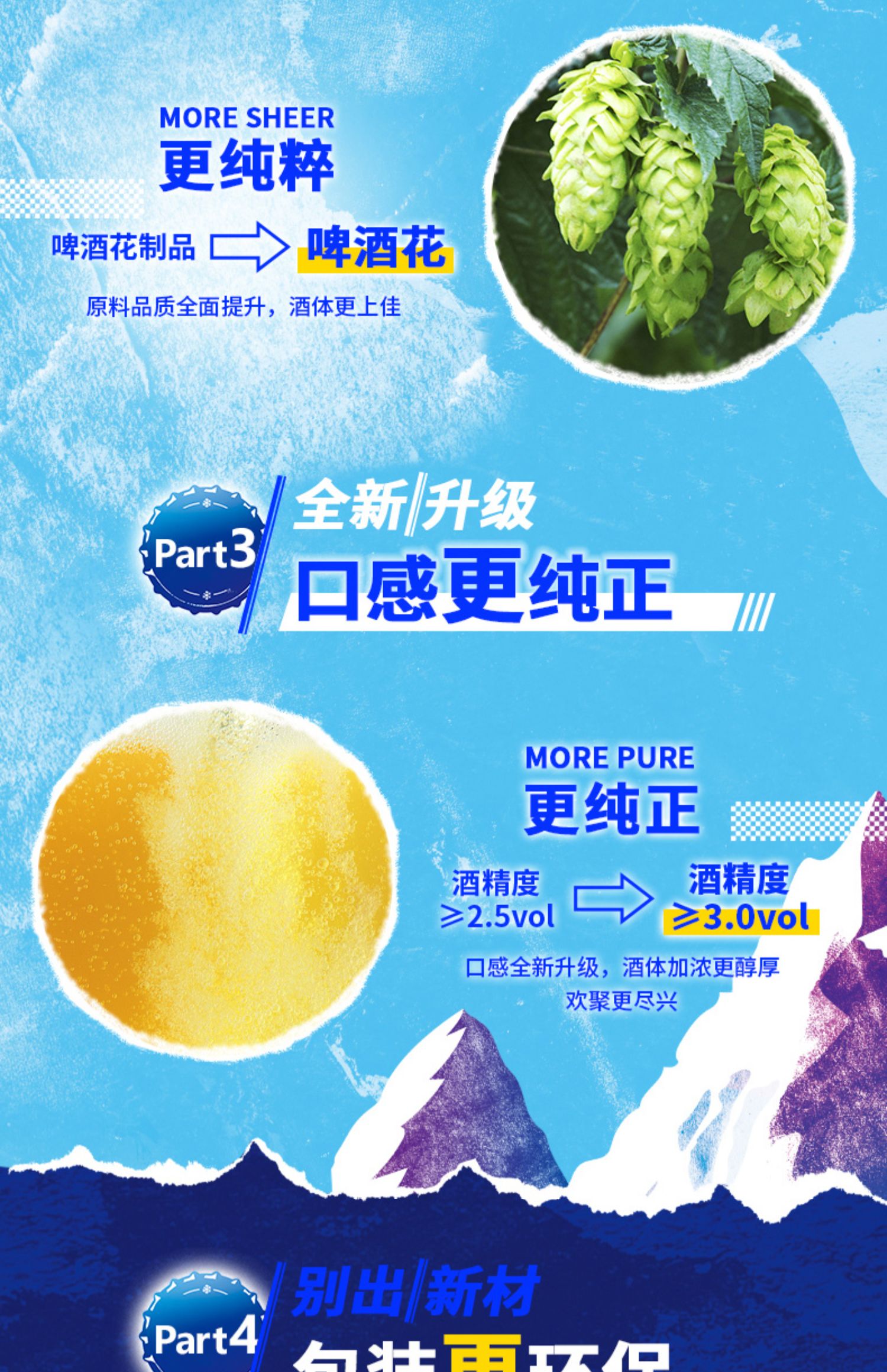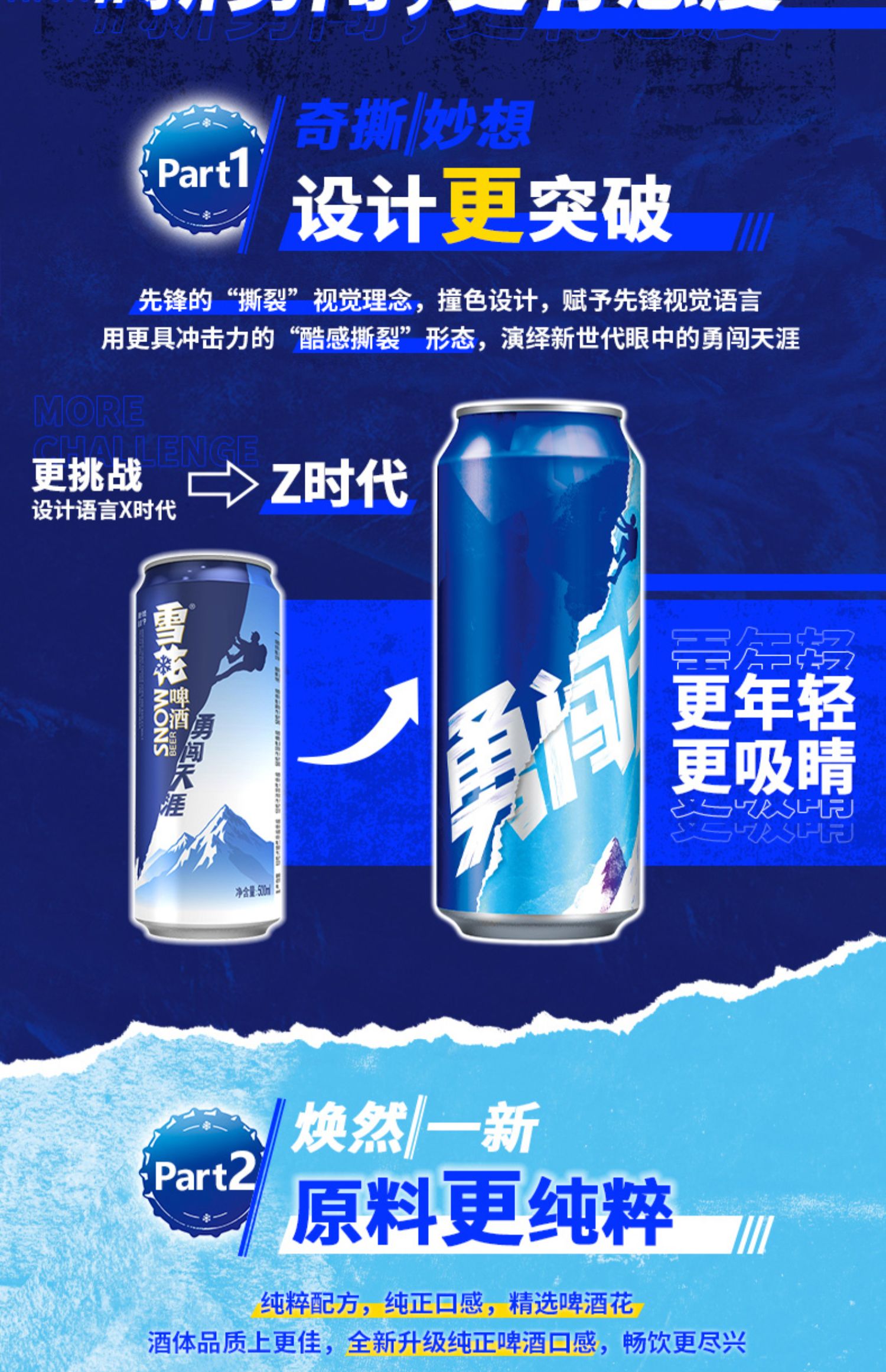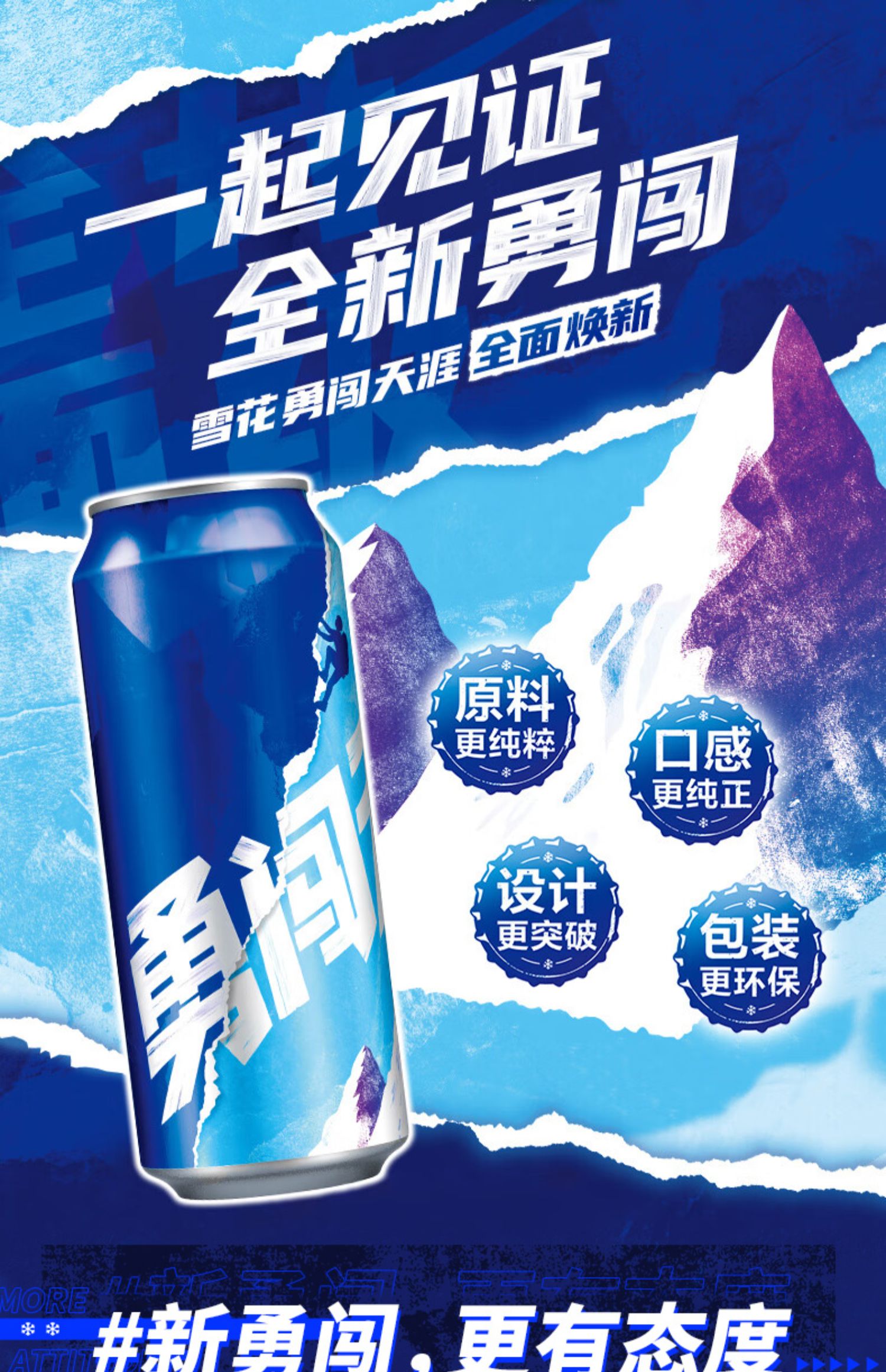 一起见证,全新勇闯,雪花勇闯天涯,全.面焕新!纯粹配方,纯正口感,精选啤酒花,酒体品质上更佳!