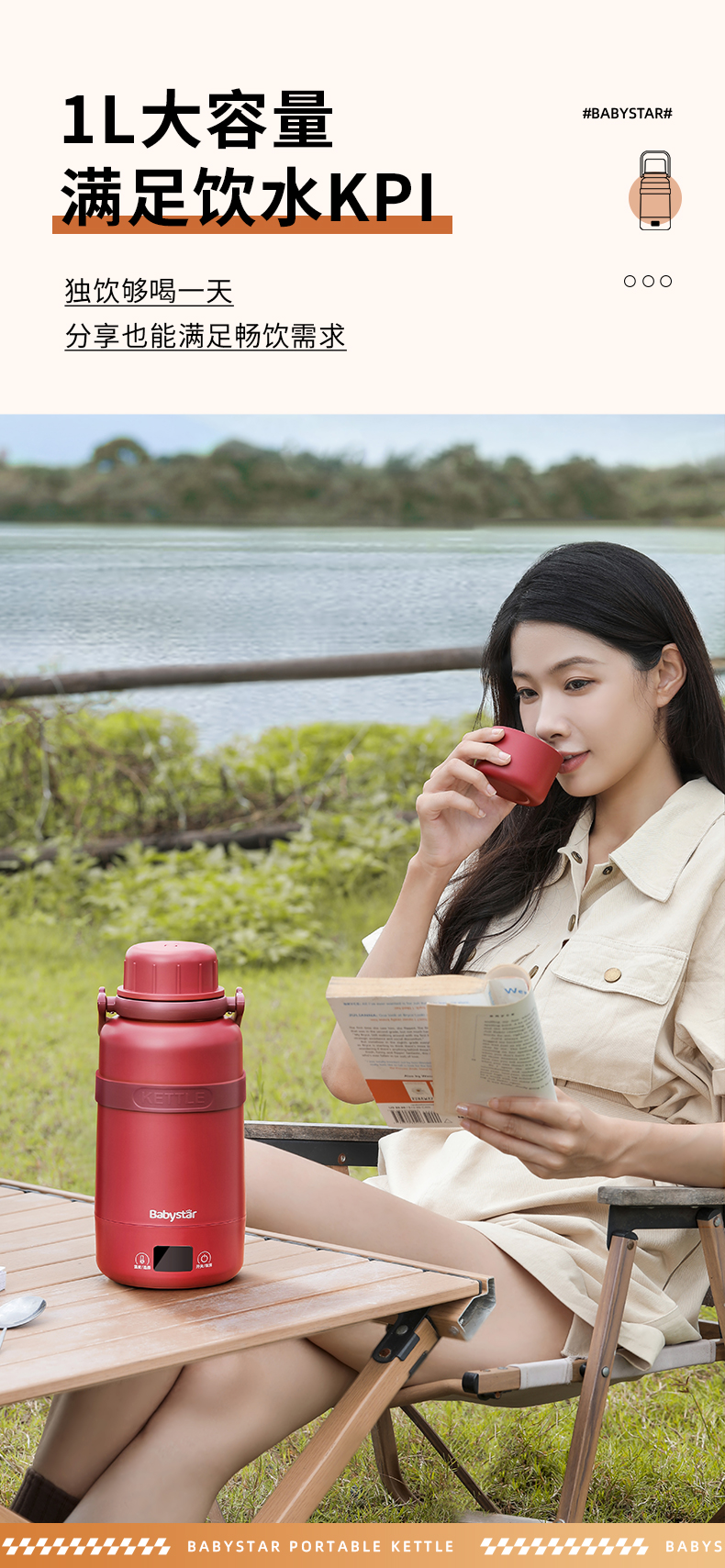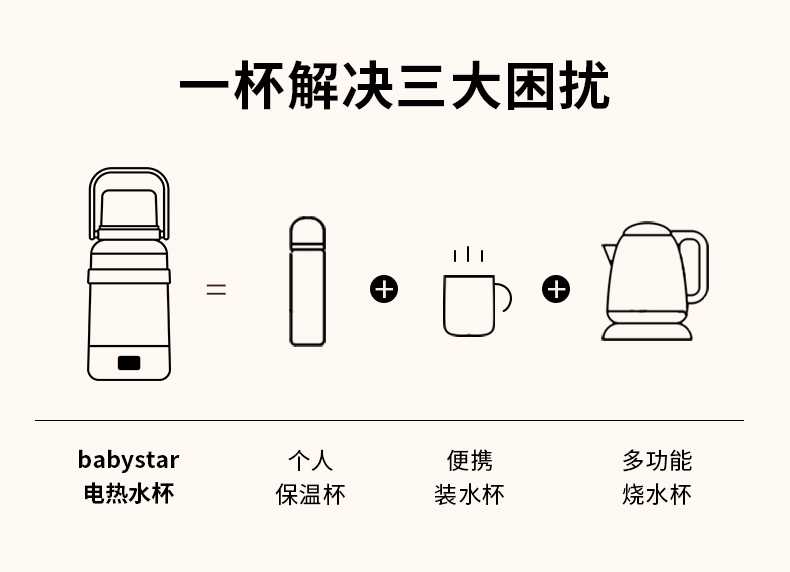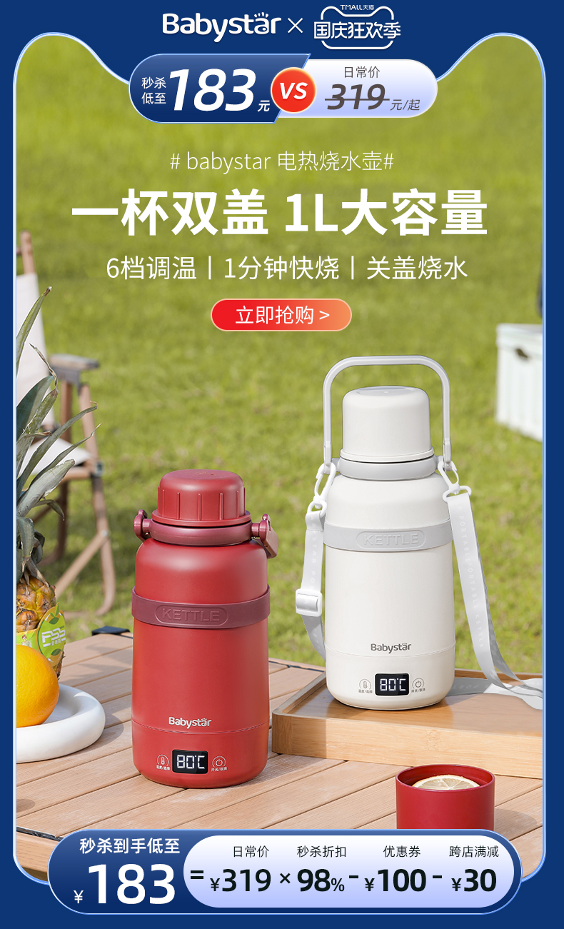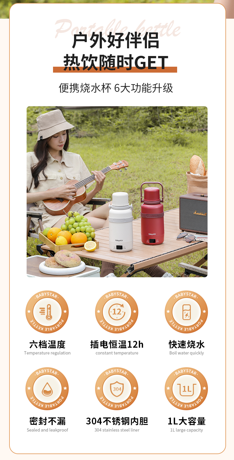 BabyStar便携式烧水壶自动电热水壶!!选用食品级不锈钢材质,母婴都能用,6挡调温,一分钟快烧!!冲奶泡茶毫无压力!!1L大容量,满足一天饮水,一杯双盖,使用方便!出差旅行野外露营必备!