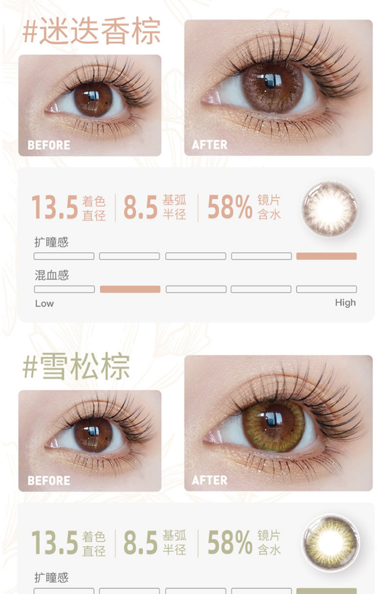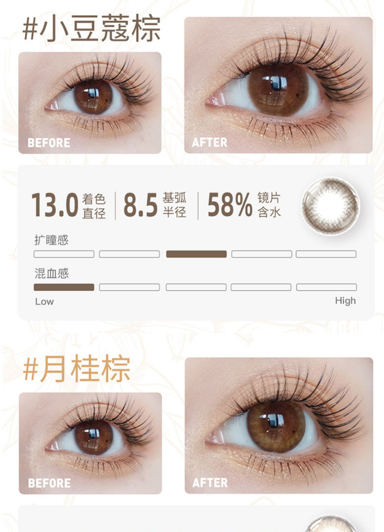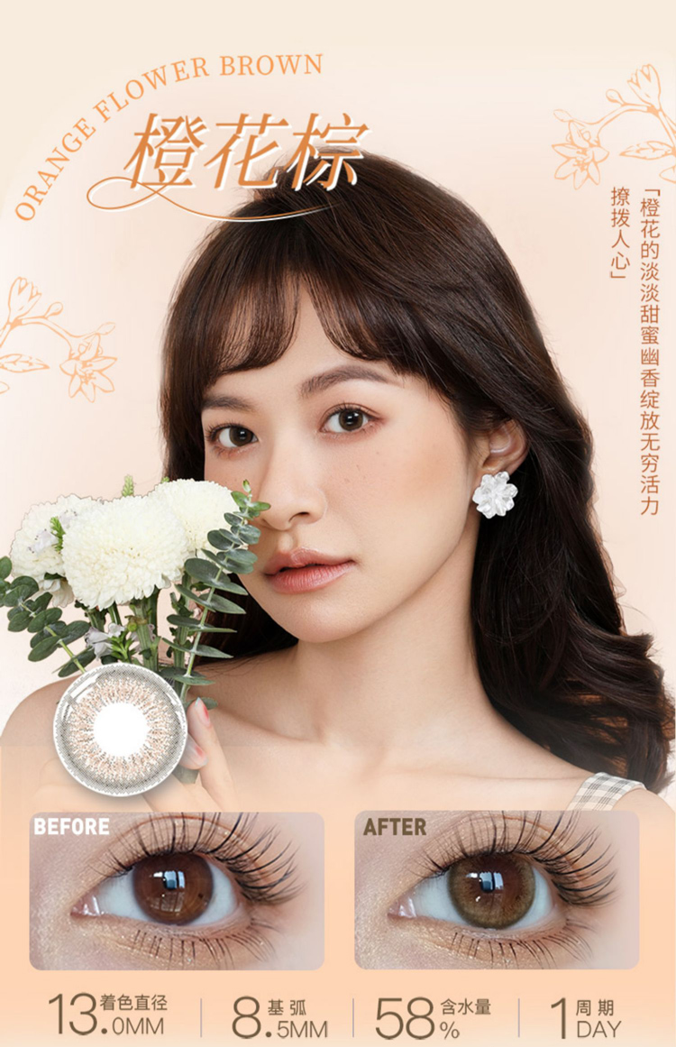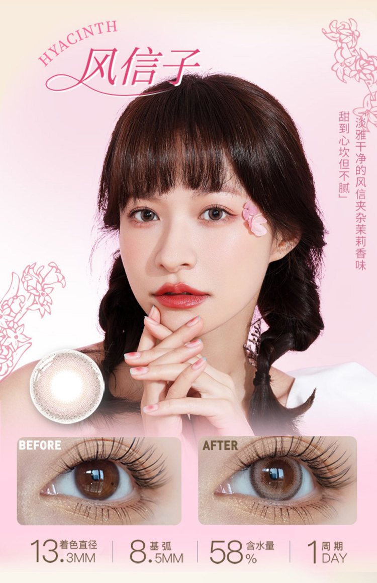 晶硕香水系列日抛10片装!推荐小豆蔻棕!黑兰花!含水量高达55%颜色自然,与你的眼睛完美融合,不会显得突兀。其次,它的舒适度极高,即使长时间佩戴也不会感到不适。最后,它的镜片材质采用的是高品质硅胶,不易破损,持久保持清晰度。
