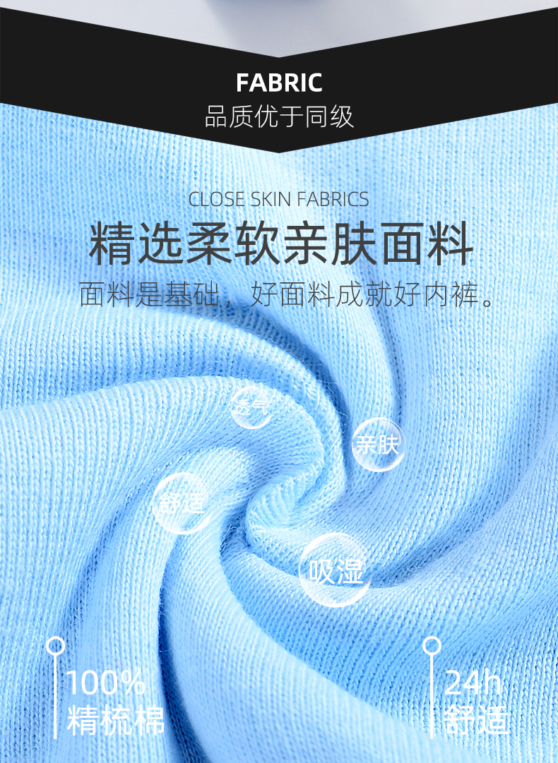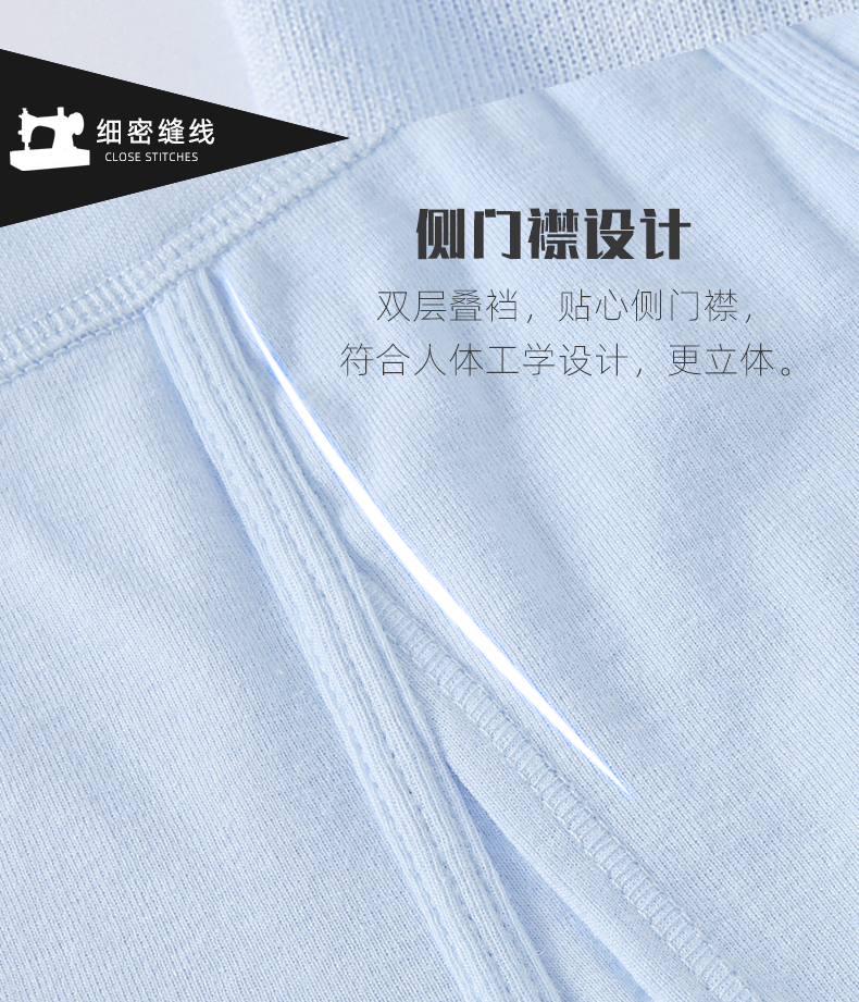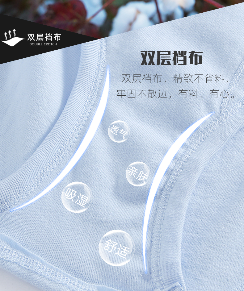精选柔软亲肤面料,面料是基础,好面料成就好内裤。健康环保升级材质,手感蓬松绵密柔软,透气排湿,弹力舒适,不掉色不变形不起球。双层叠裆,贴心侧门襟,符合人体工学设计,更立体。
