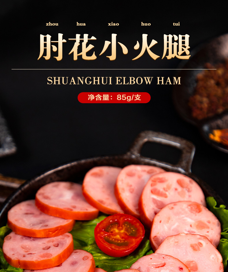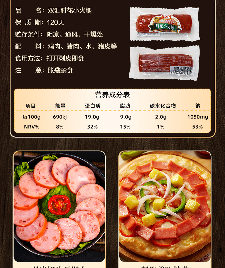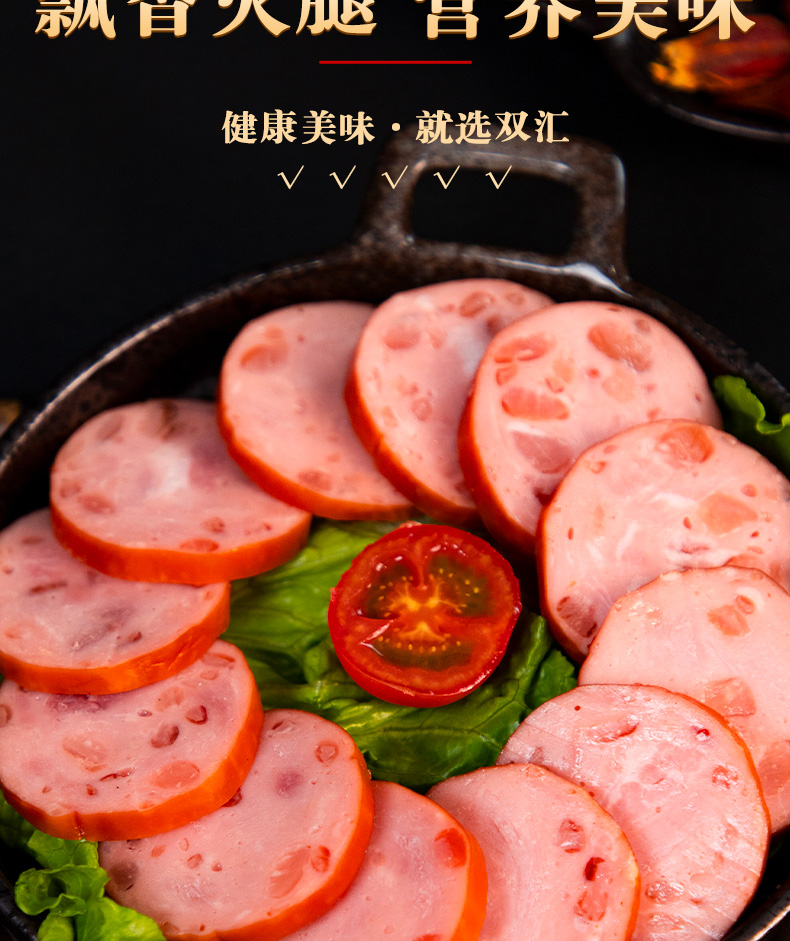 双汇纯肉肘花大火腿,肉质饱满,肉香浓郁,不添加淀粉,鲜嫩可口,富有嚼劲,靠谱原材料,真材实料看得见,制作火腿三明治,早餐三明治,美味披萨等必备