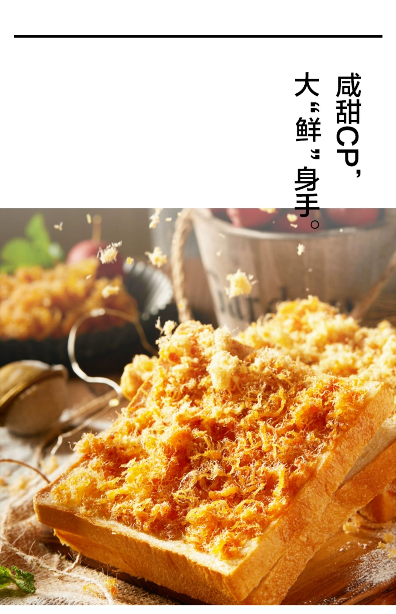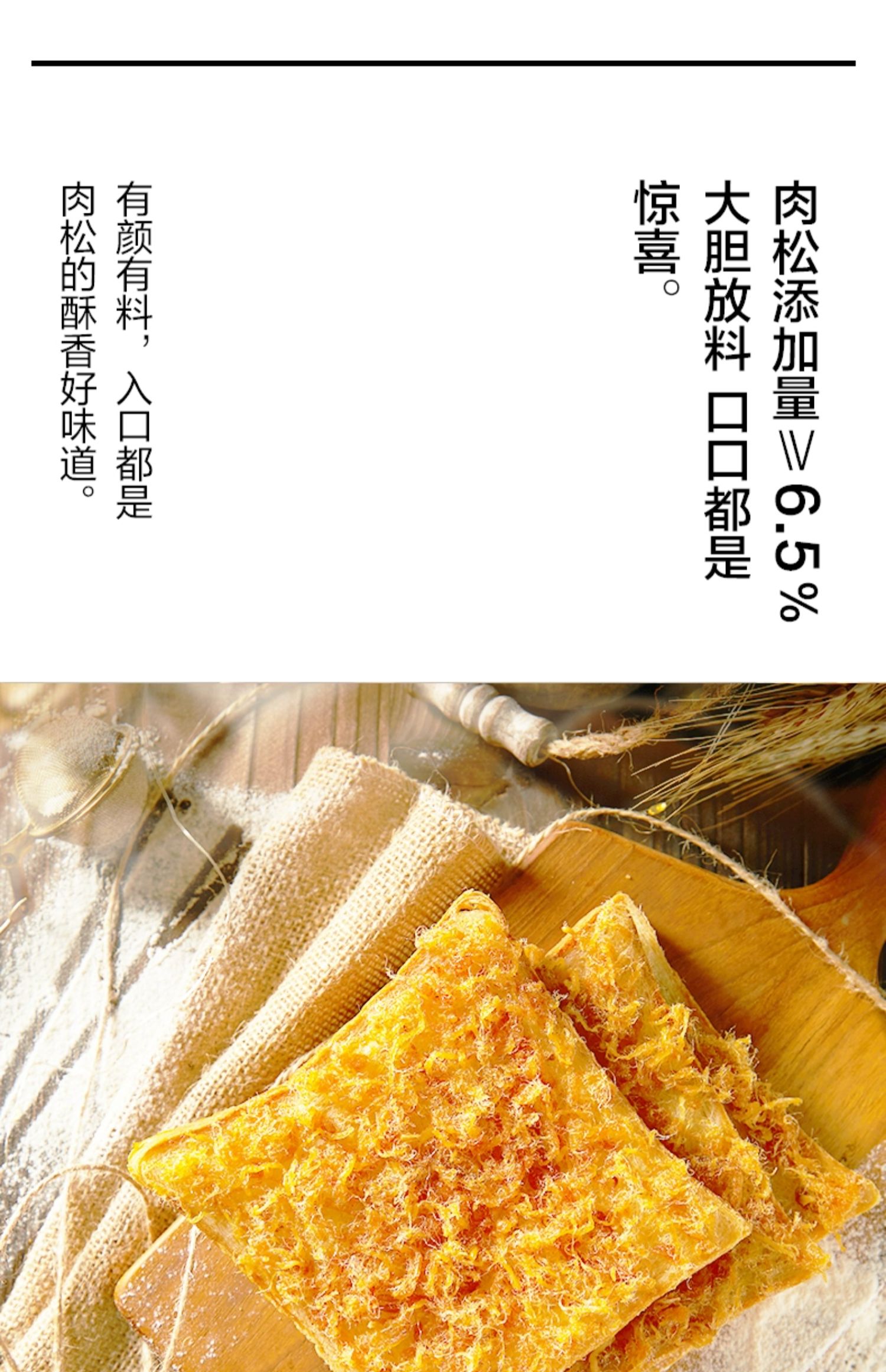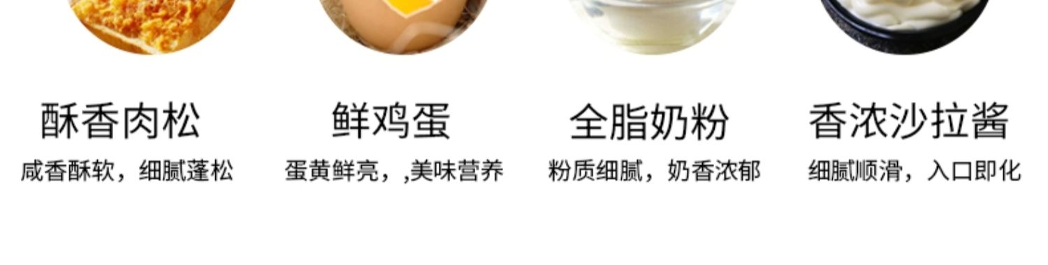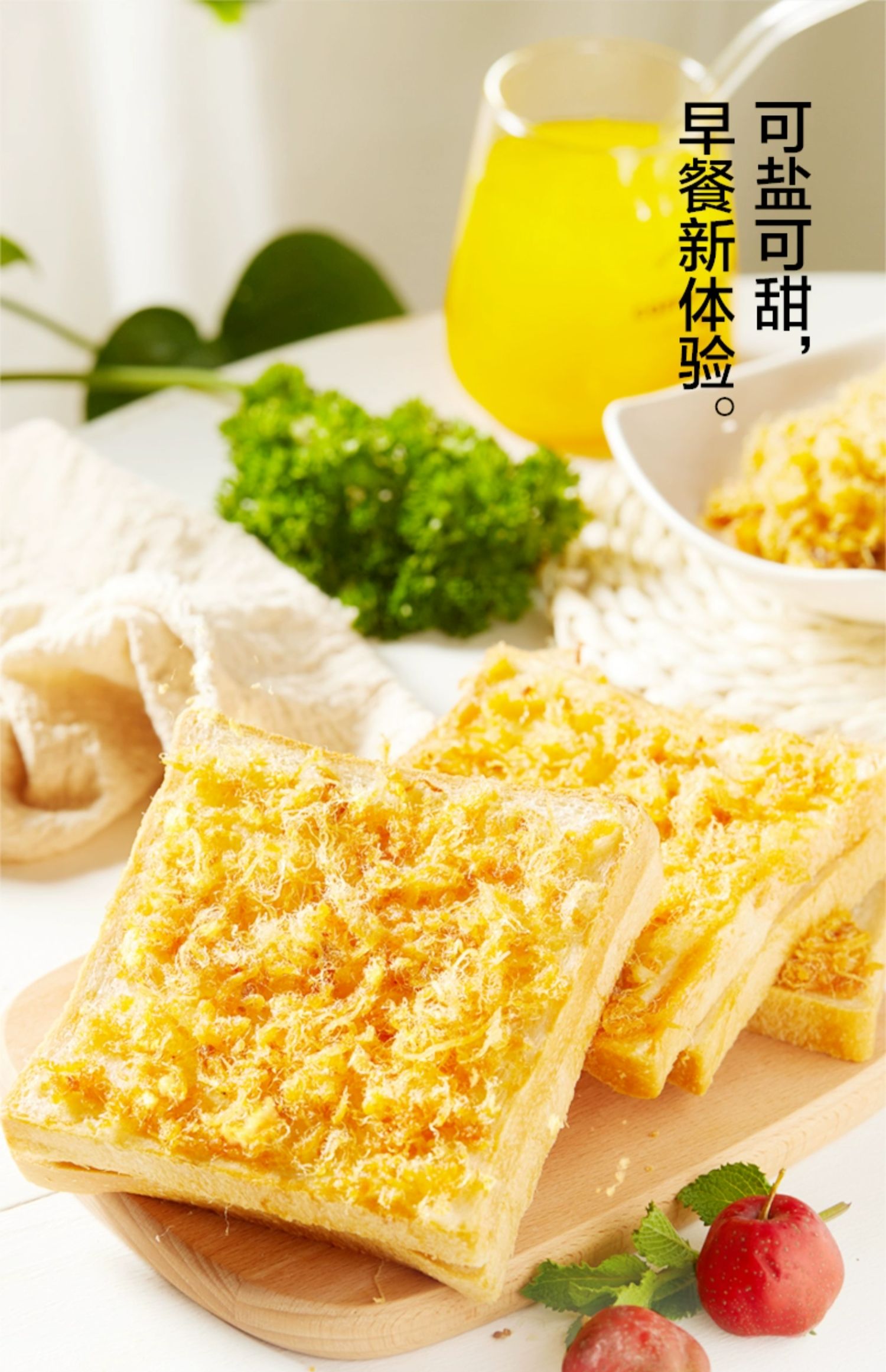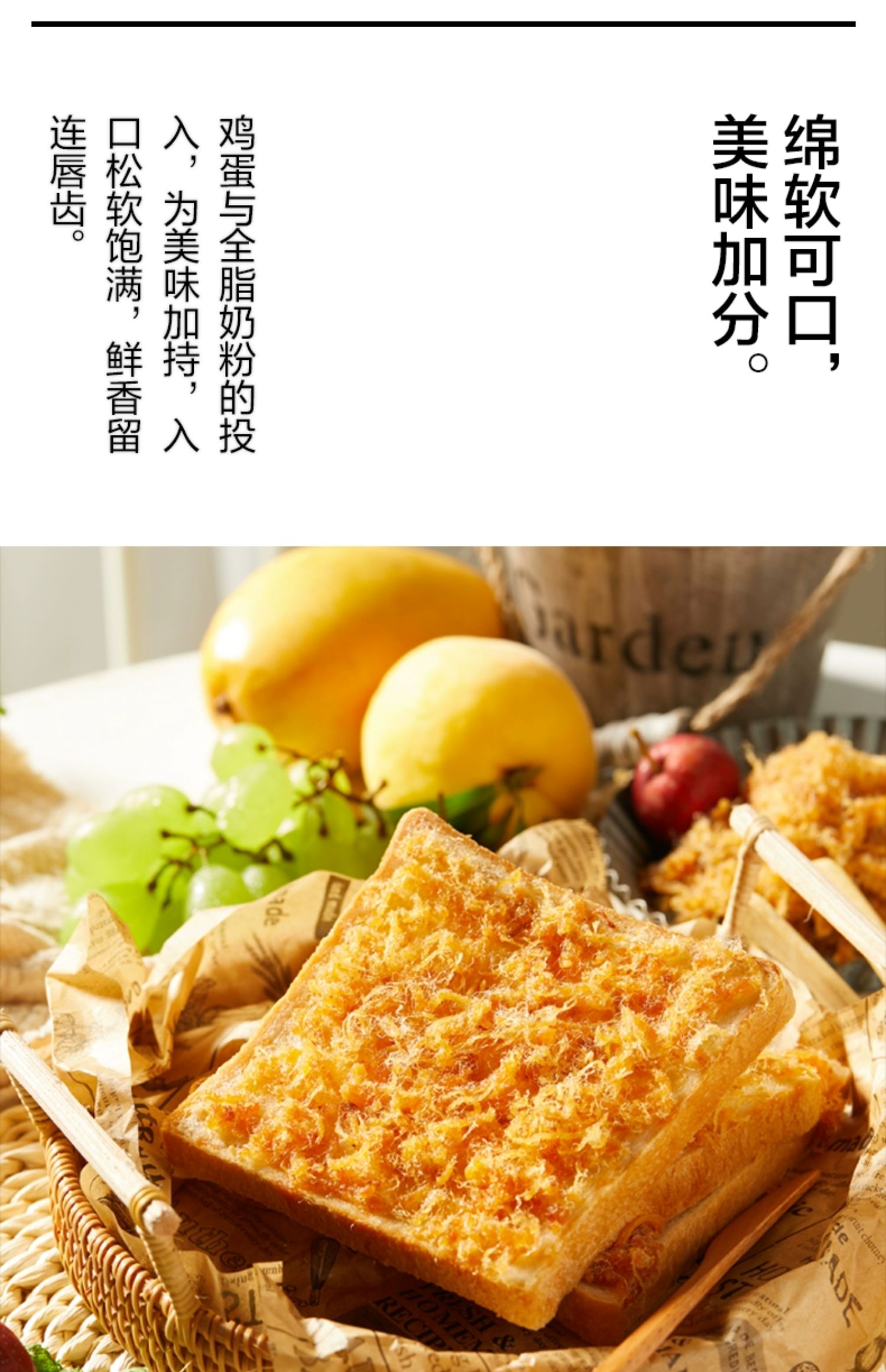 肉松和沙拉酱的完美结合,肉松量高达6%,口感蓬松绵软,咸中带甜,让人爱不释口!独立包装,方便携带,上班上学饿了来一口,是上班族学生党的必备小面包!