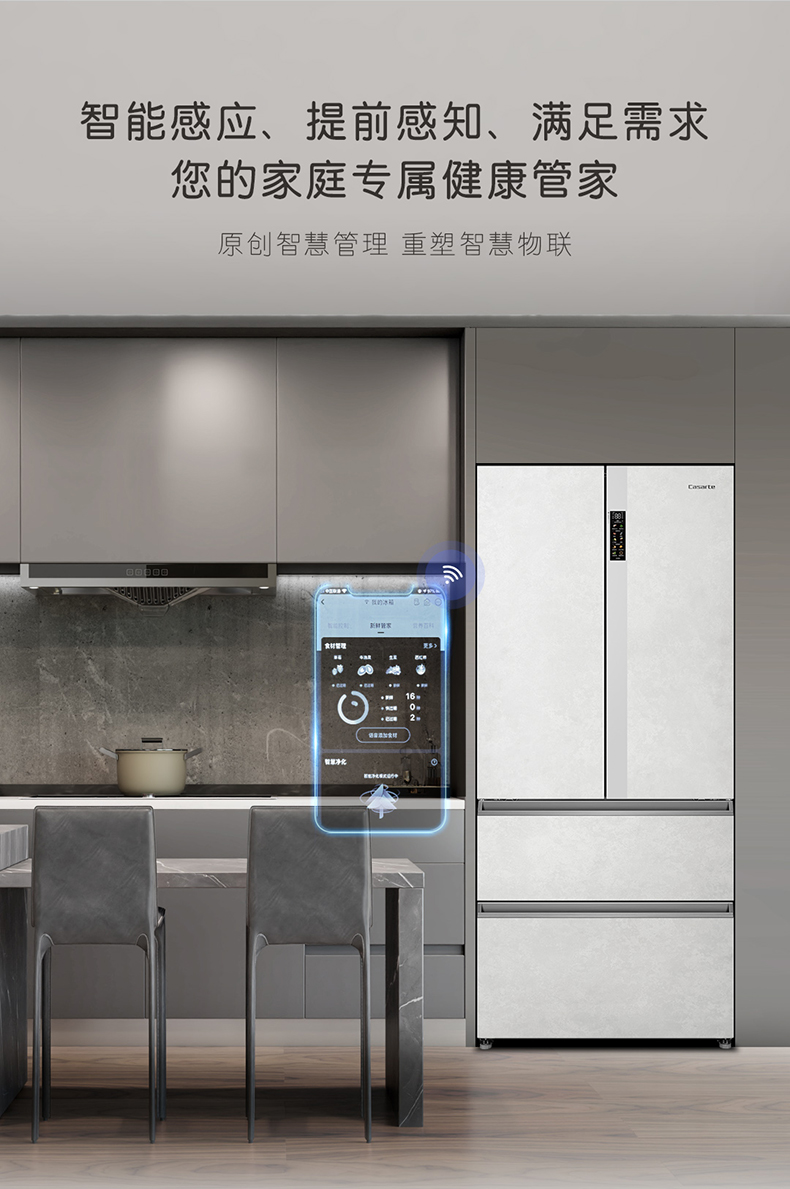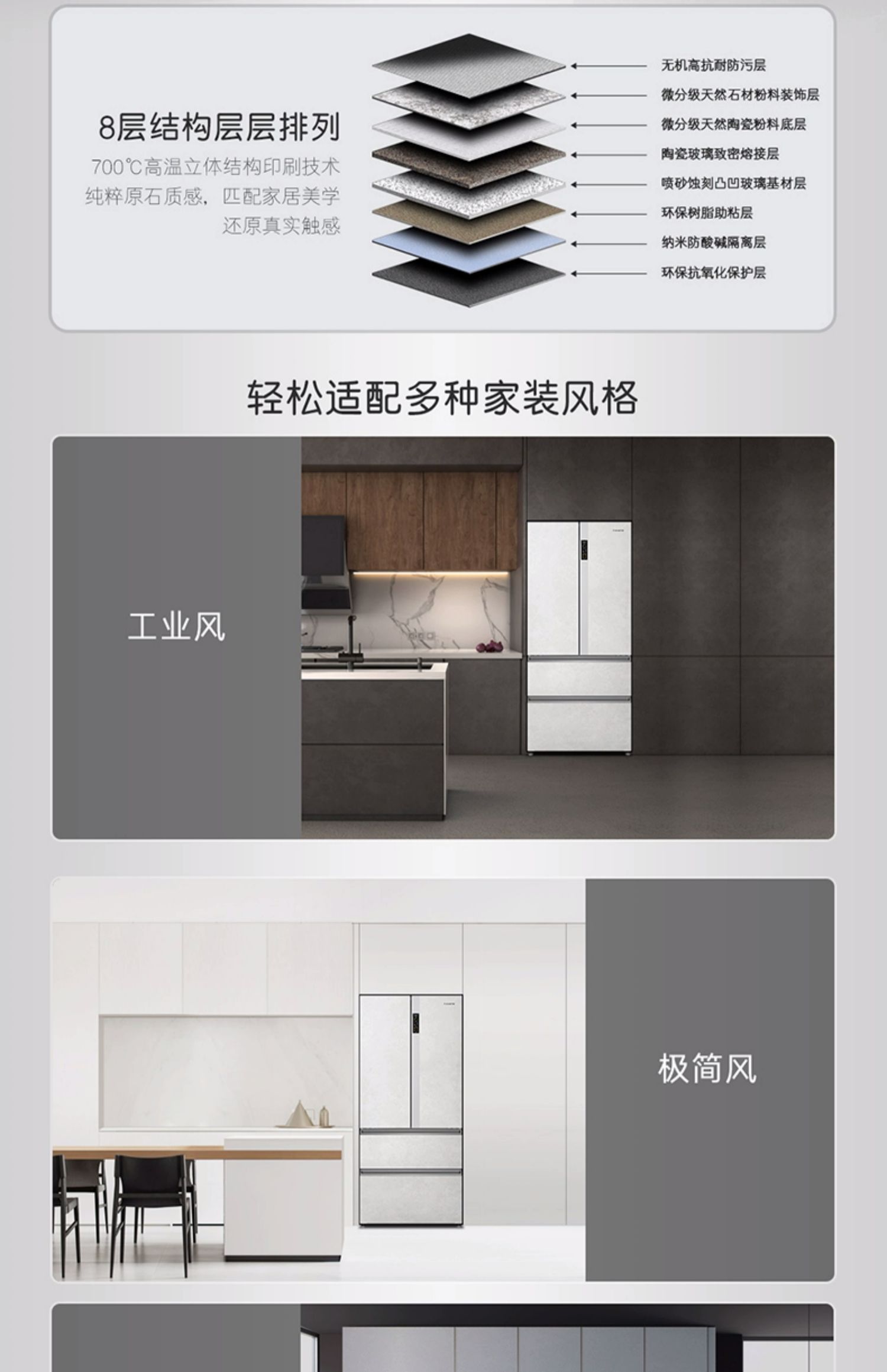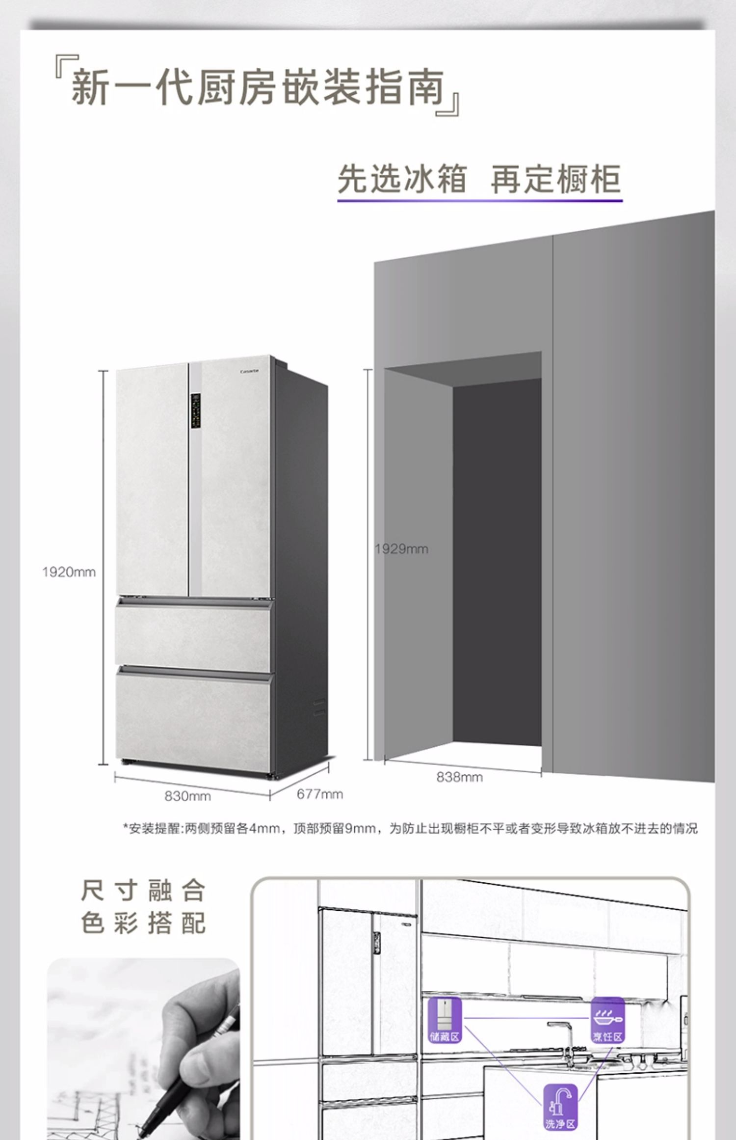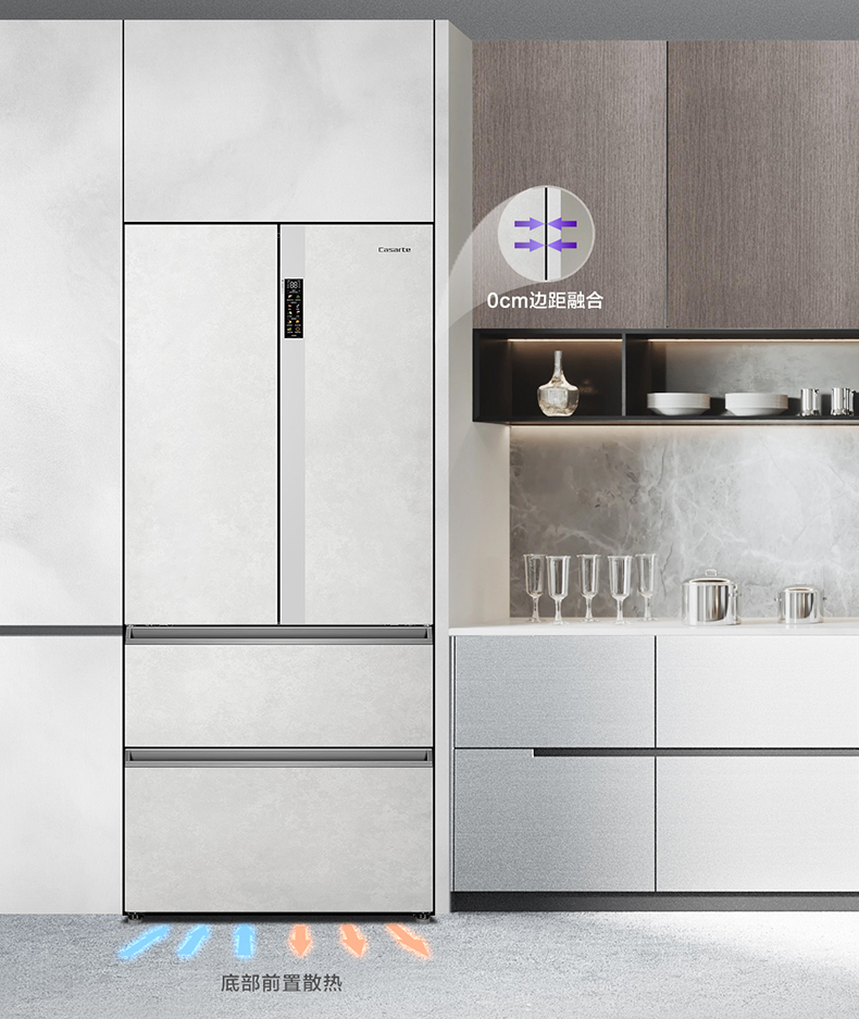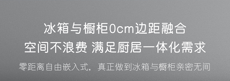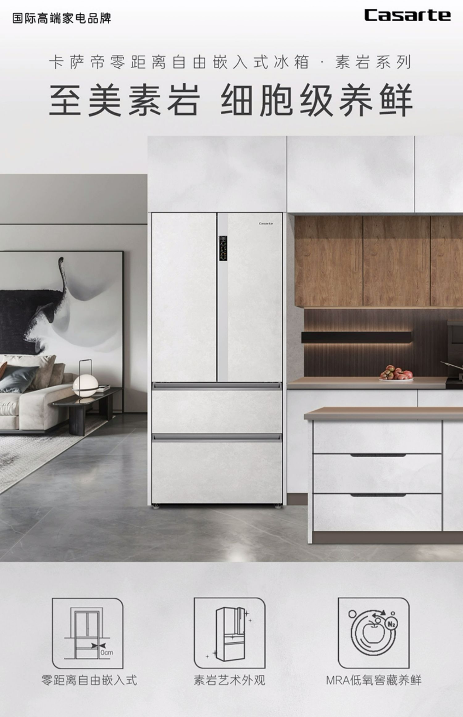卡萨帝零距离自由嵌入式冰箱.素岩系列零距离自由嵌入式,空间融合的秩序之美,冰箱与橱柜0cm无缝衔接,打造浑然一体的厨居空间。
