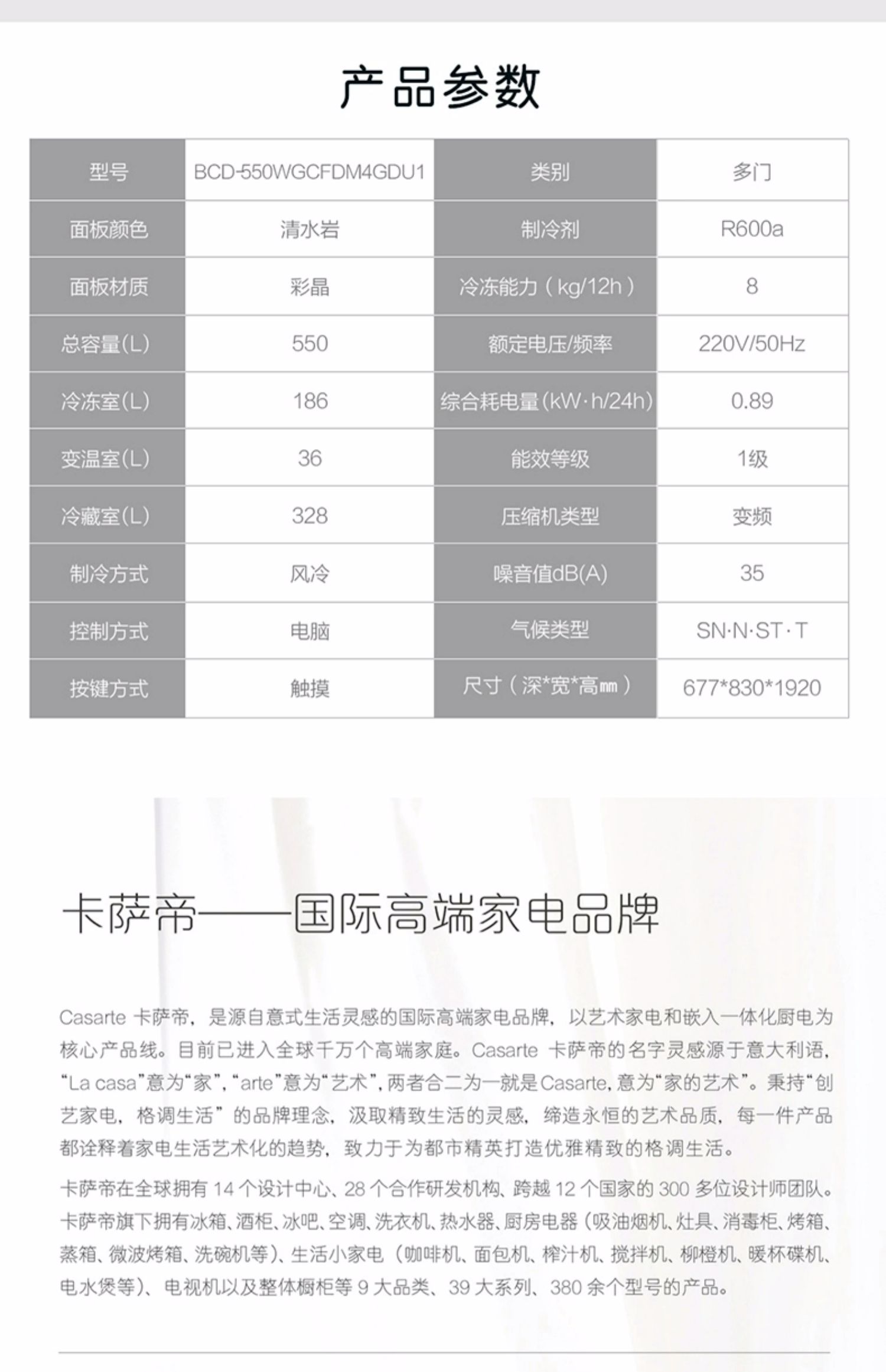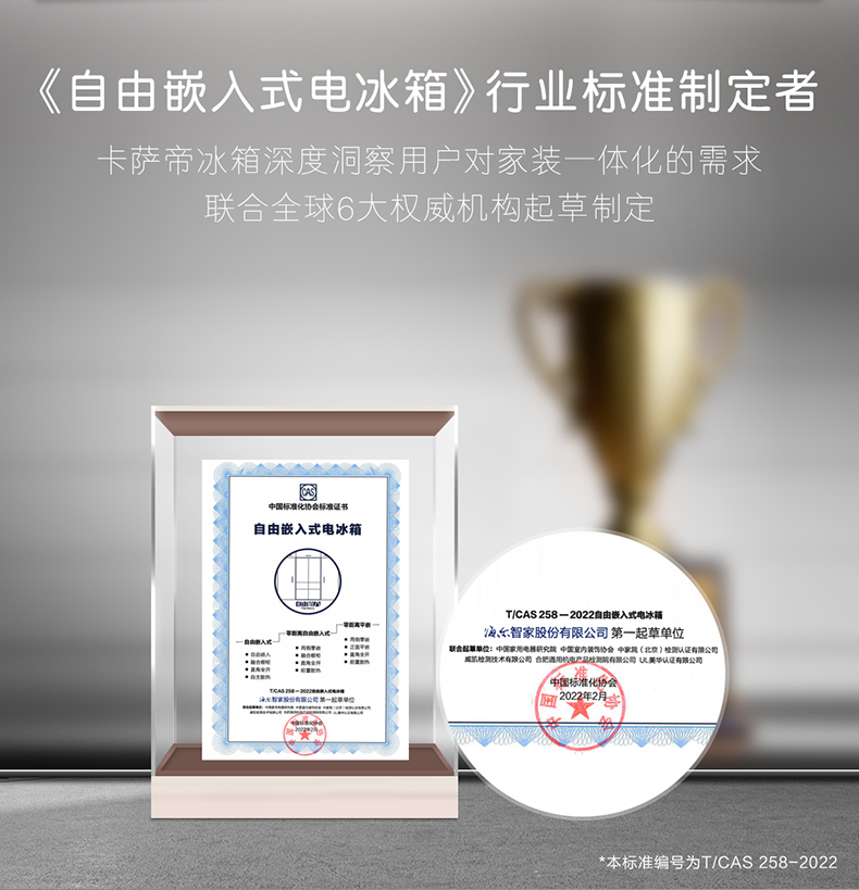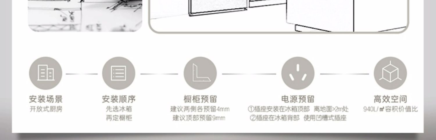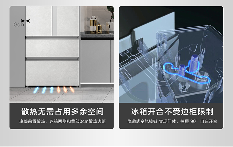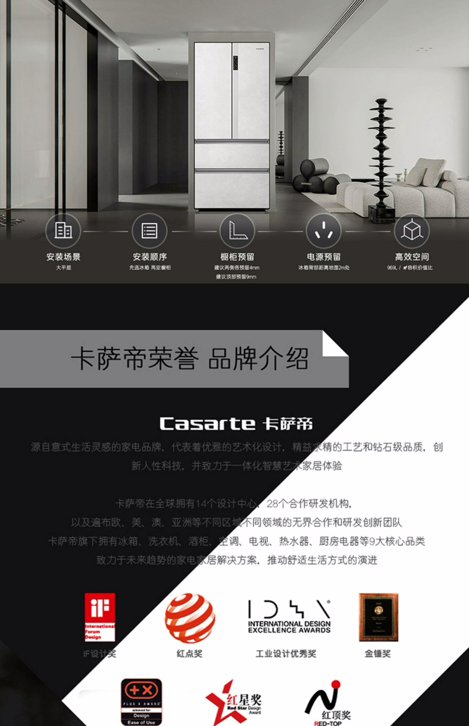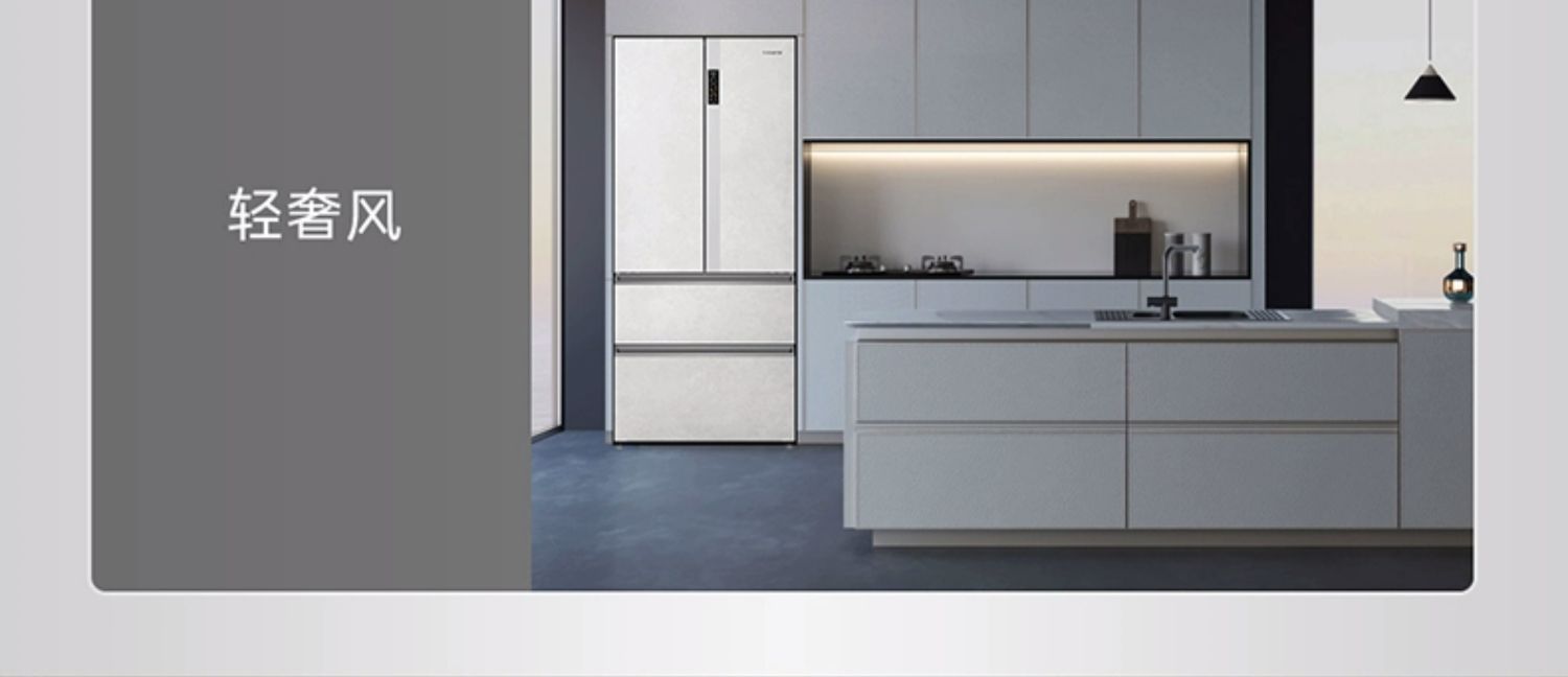 卡萨帝零距离自由嵌入式冰箱.素岩系列零距离自由嵌入式,空间融合的秩序之美,冰箱与橱柜0cm无缝衔接,打造浑然一体的厨居空间。