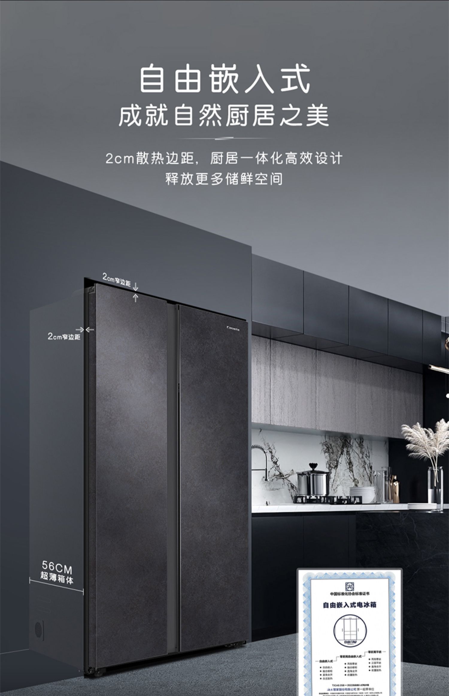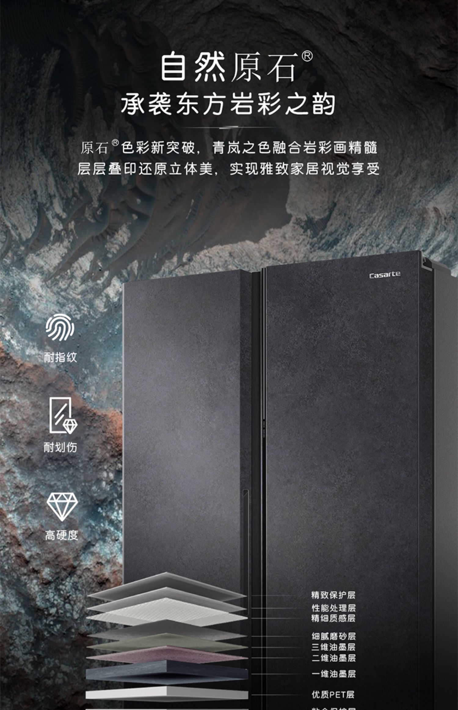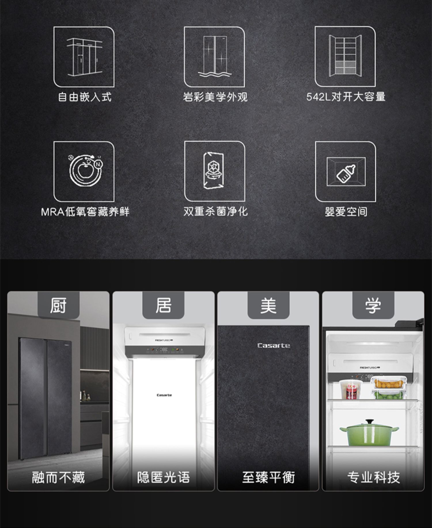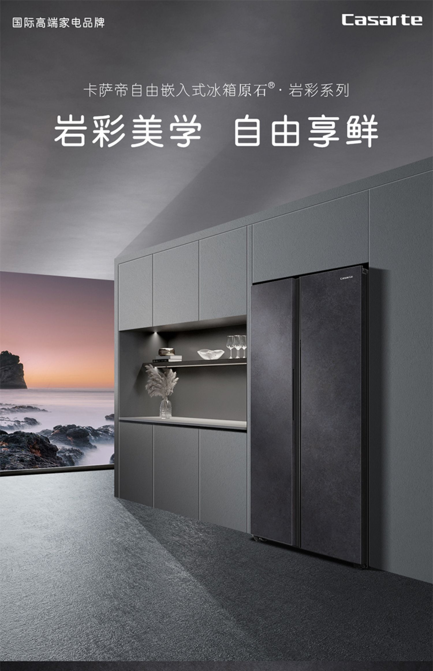 国际高端家电品牌!卡萨帝!自由嵌入式冰箱原石;岩彩系列,岩彩美学自由享鲜!自由嵌入式、岩彩美学外观、542L对开大容量、MRA低氧窖藏养鲜、双重杀菌净化、婴爱空间。