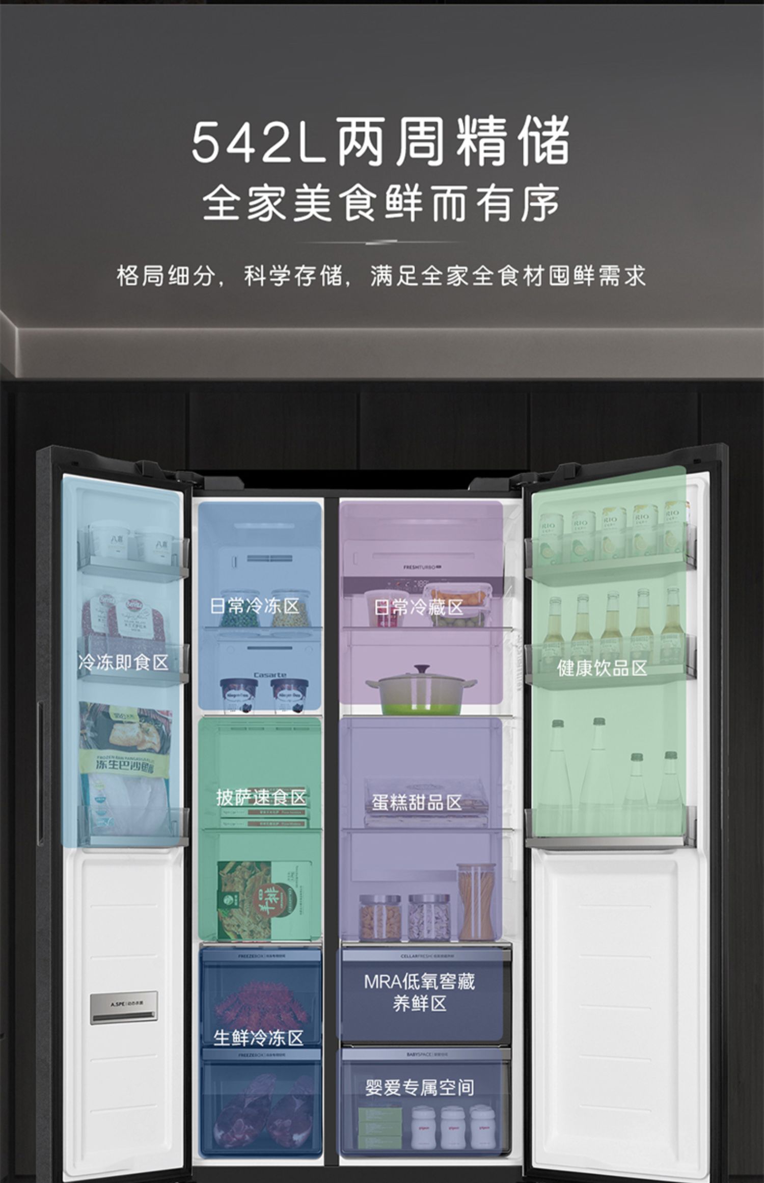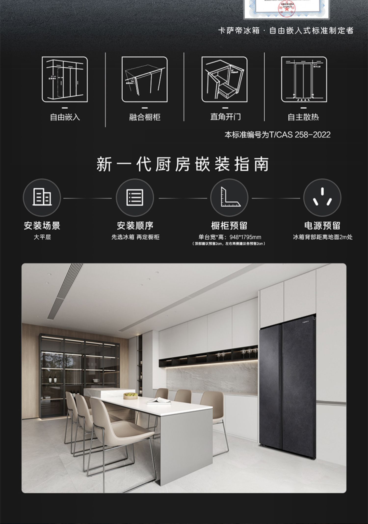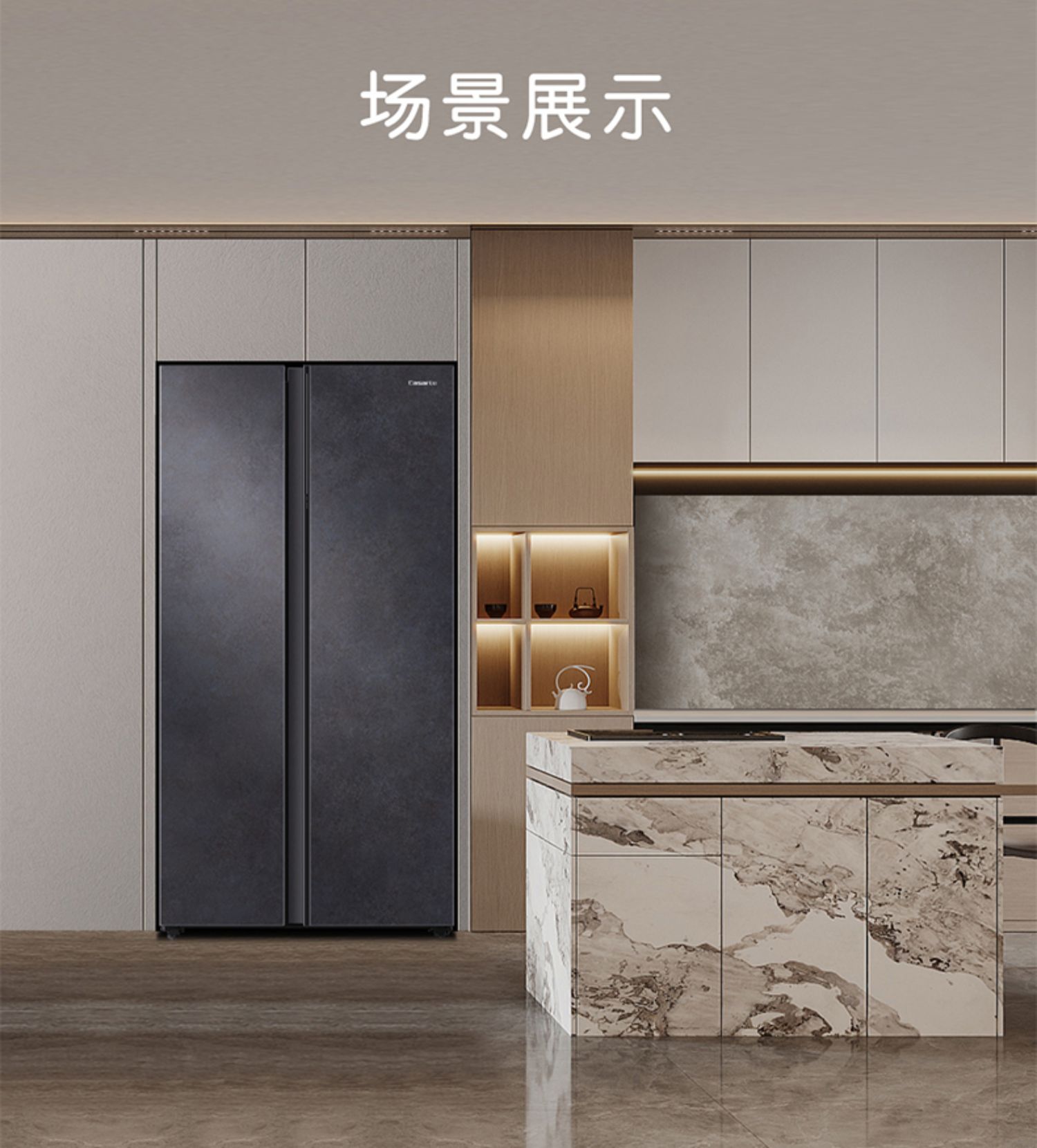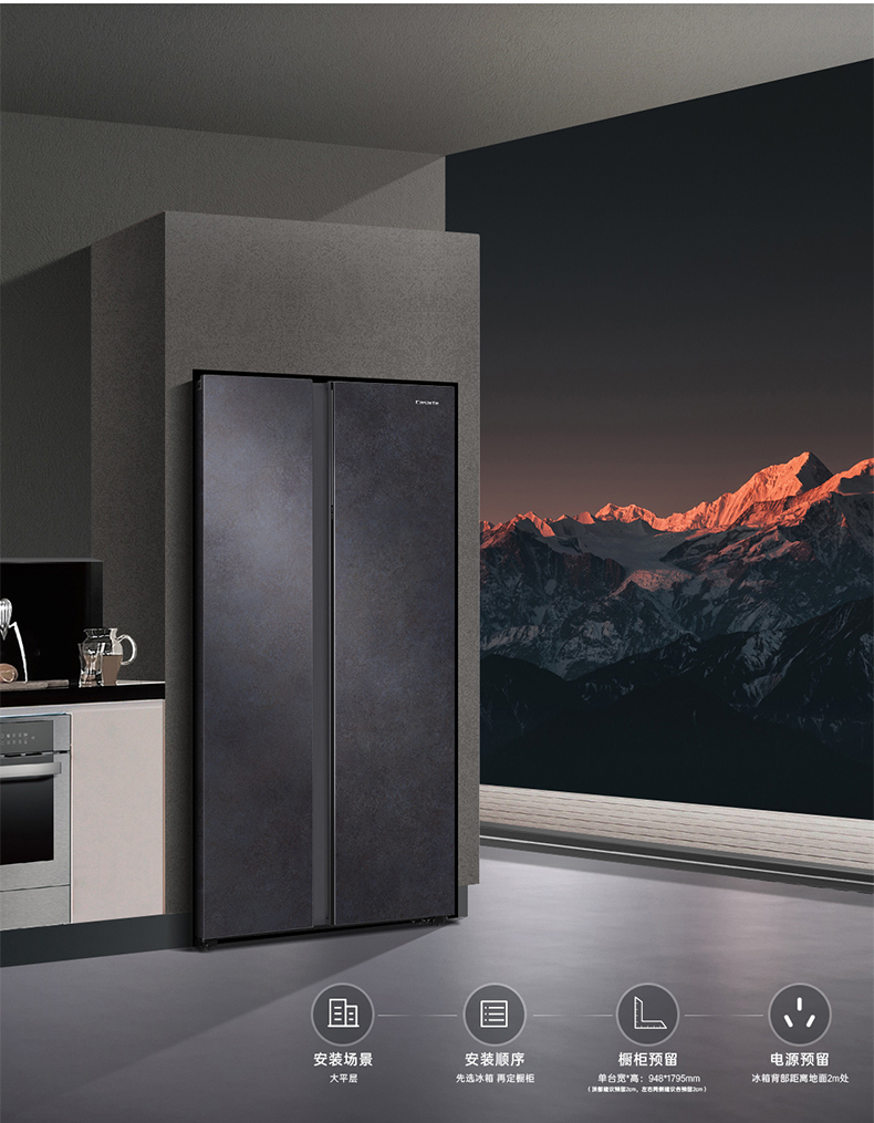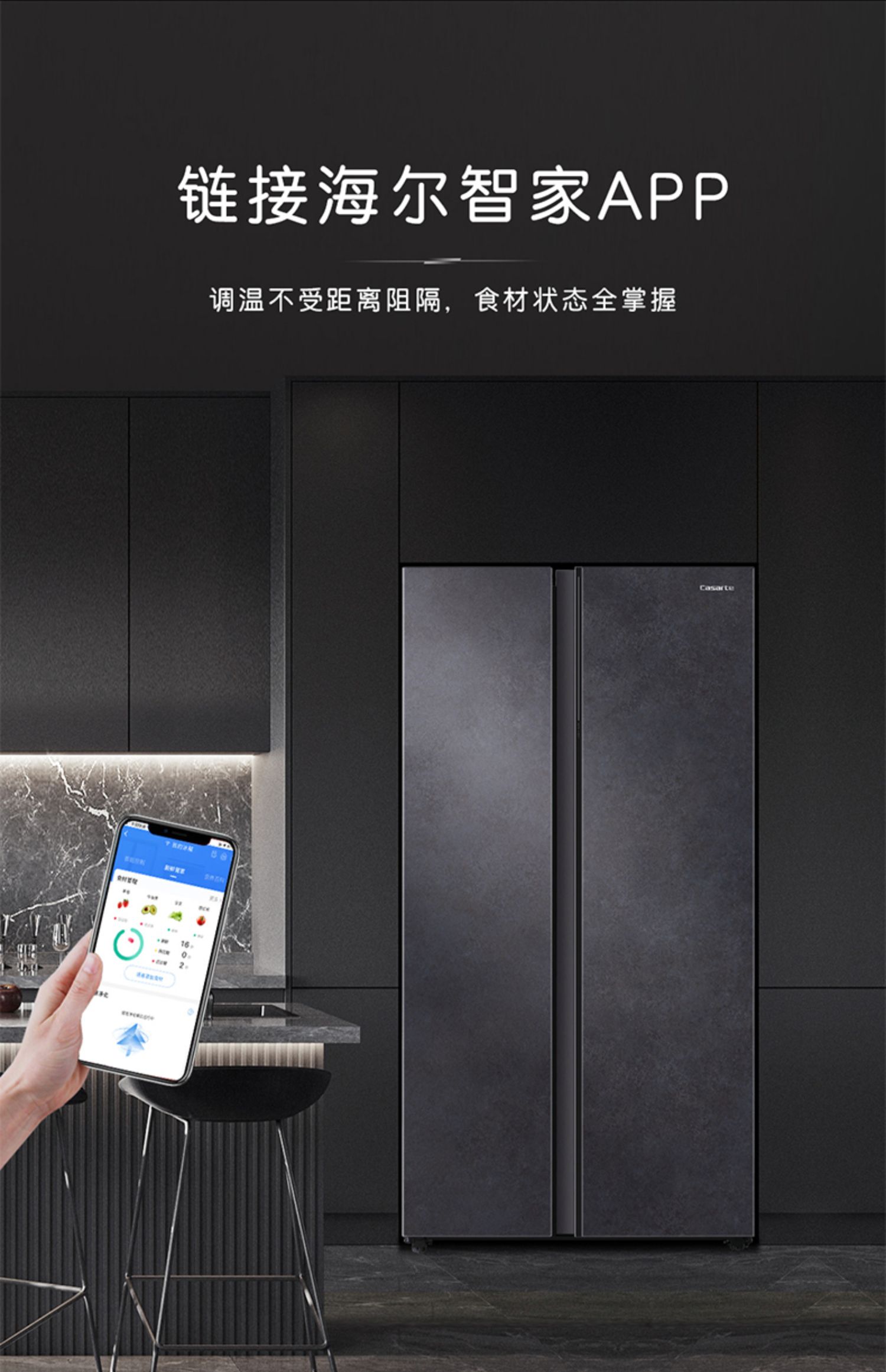 国际高端家电品牌!卡萨帝!自由嵌入式冰箱原石;岩彩系列,岩彩美学自由享鲜!自由嵌入式、岩彩美学外观、542L对开大容量、MRA低氧窖藏养鲜、双重杀菌净化、婴爱空间。