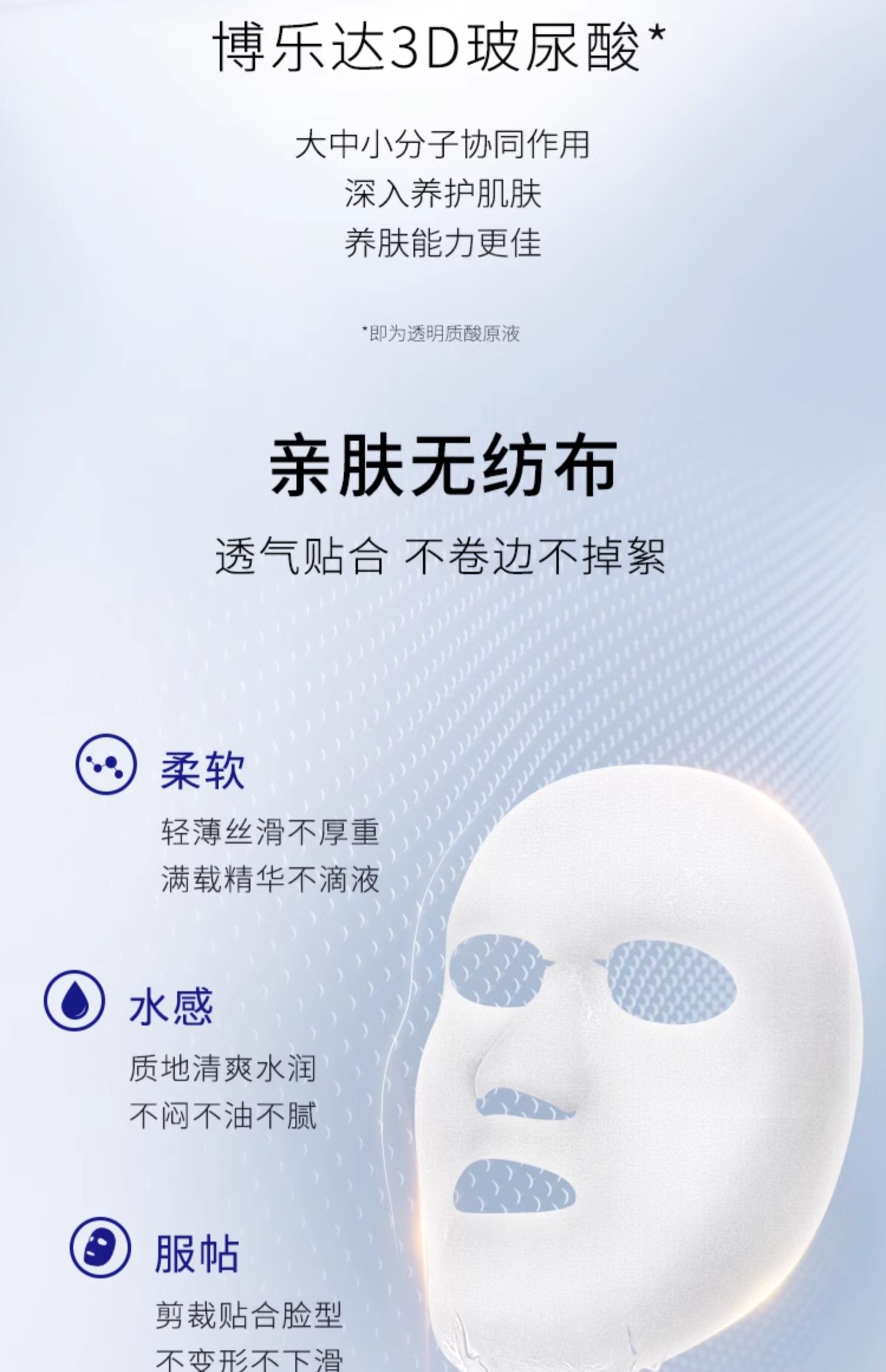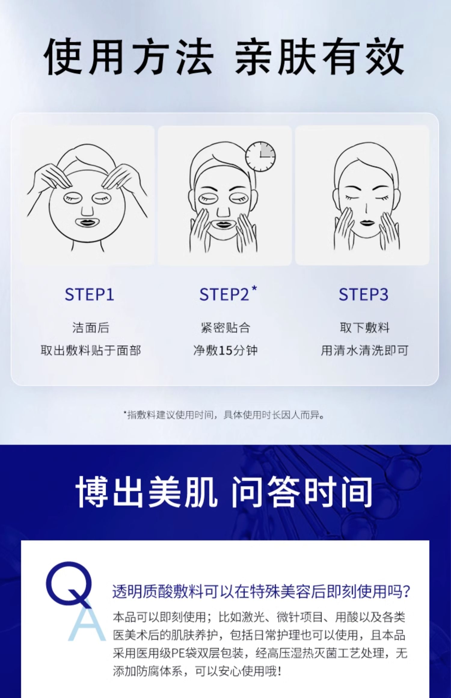 【送洁面巾*1】爱做医美的宝宝们,应该是老朋友了吧!!博乐达透明质酸敷主要是针对 术后人群,皮肤特殊时期伤口敏感脆弱的宝宝们!!产品安全级别高,专业度强!! 能起到即刻镇痛补水,再也不会烦恼脸会红通通的了!!