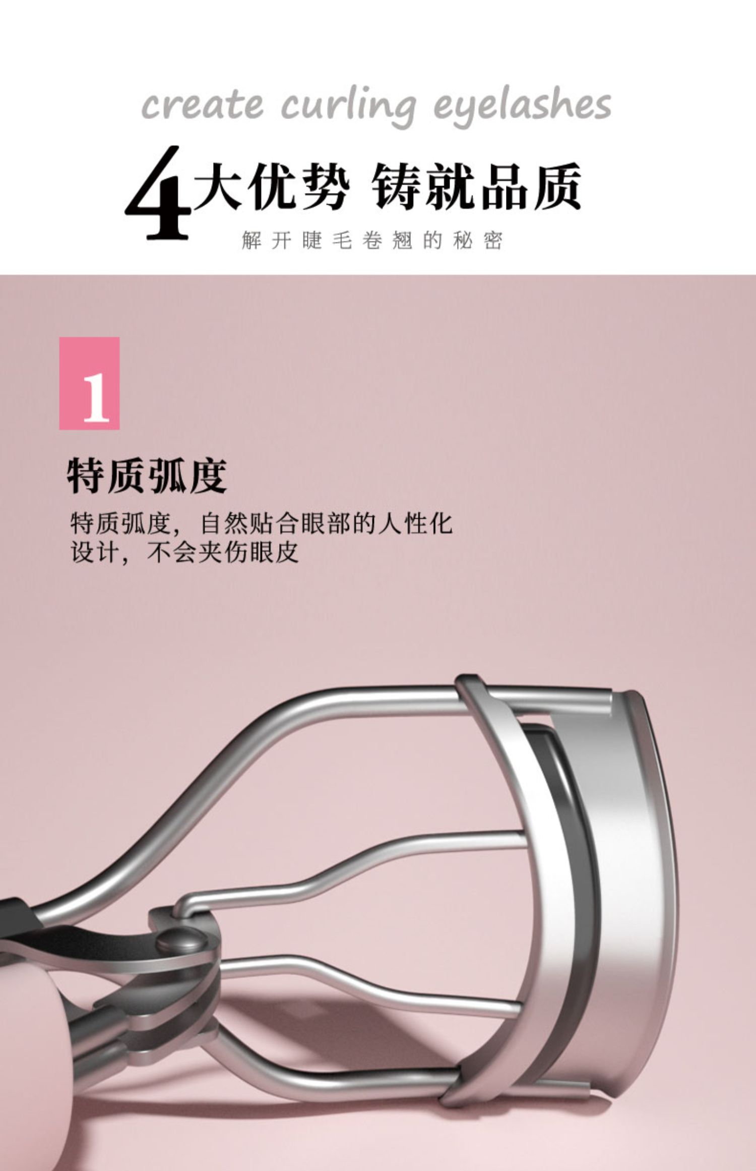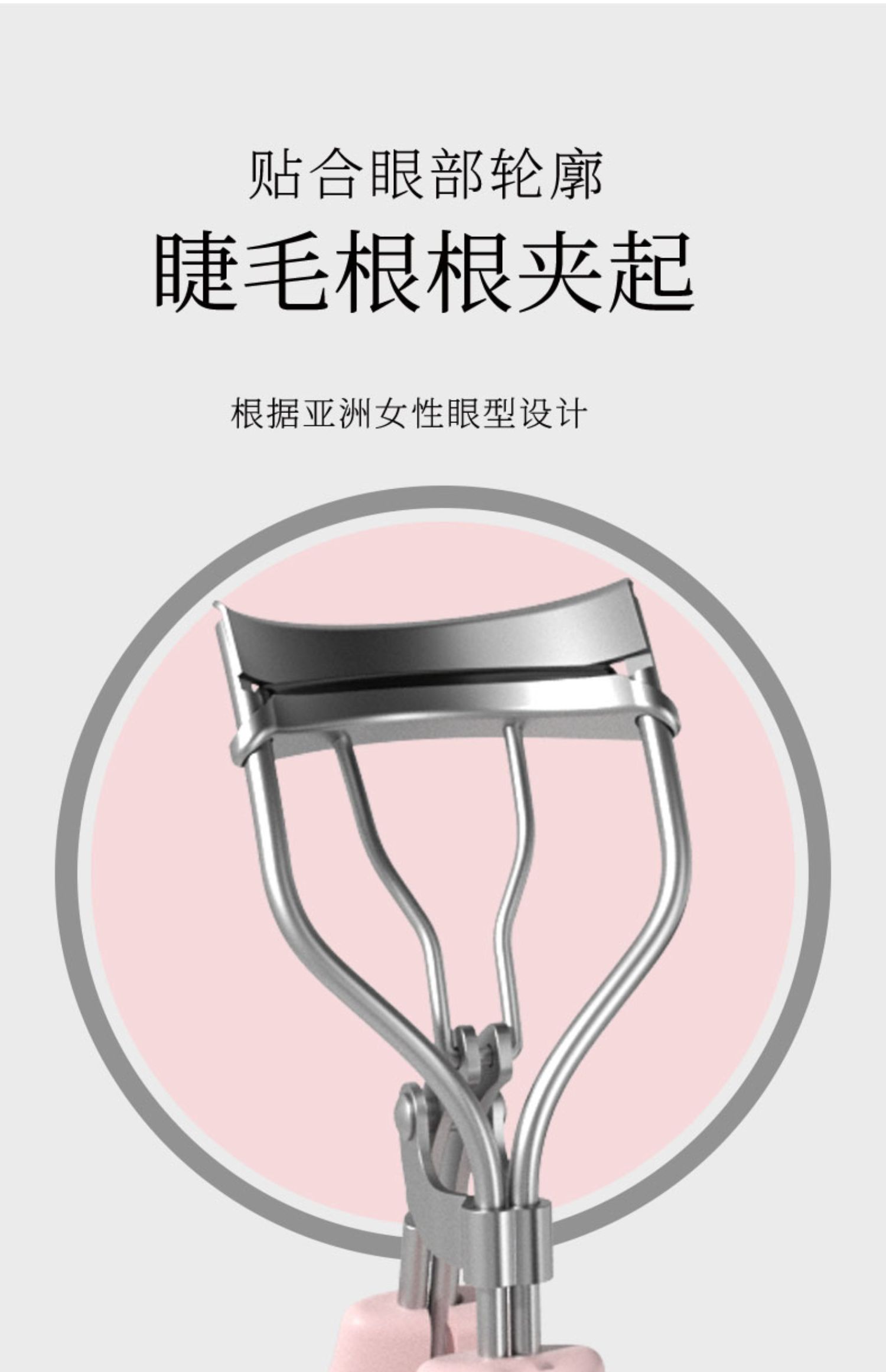 匠心设计,独特夹片弧线,轻松夹翘睫毛,贴合眼型,不夹眼皮,舒适手柄,拿捏自如,精巧外型不占空间!