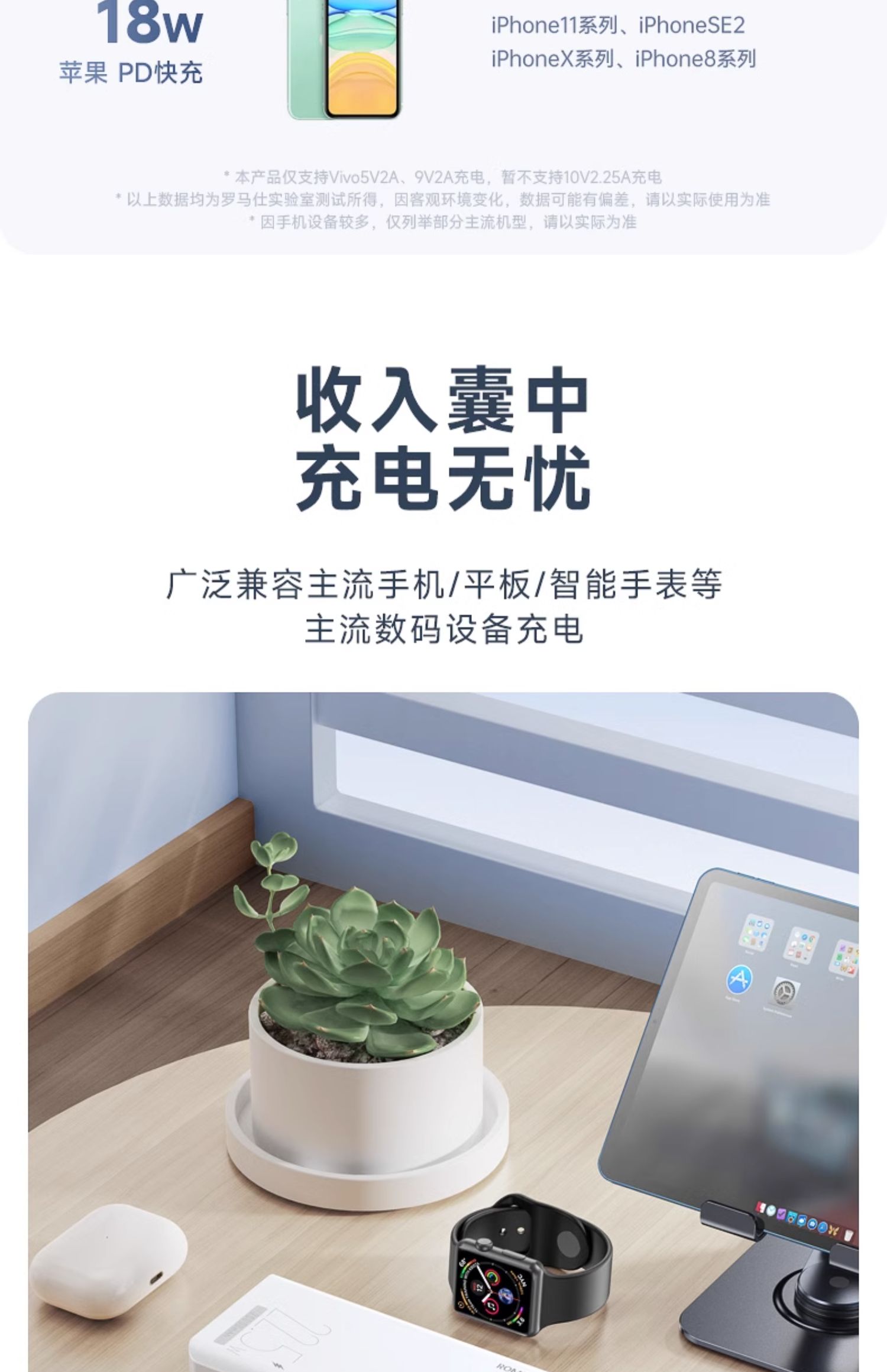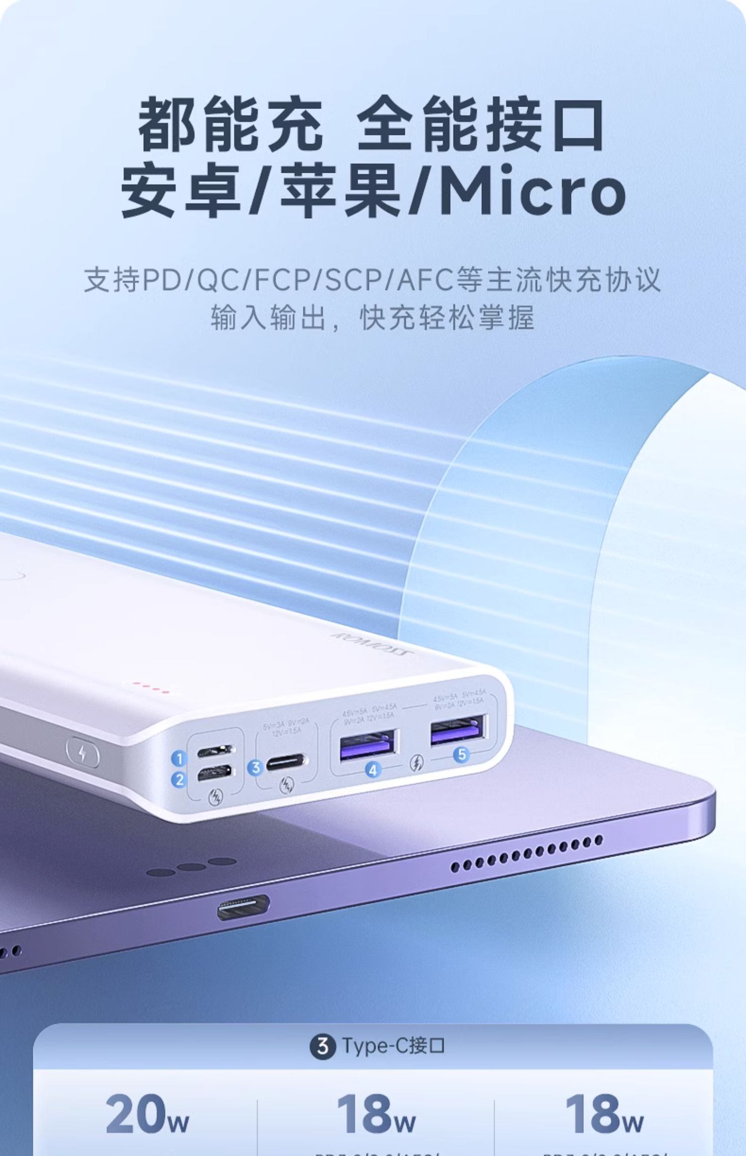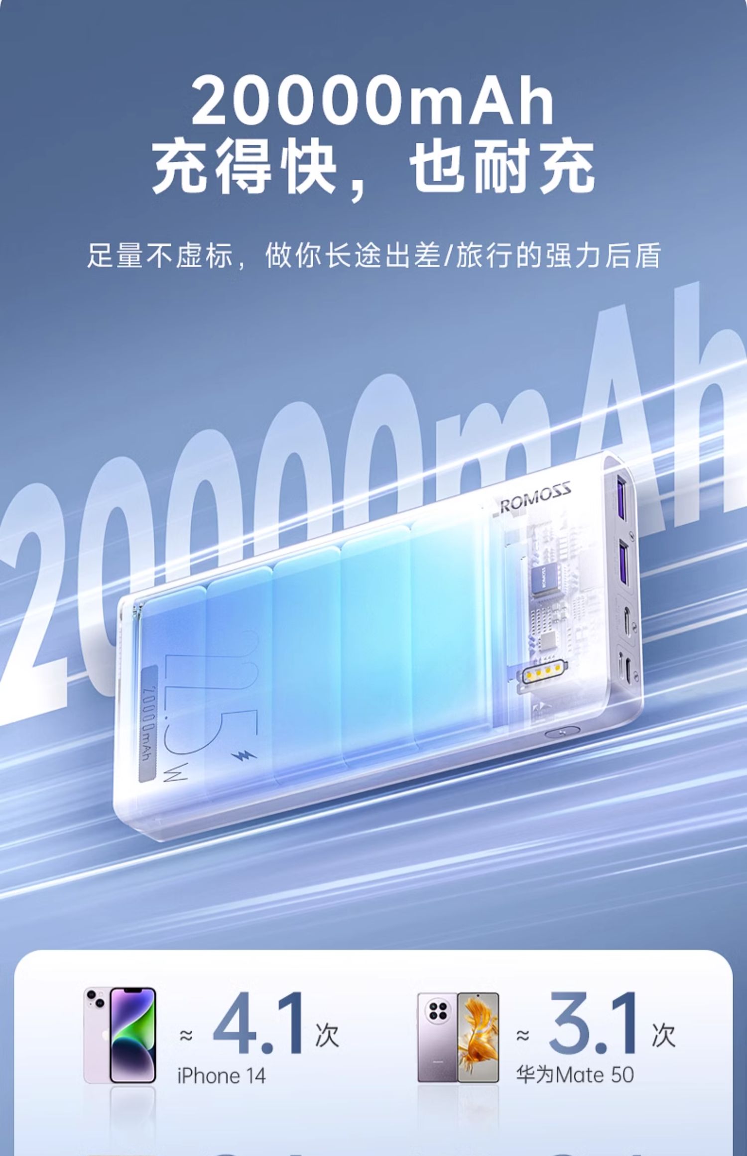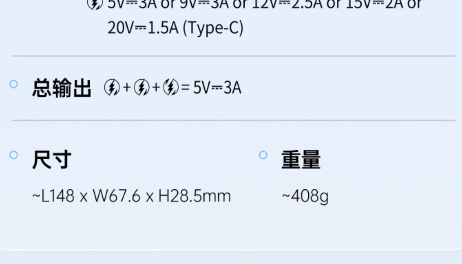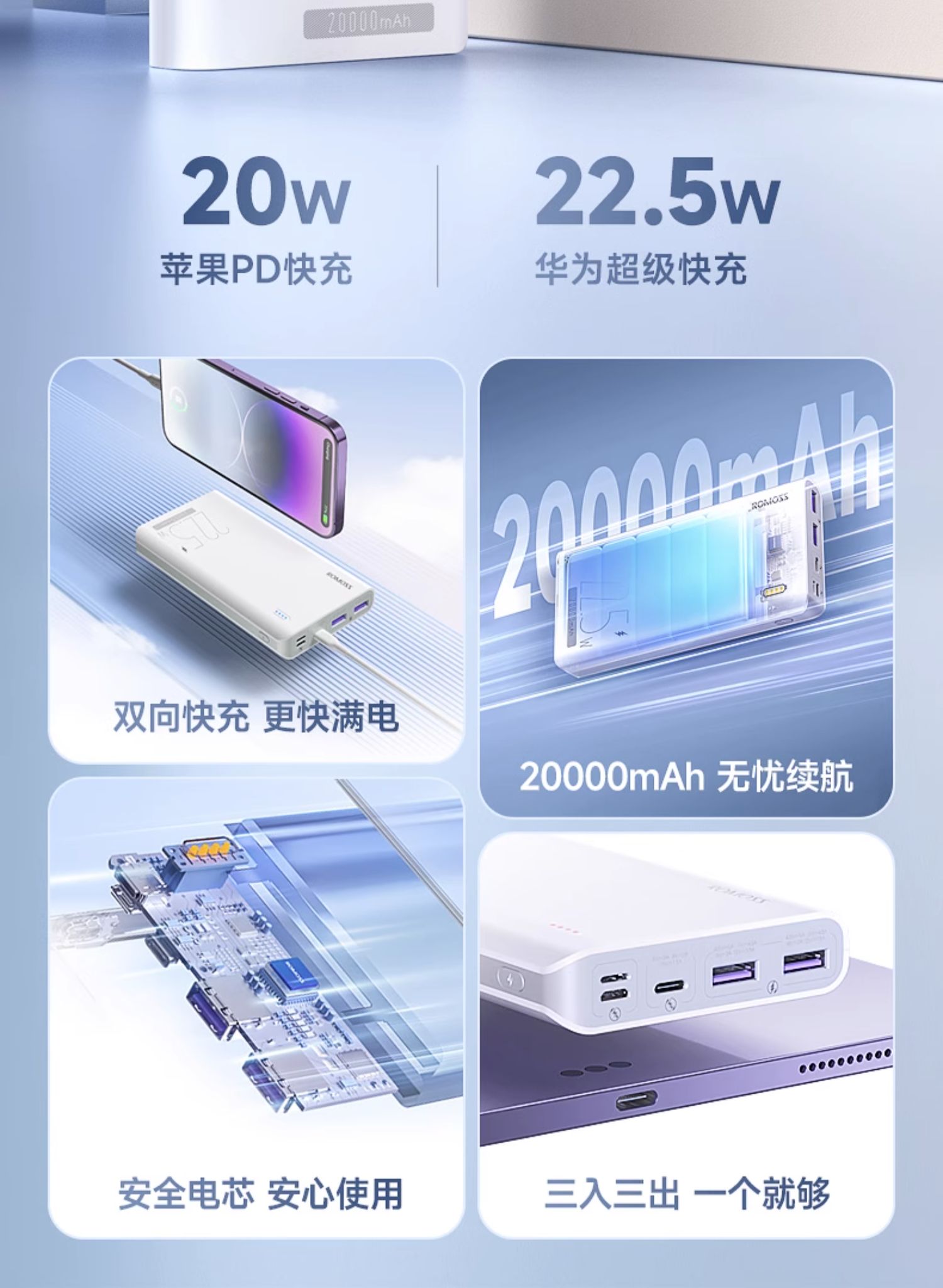 20000mAh 大容量,坐飞机可携带,充一次可用一周,再也不用担心随身携带,支持2A快充,双USB输出口,快速充电,防摔角保护,日常出门必备~