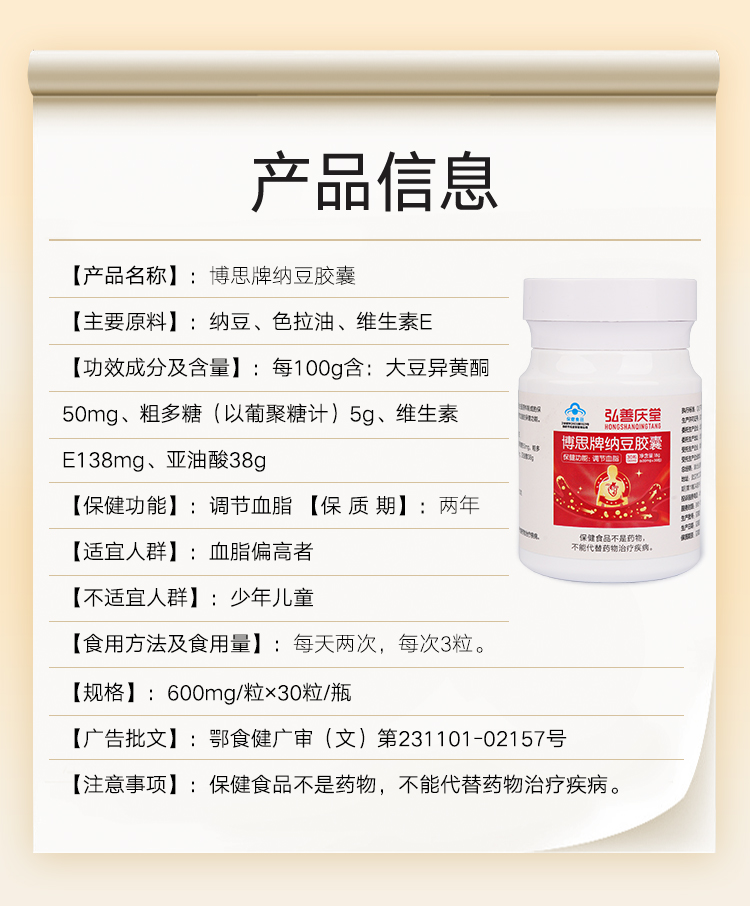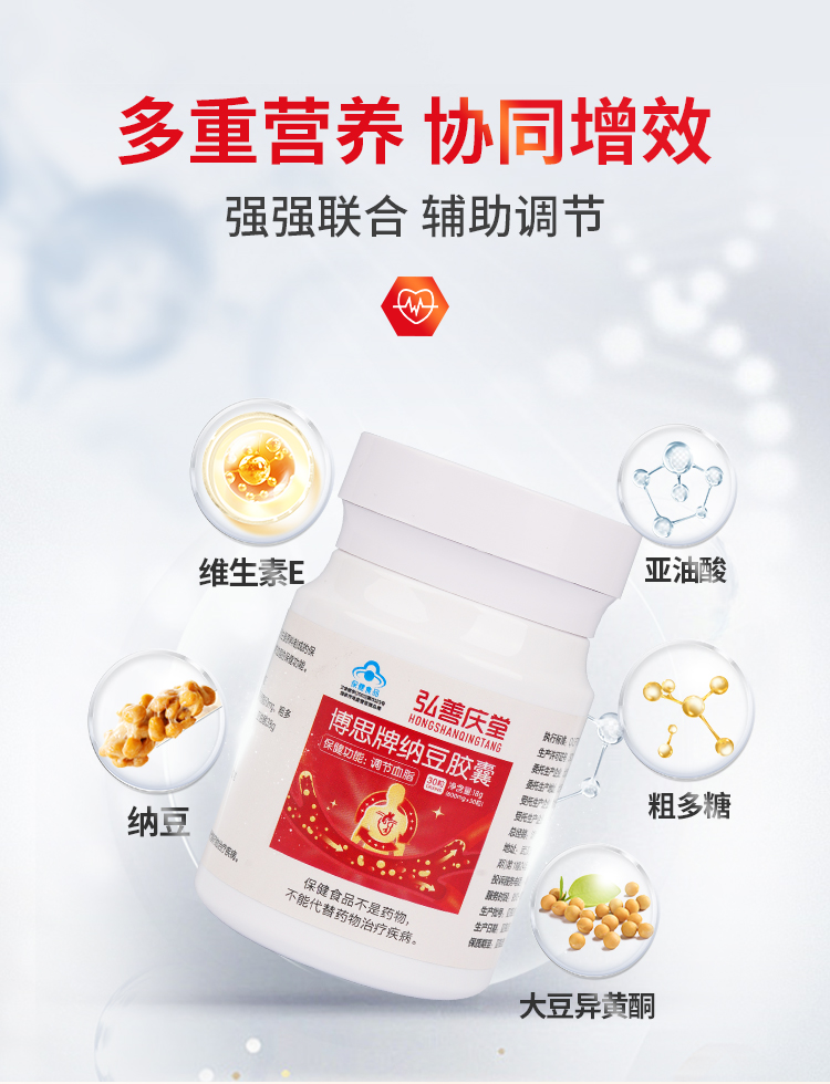 【每200减20,店铺券满6.01减6】弘善庆堂博思牌纳豆胶囊凝胶辅助调节血脂蓝帽认证品质保证,适用血脂偏高人群,权威质检,品质放心~