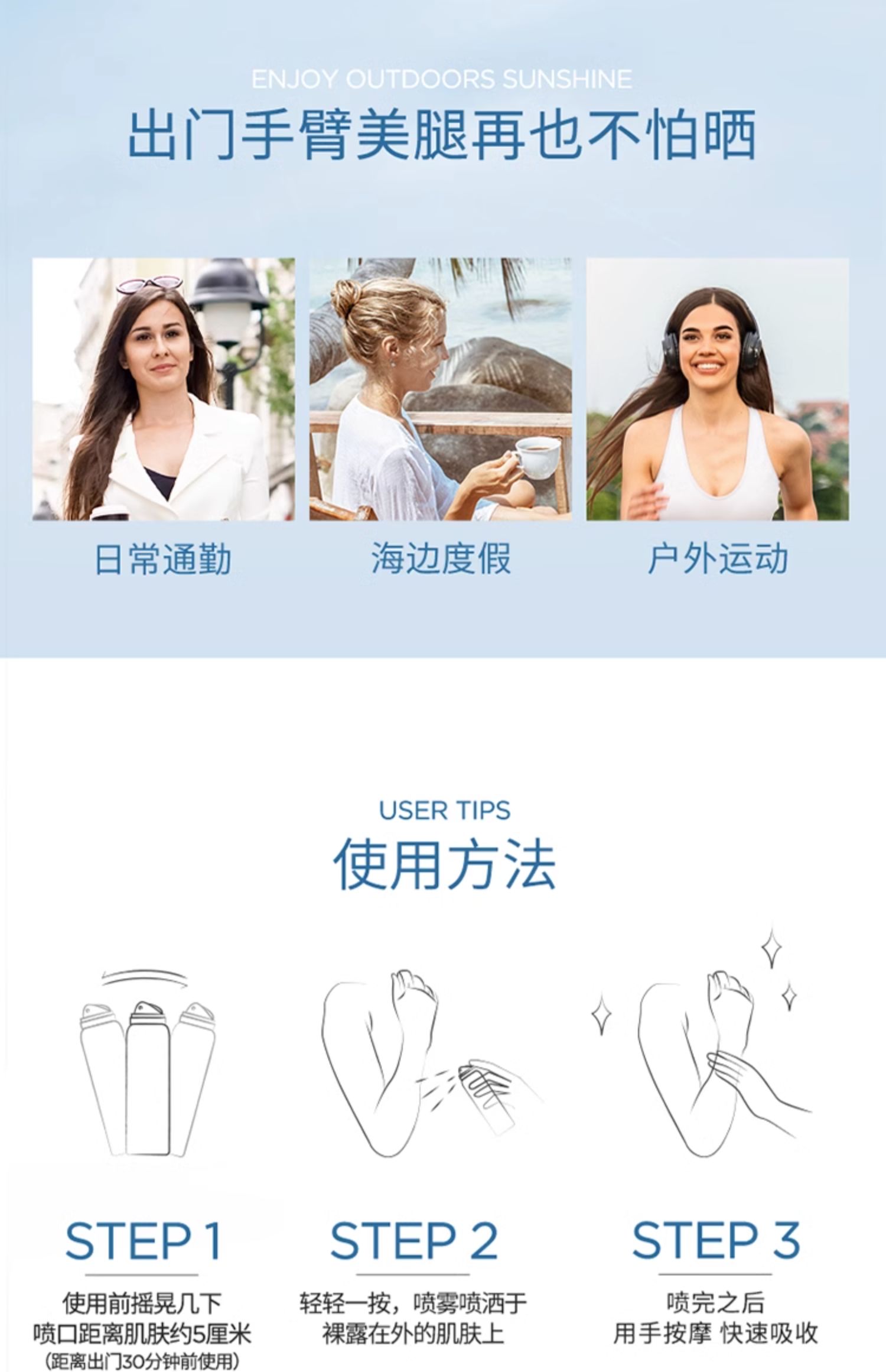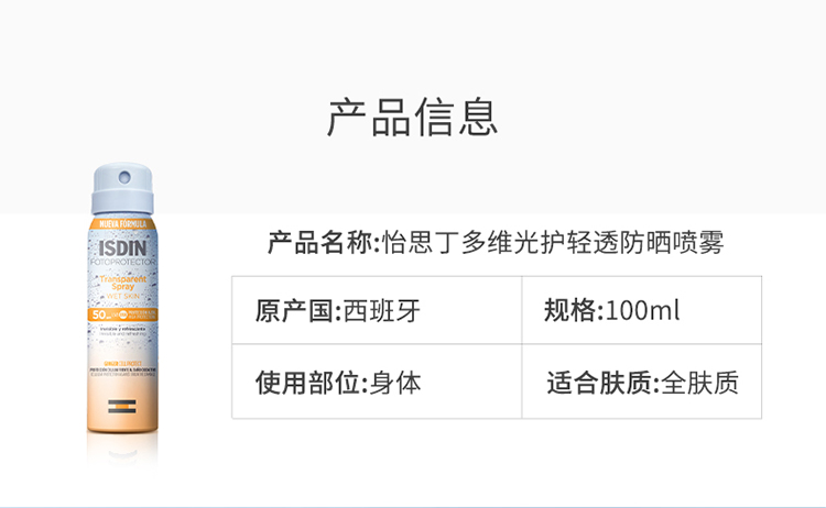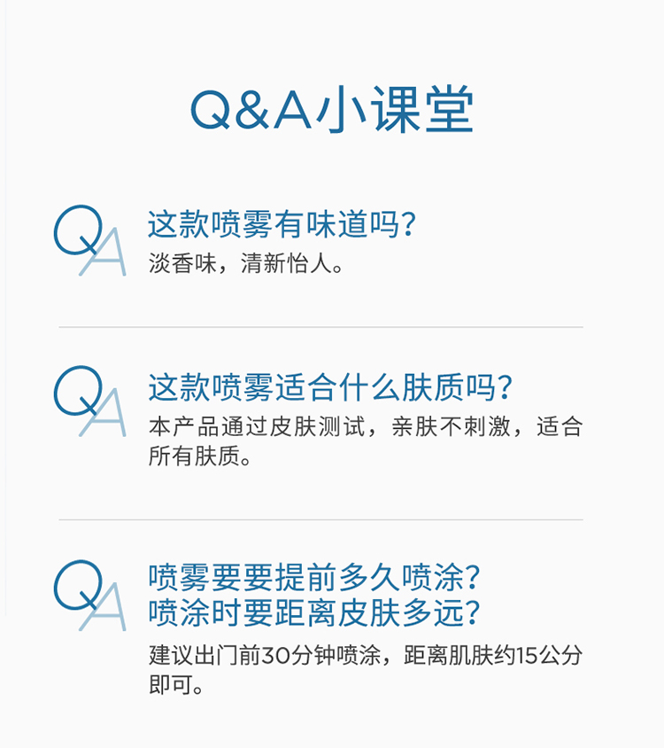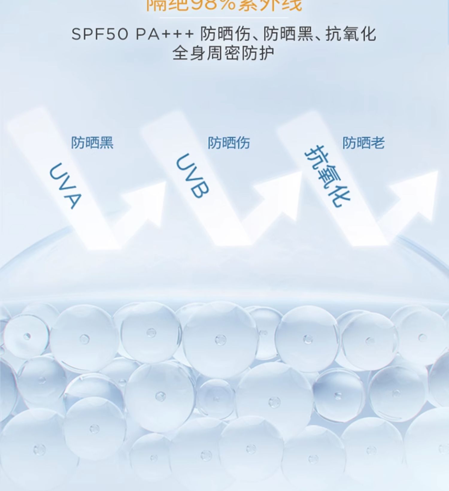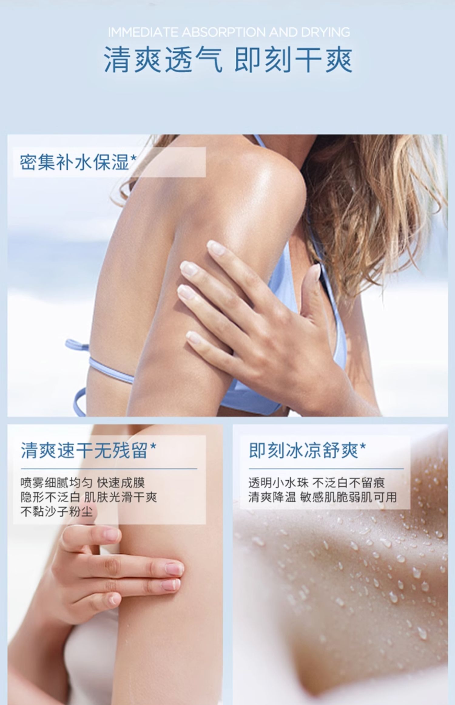 滋润降温,有直接降温镇静功效,快速成膜,随手一喷即成膜,高倍耐晒,全天候有效防护,轻薄透气,小分子喷雾更轻薄。