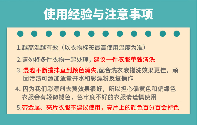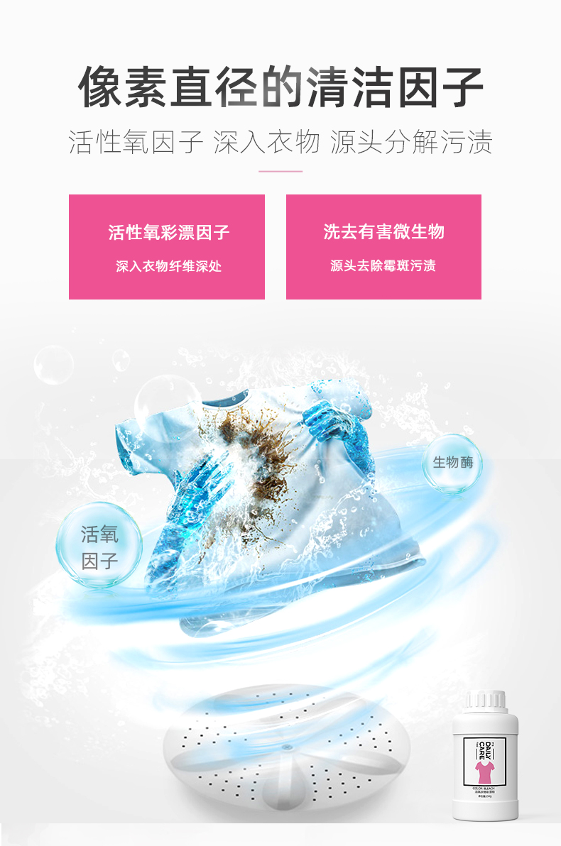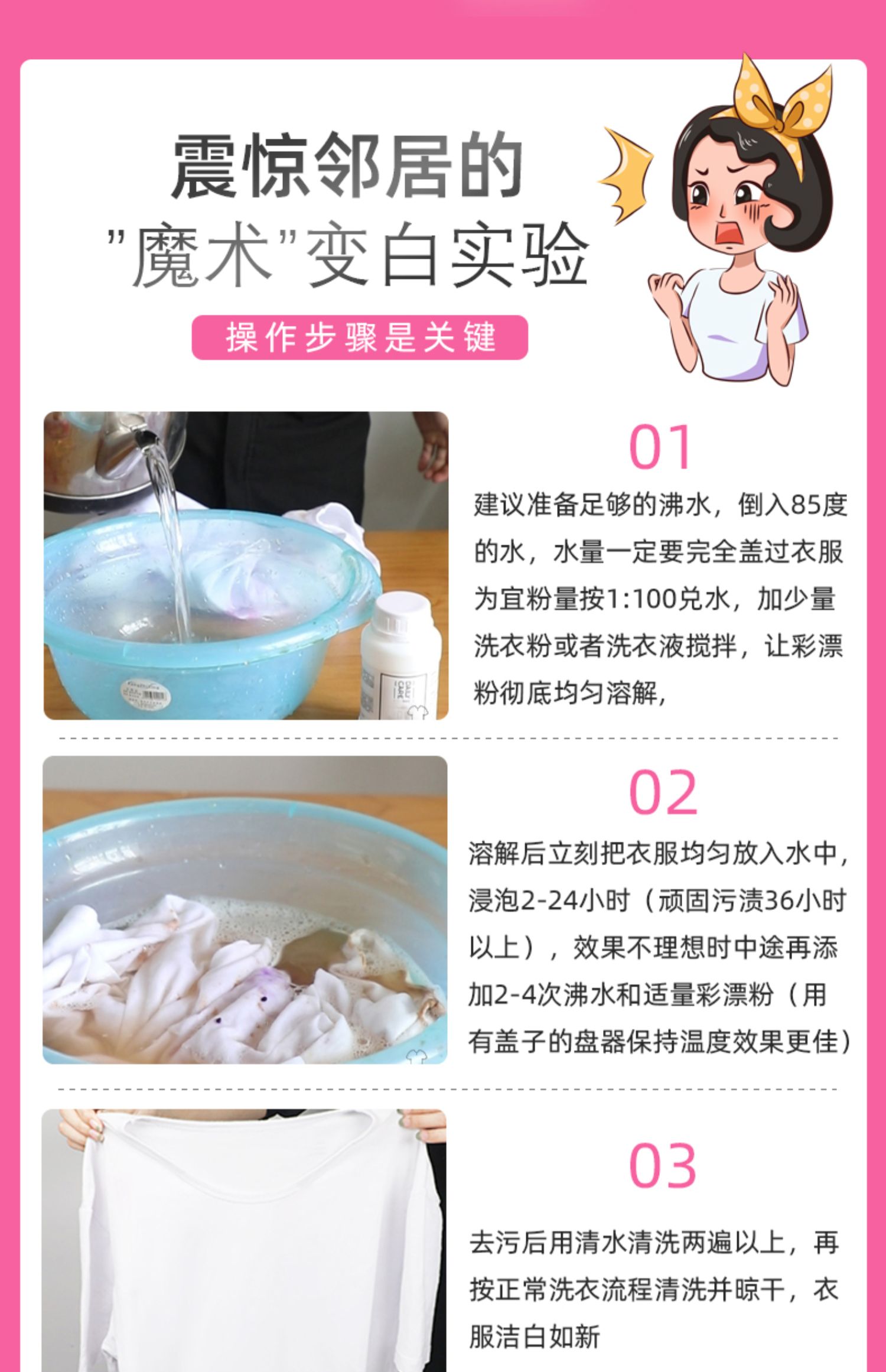 活氧彩漂粉,去污增白去色洗衣专用彩漂剂,不伤衣物不伤手,不含荧光剂,活性氧彩漂因子,解决各种污渍问题!有了它,每天穿新衣!