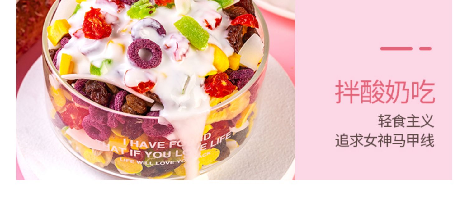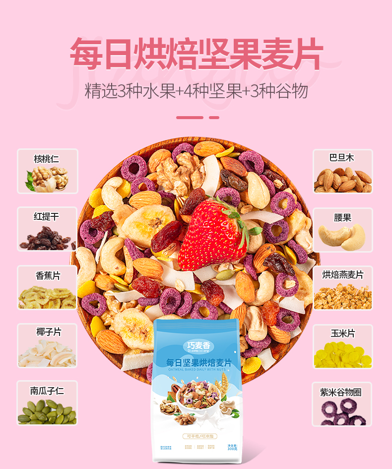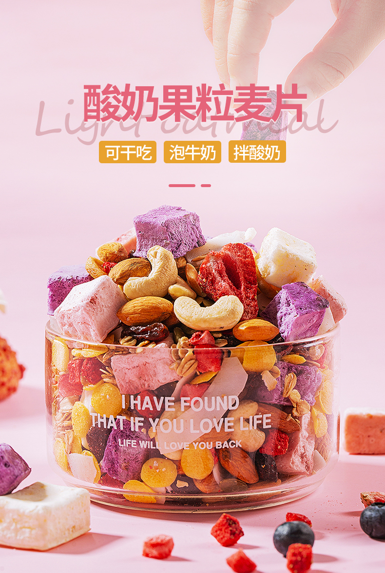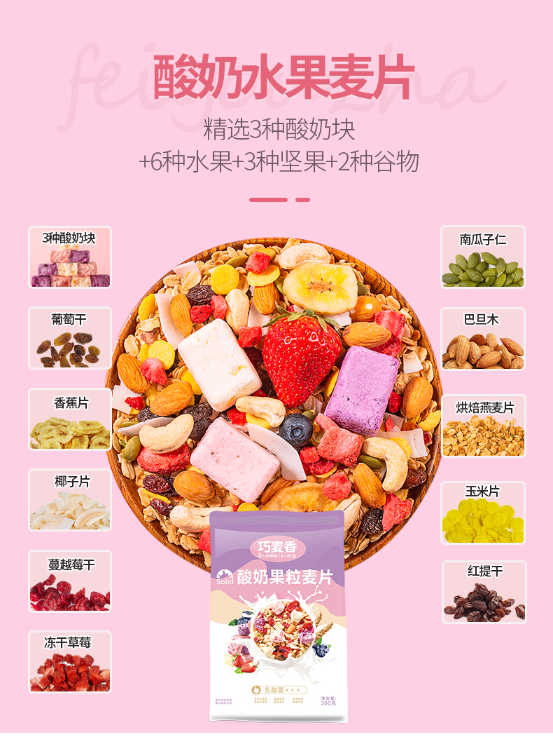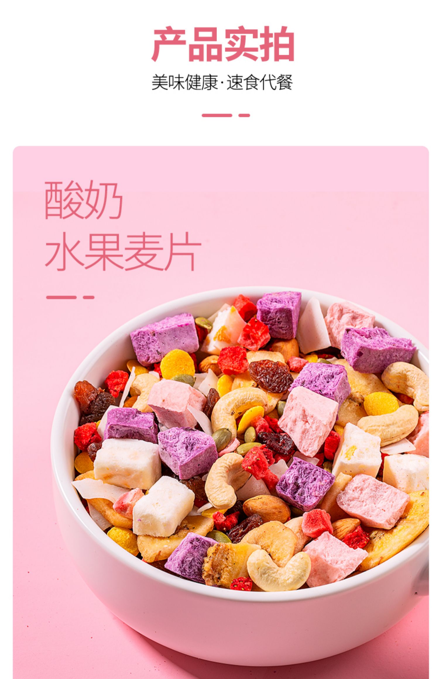 即食代餐果粒麦片,非膨化更健康~大块酸奶果粒,嚼着干吃香脆,泡牛奶、酸奶也可以!精选十几种天然食材,科学营养配比,一分钟搞定早餐,好吃饱腹不怕胖~