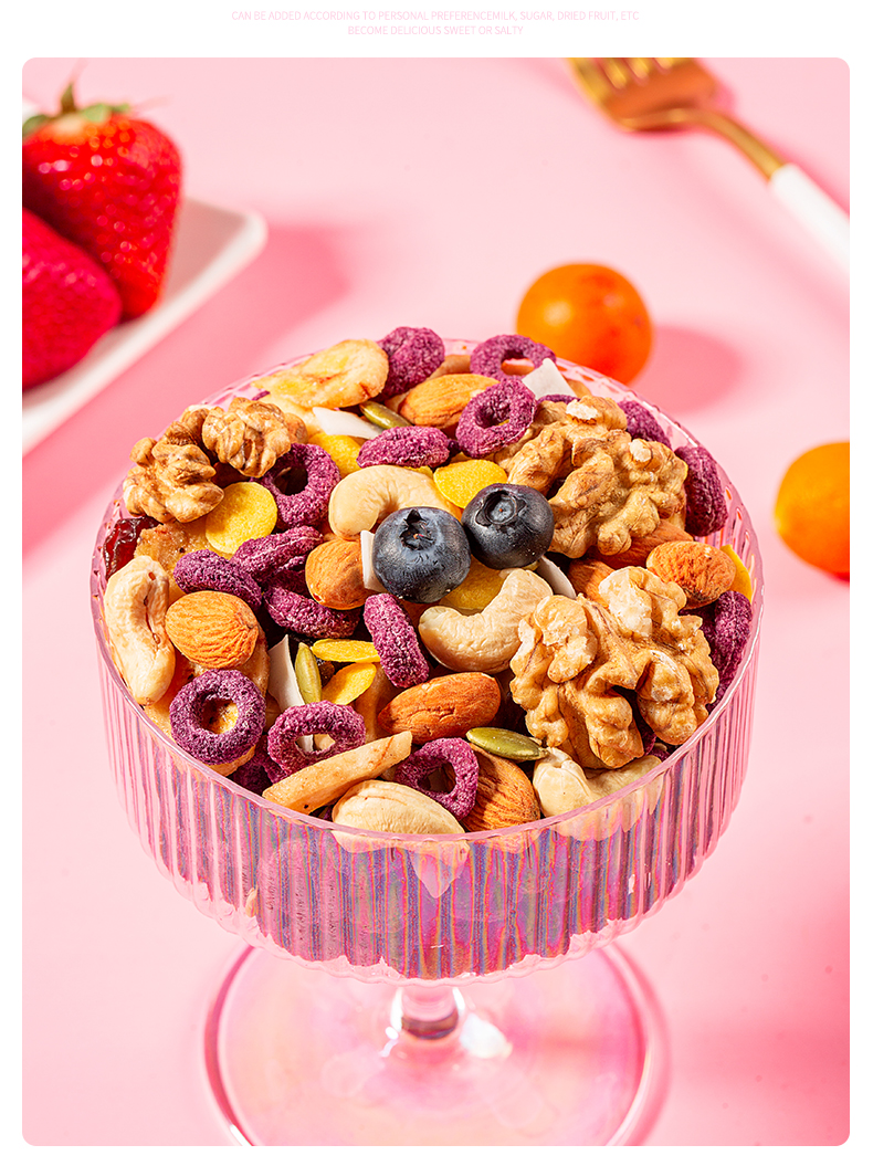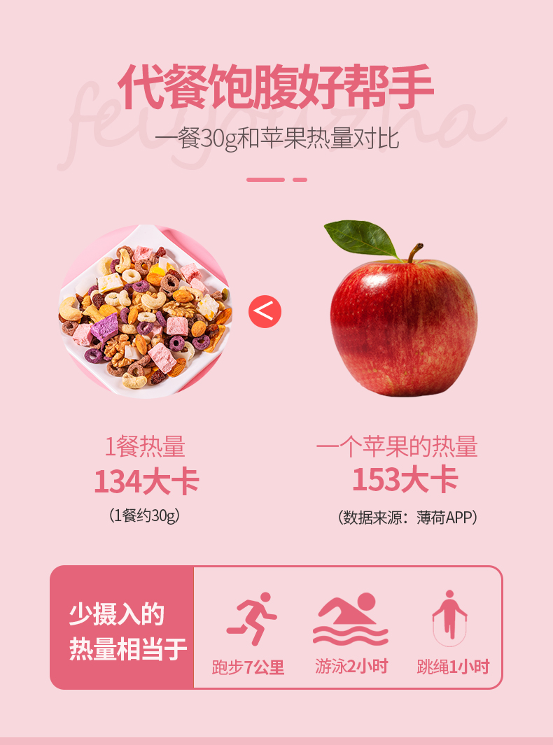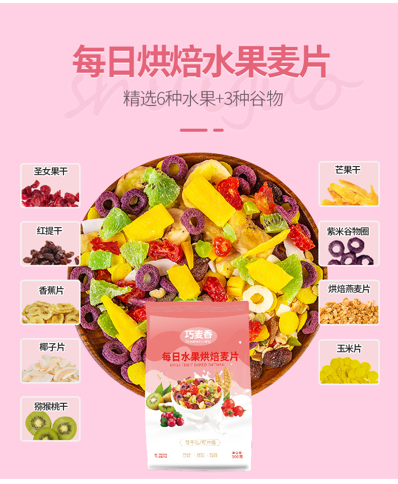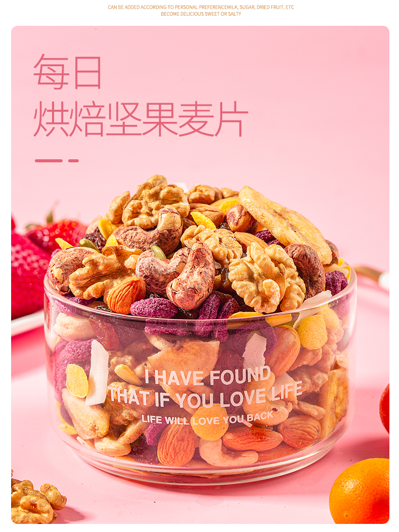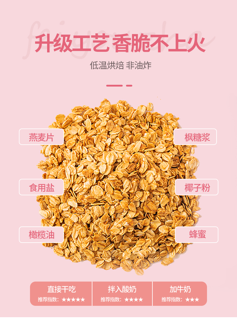 即食代餐果粒麦片,非膨化更健康~大块酸奶果粒,嚼着干吃香脆,泡牛奶、酸奶也可以!精选十几种天然食材,科学营养配比,一分钟搞定早餐,好吃饱腹不怕胖~